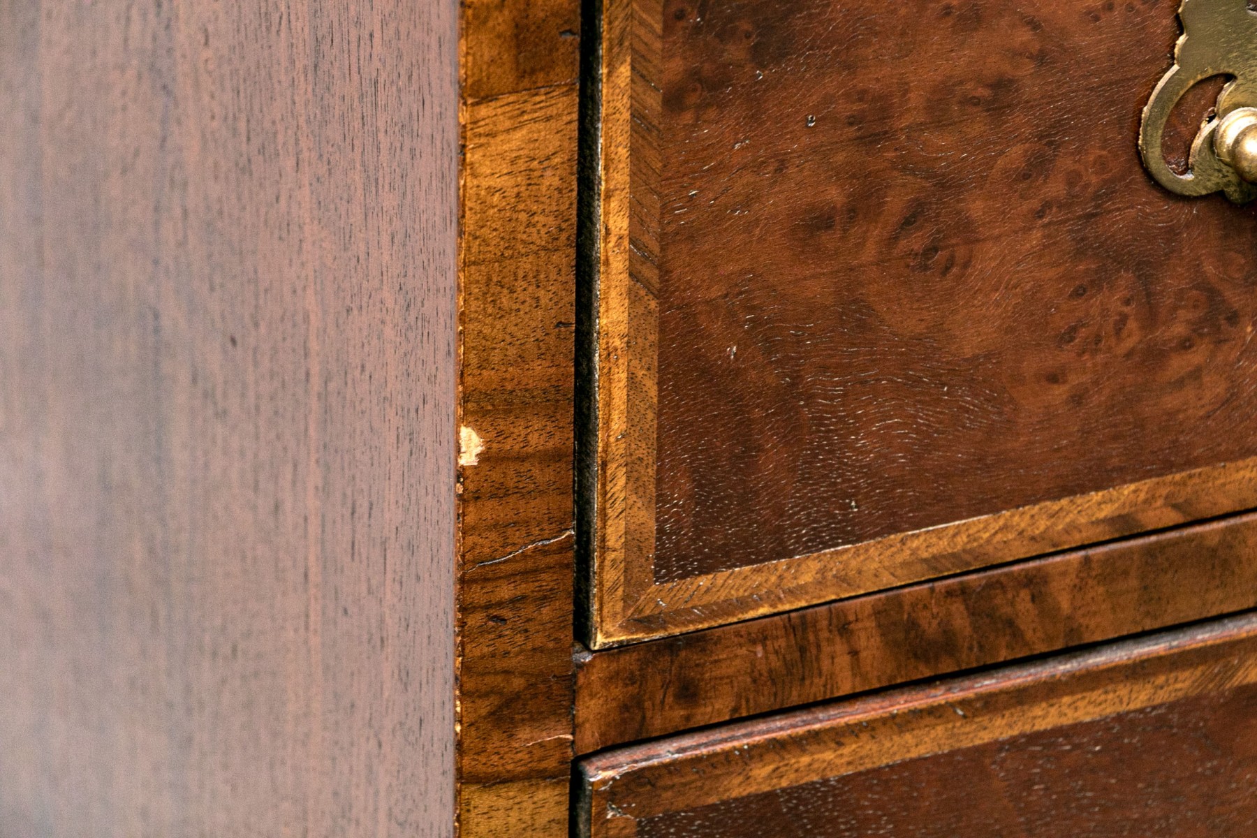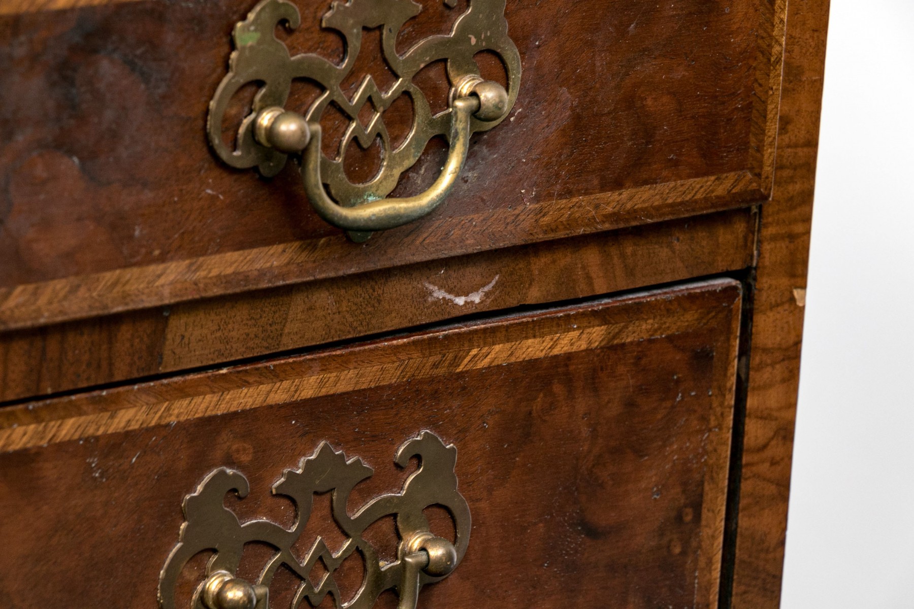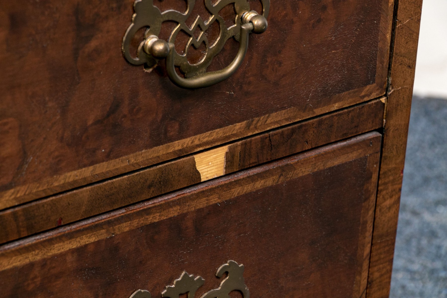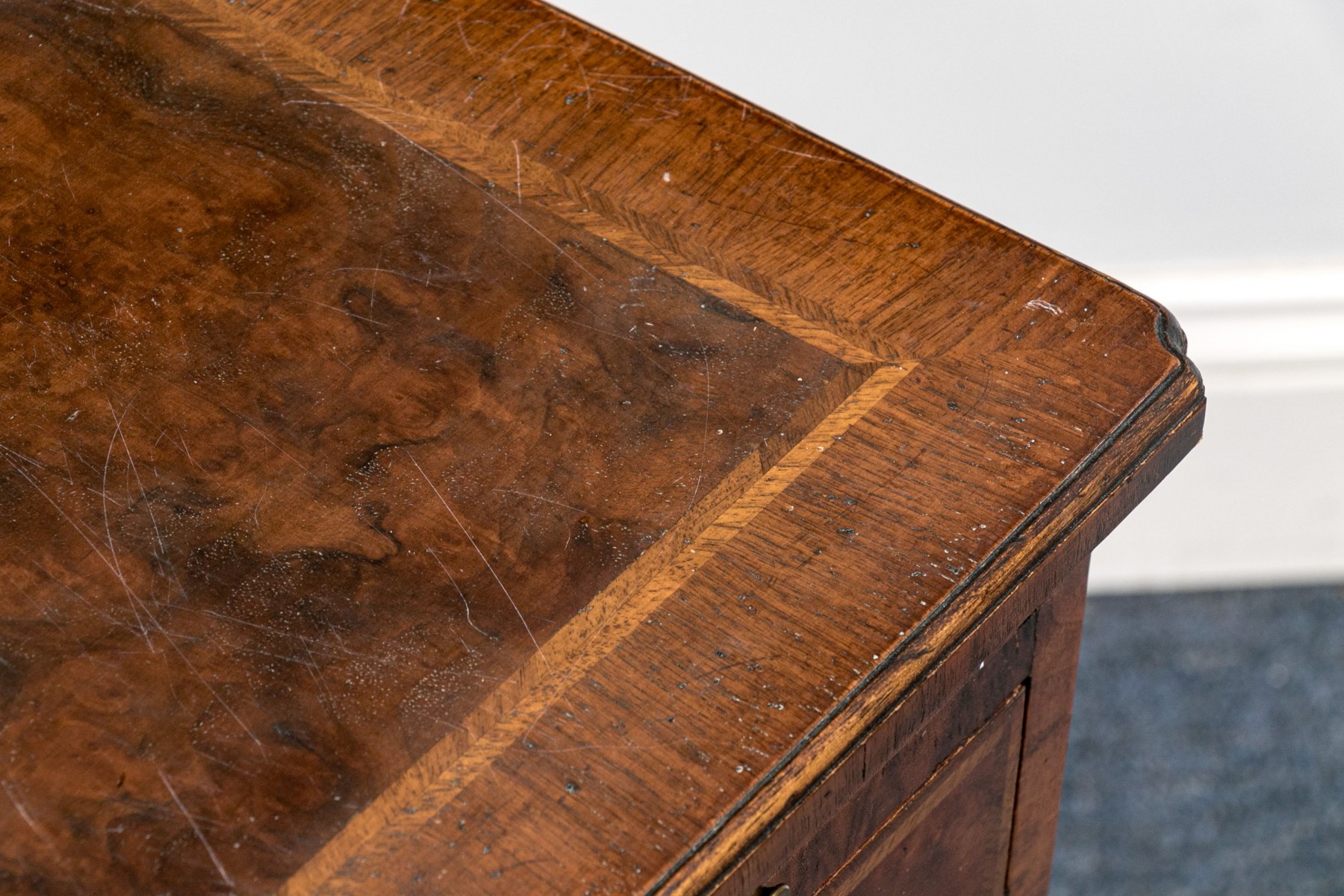 Condition: Listed as a restoration item due to some wear and losses to the veneered finish which can be seen in the lot images and predominantly to the right trim and space between drawers. No keys present.