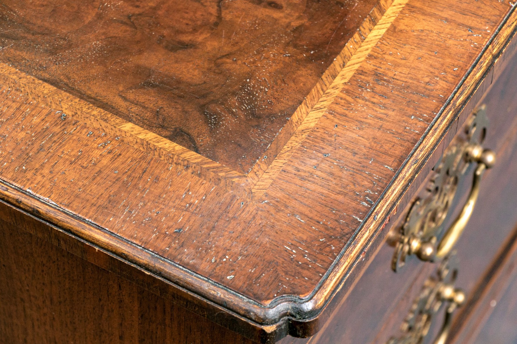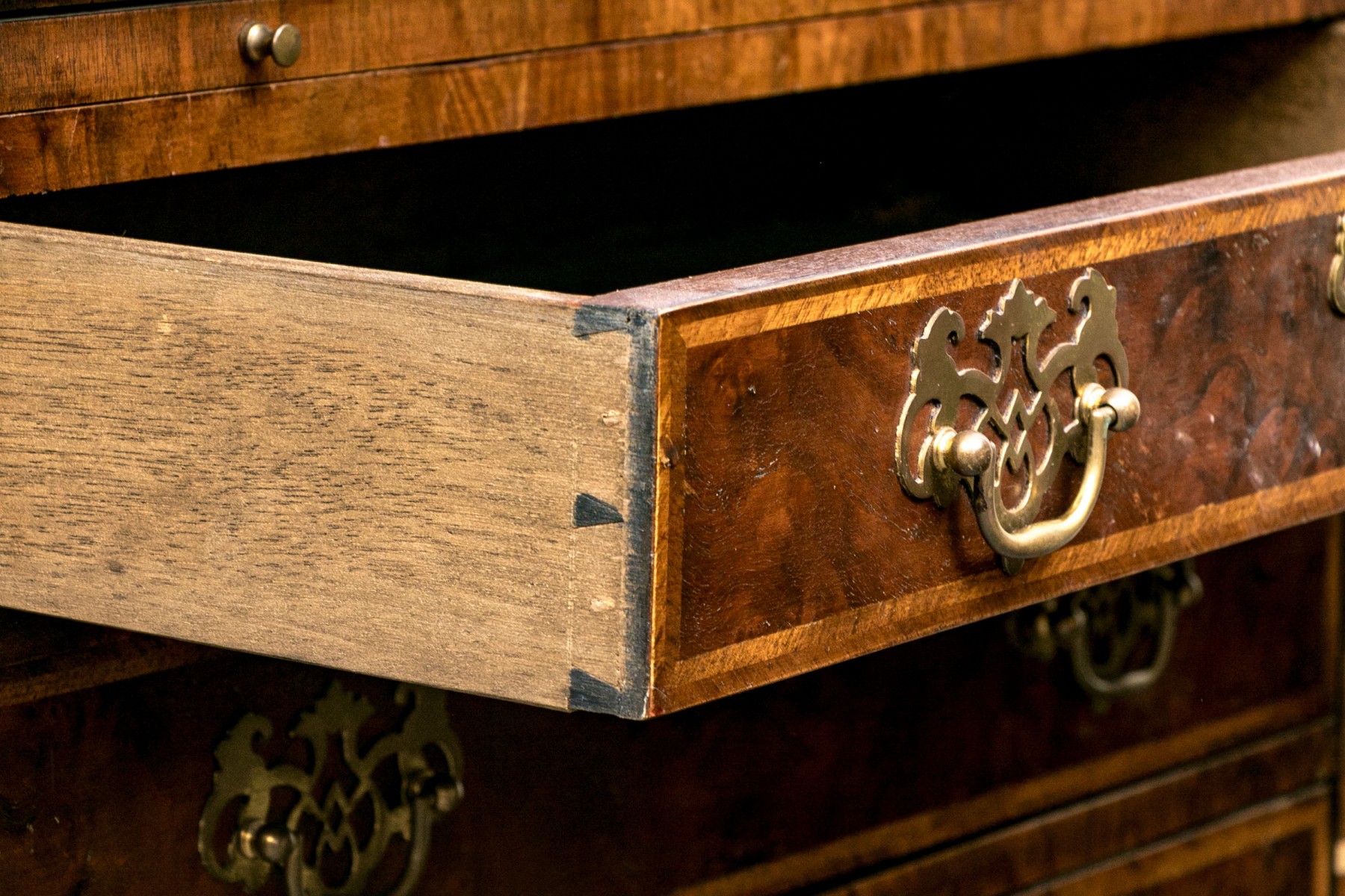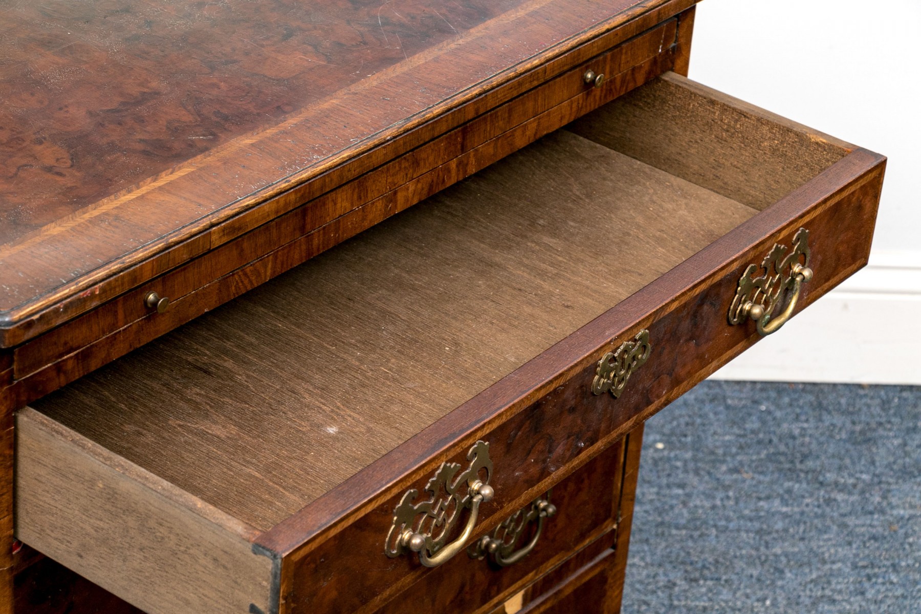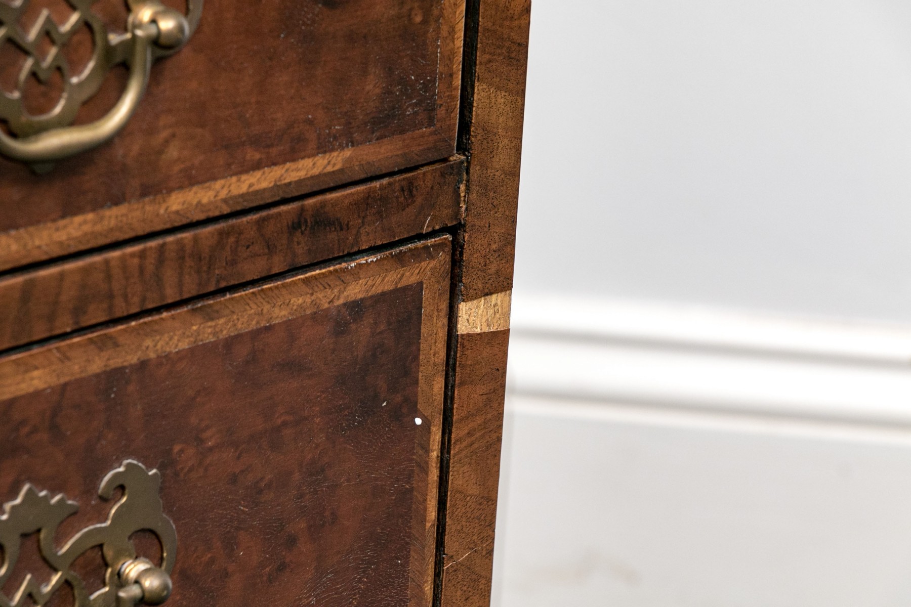 Condition: Listed as a restoration item due to some wear and losses to the veneered finish which can be seen in the lot images and predominantly to the right trim and space between drawers. No keys present.