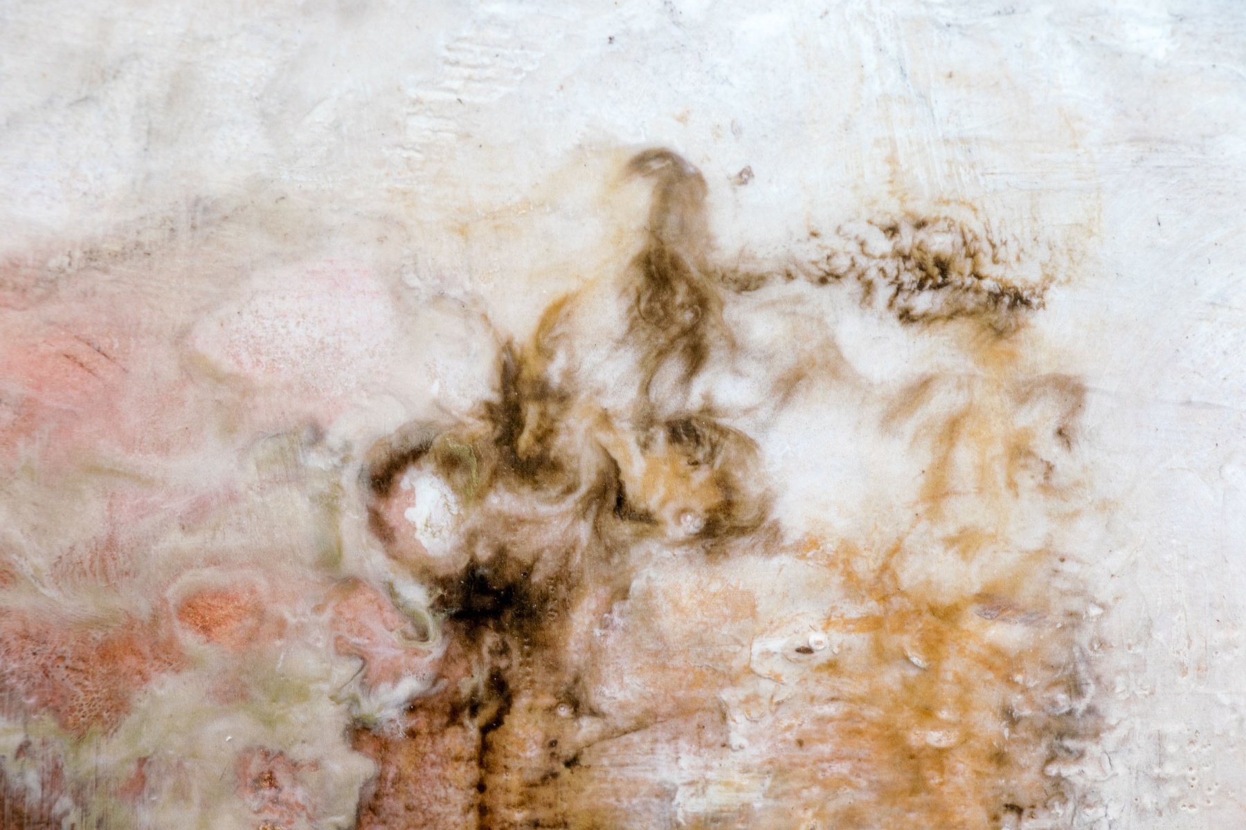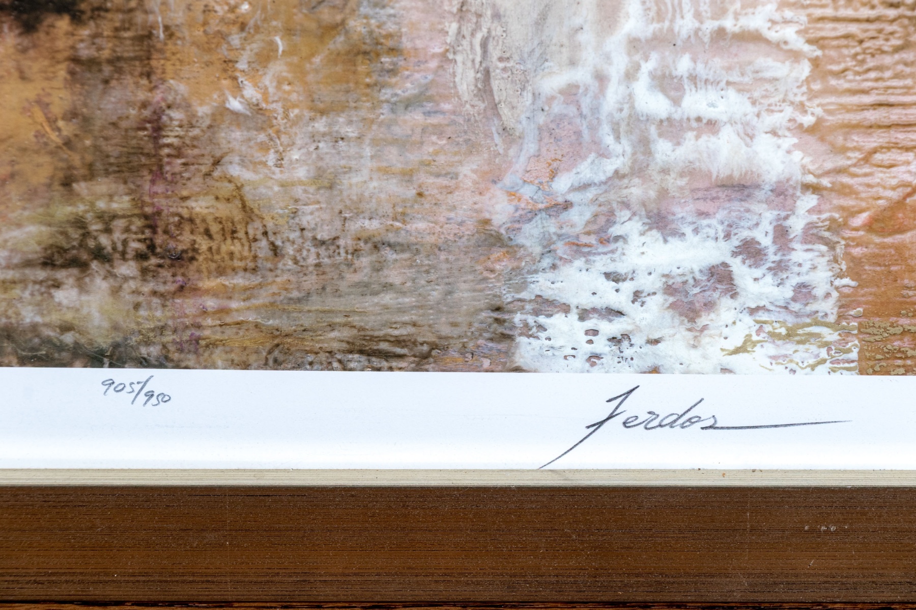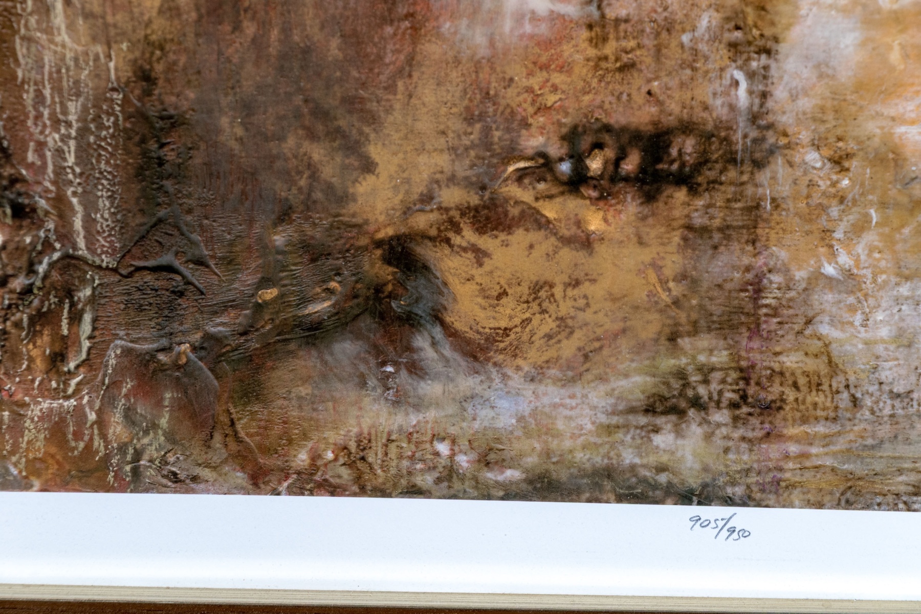 Ferdos Maleki (Iranian-American, 20th C.) "Walk With Me II" print depicting an abstract composition of textural earth tones rising up to a white and blue ground. Pencil signed and numbered 905/950 below the margin.