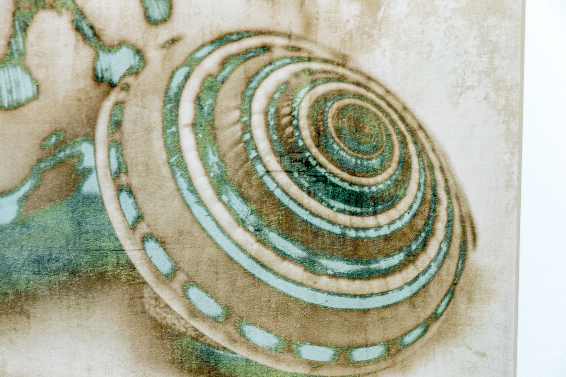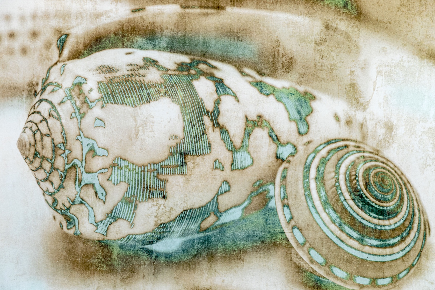 John Seba (Argentine-American, 20th C.) "Coastal Gems I" print depicting seashells in cream and brown with pops of blue and green appearing to nearly glow with vibrance from an antiqued atmosphere.