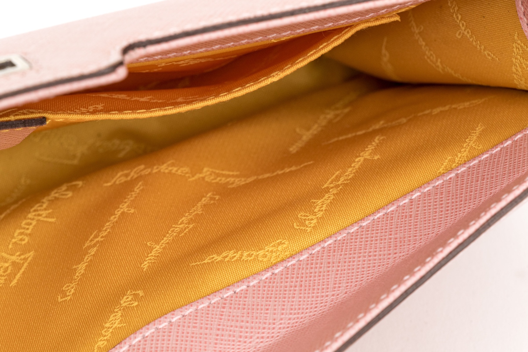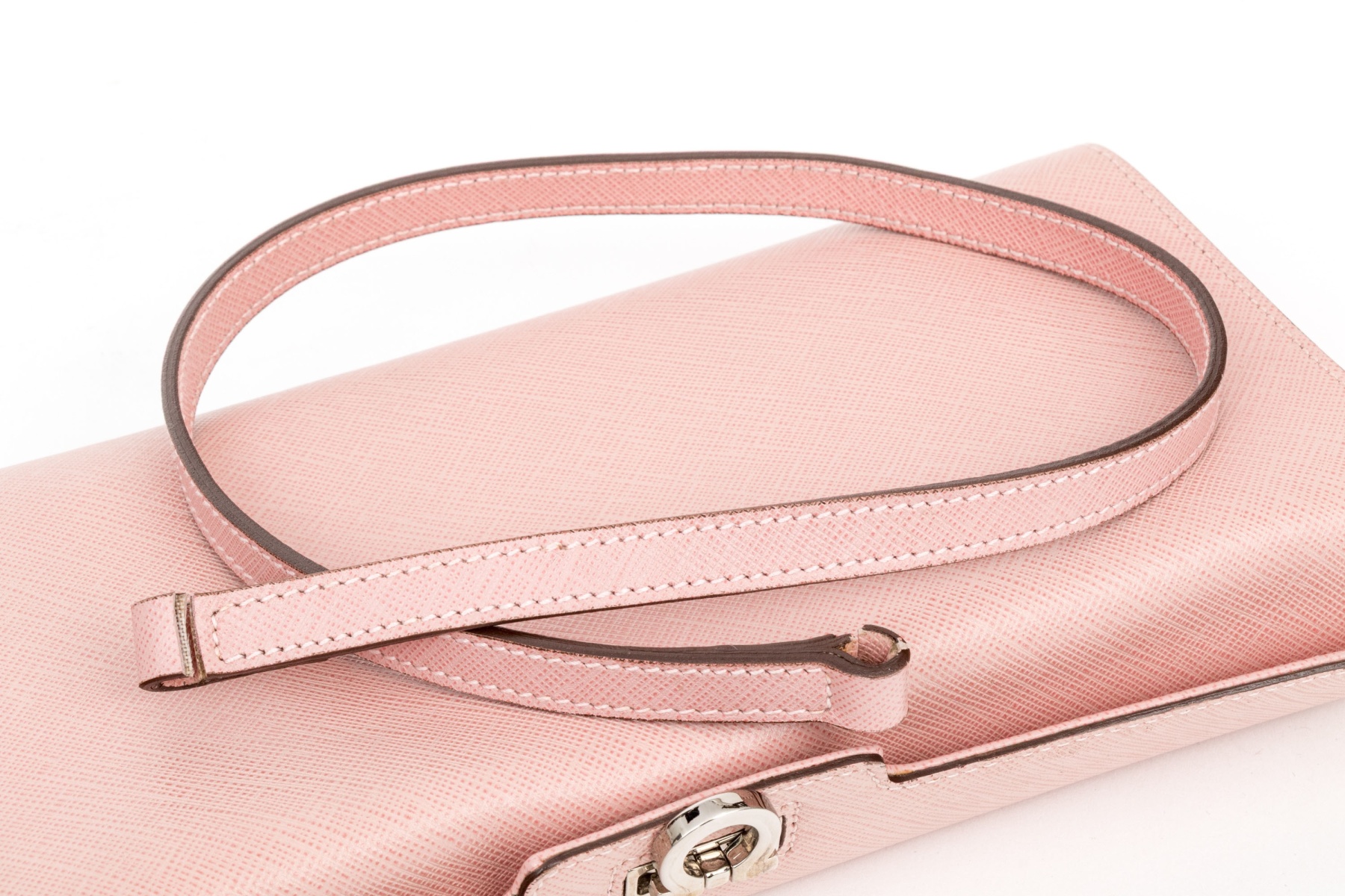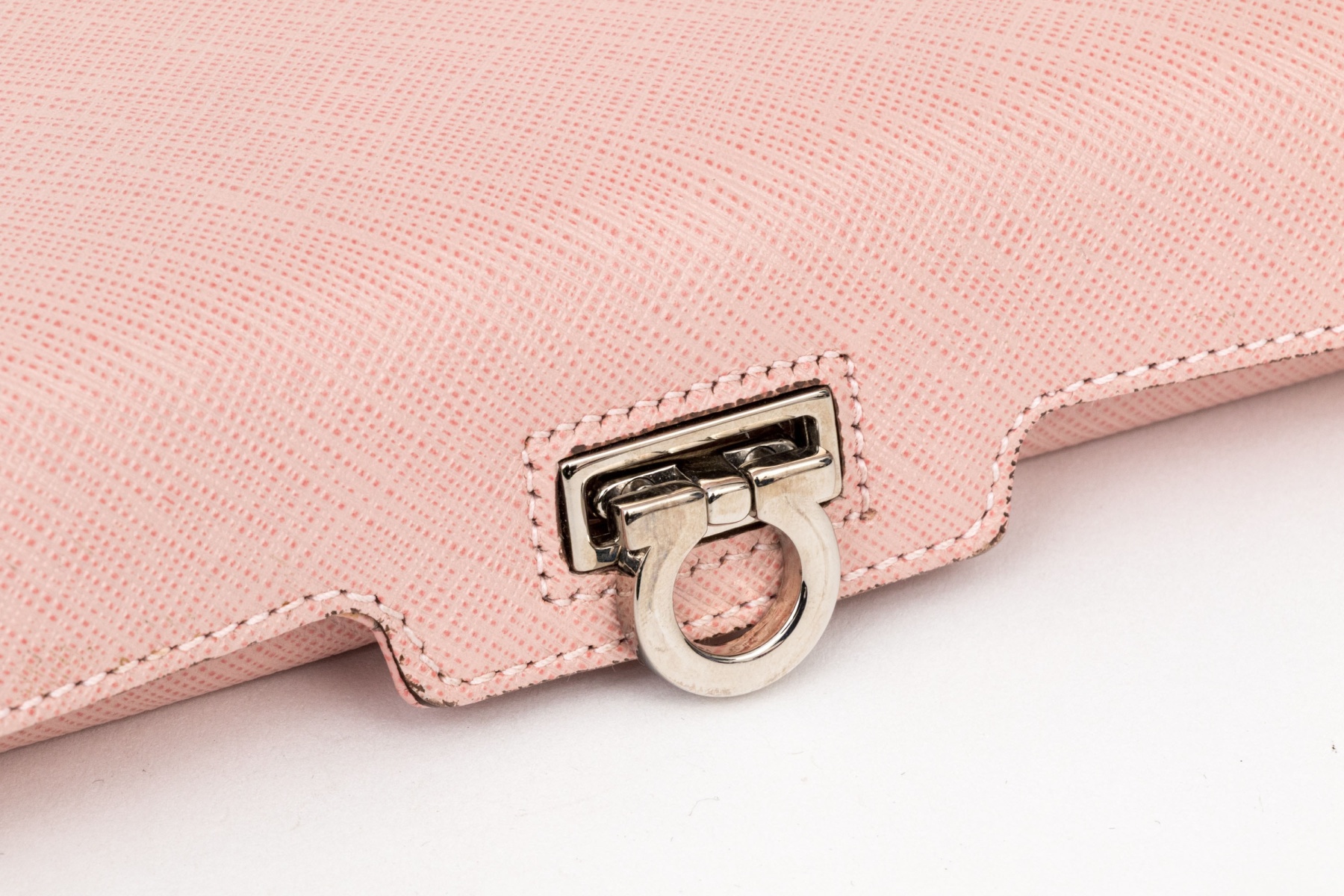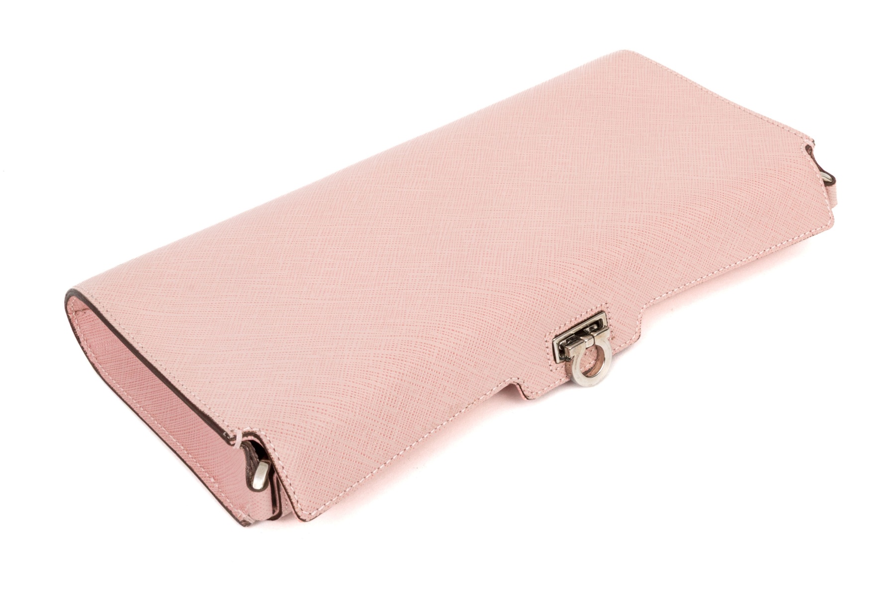 Ferragamo pink saffiano leather baguette clutch. This lovely bag features a Garanci flip lock clasp, rectangular profile and pretty pink coloring