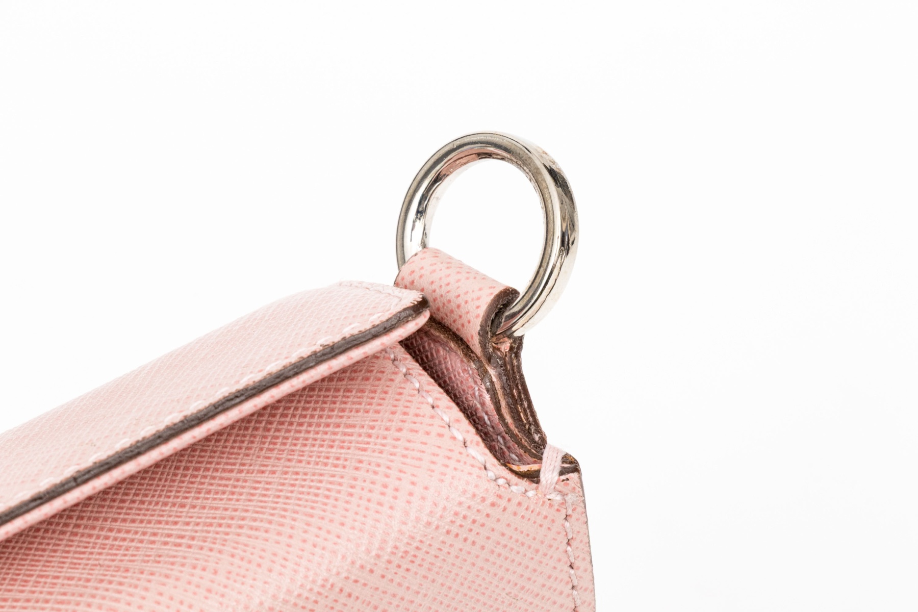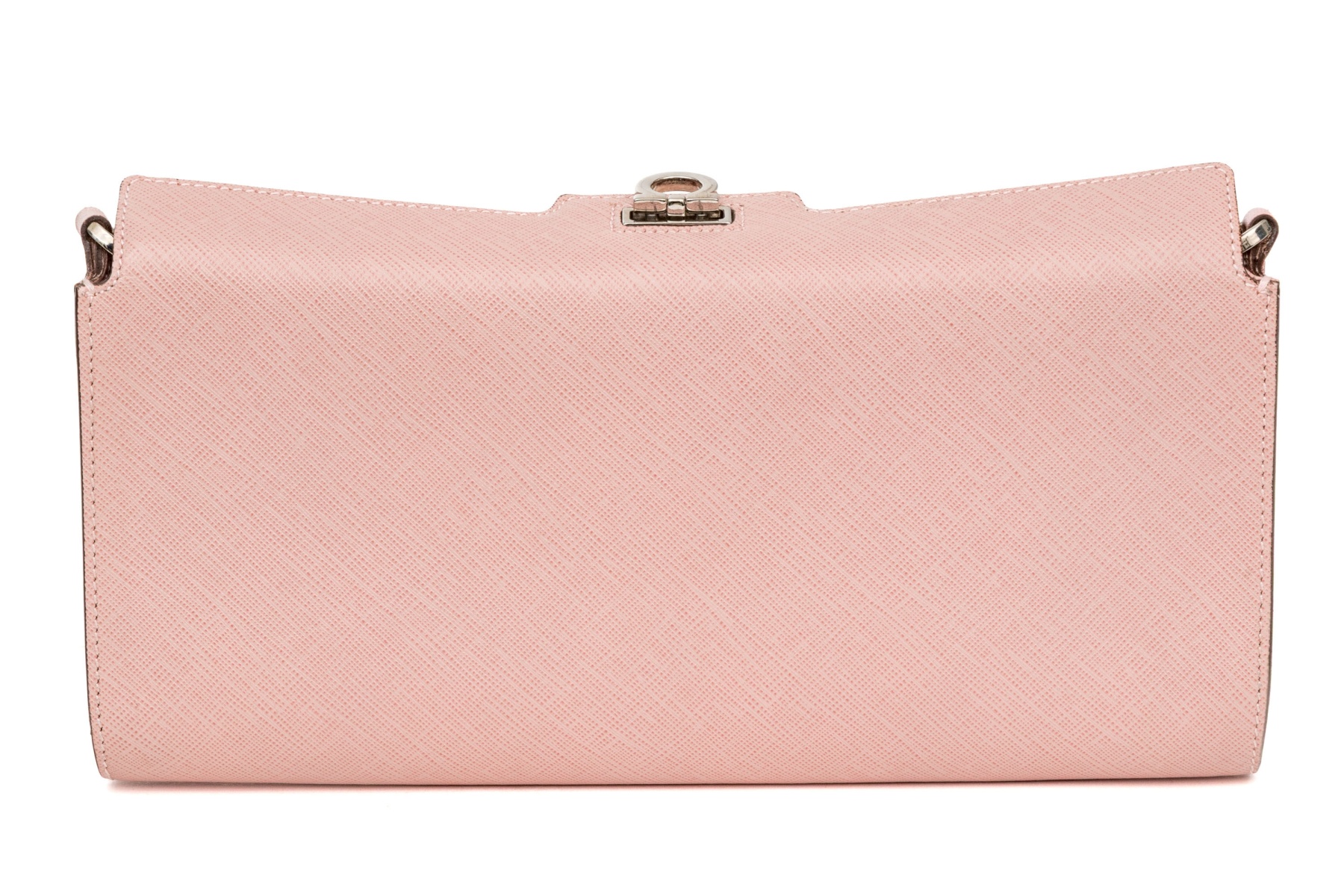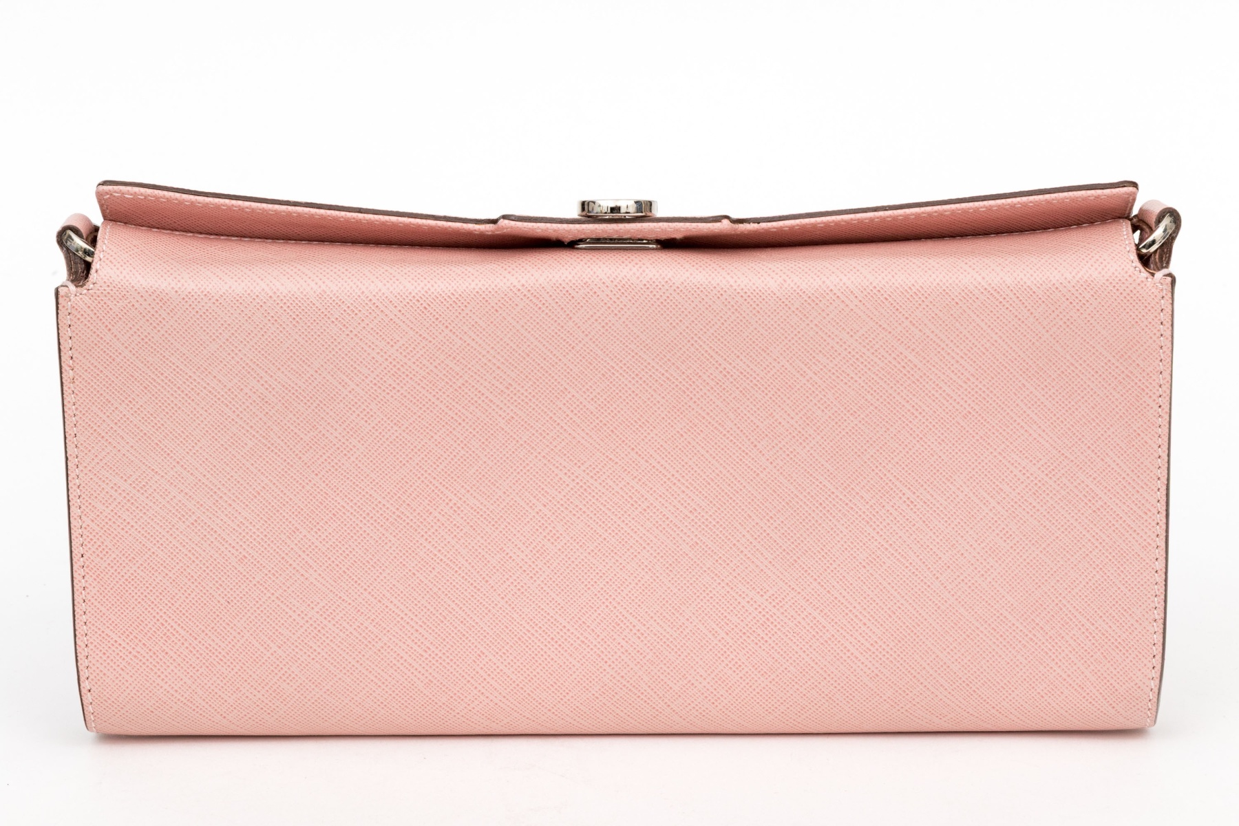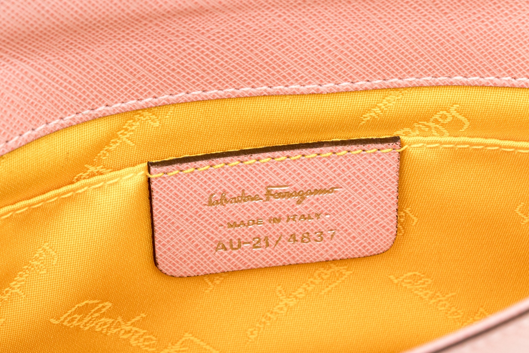 Ferragamo pink saffiano leather baguette clutch. This lovely bag features a Garanci flip lock clasp, rectangular profile and pretty pink coloring