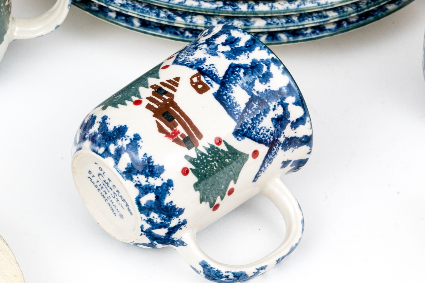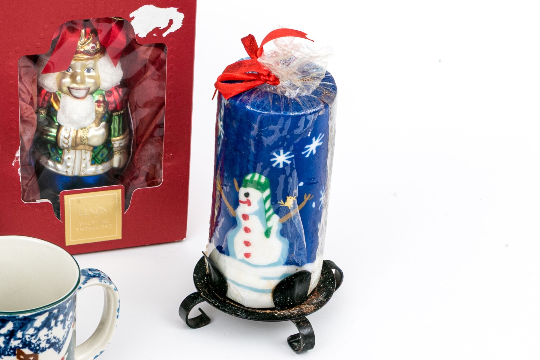 Comprised of set of four plates: 10 3/8” dia, 3 bowls, 3 salad plates, 2 mugs, 2 Christmas ornaments, Painted wood snowmen, a brass model of the Eiffel Tower, candle.