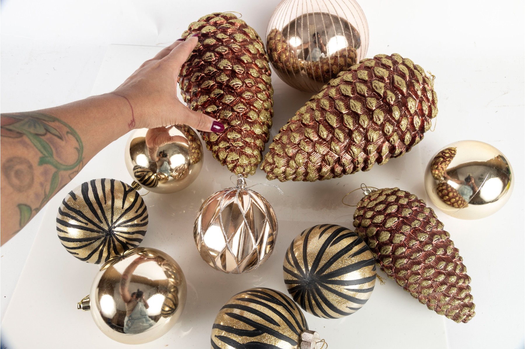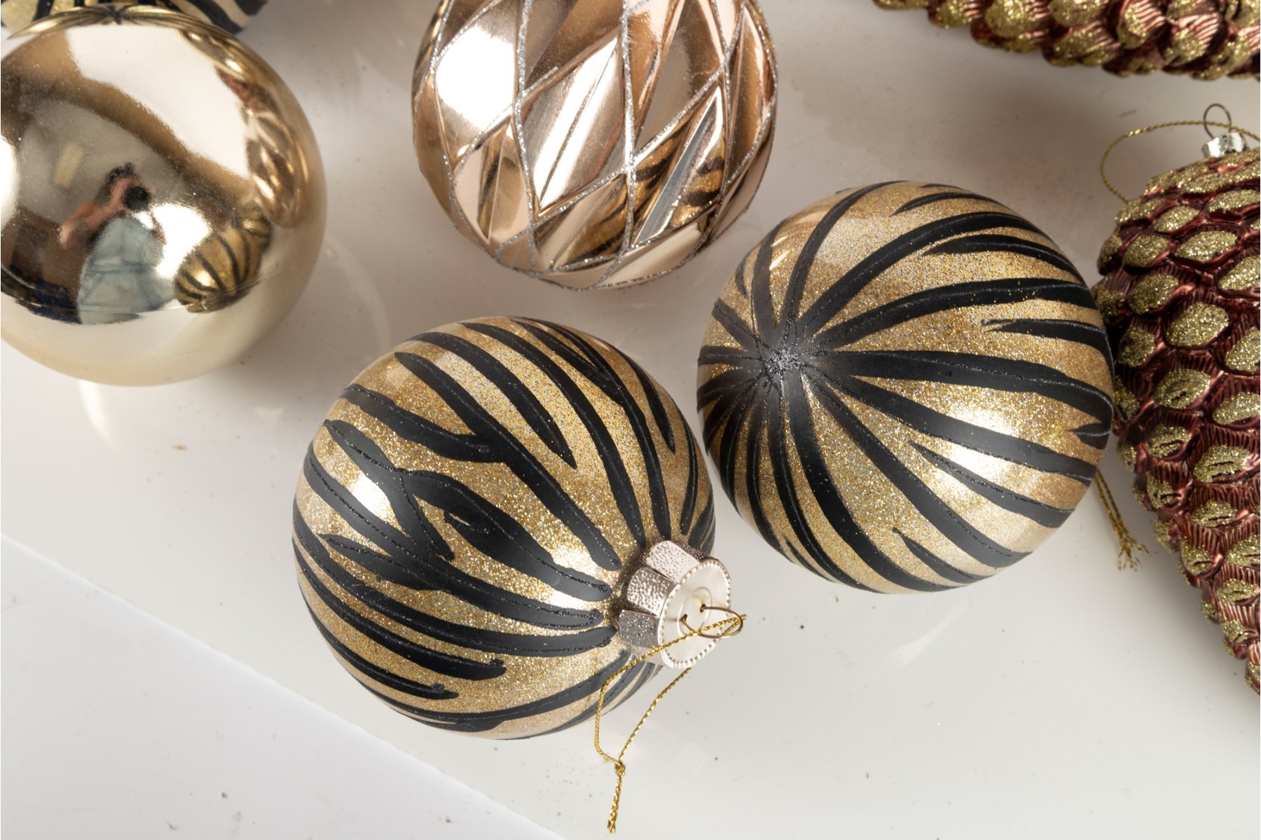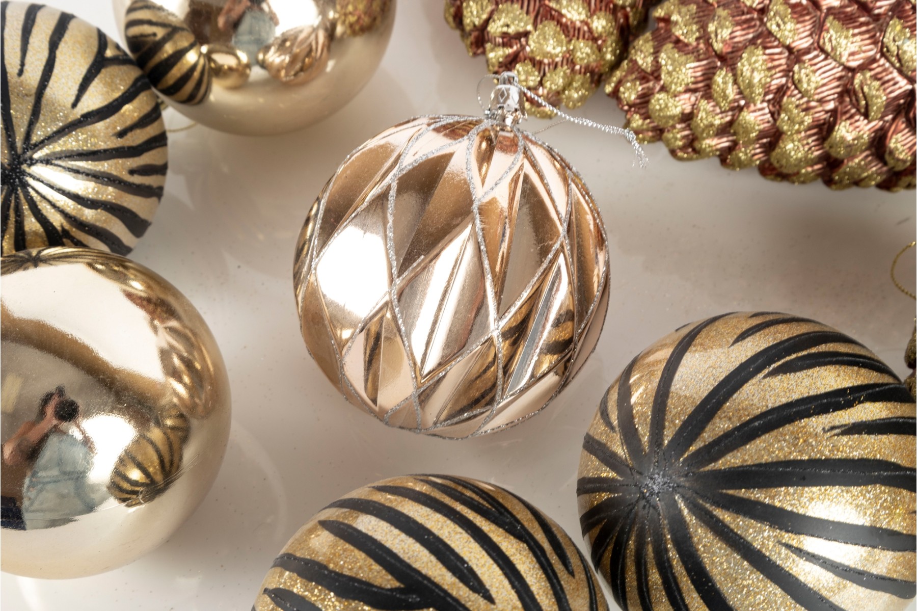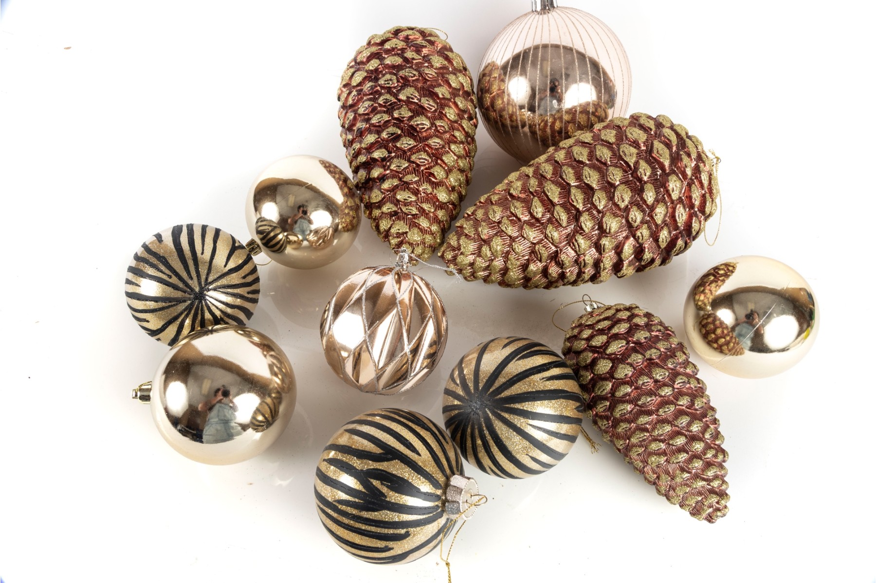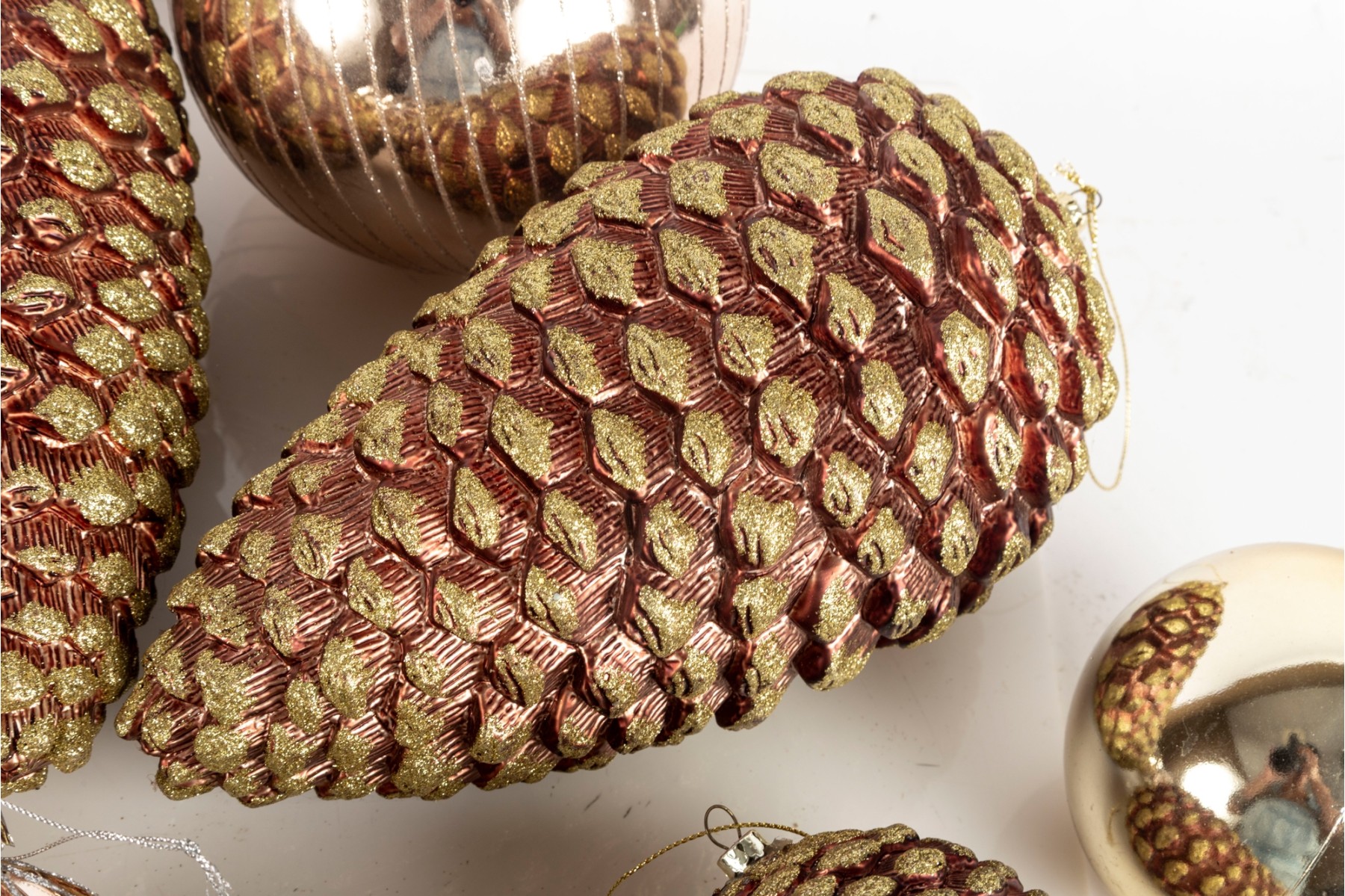 A festive collection of stylish gilt ornaments and three large pinecone form baubles.