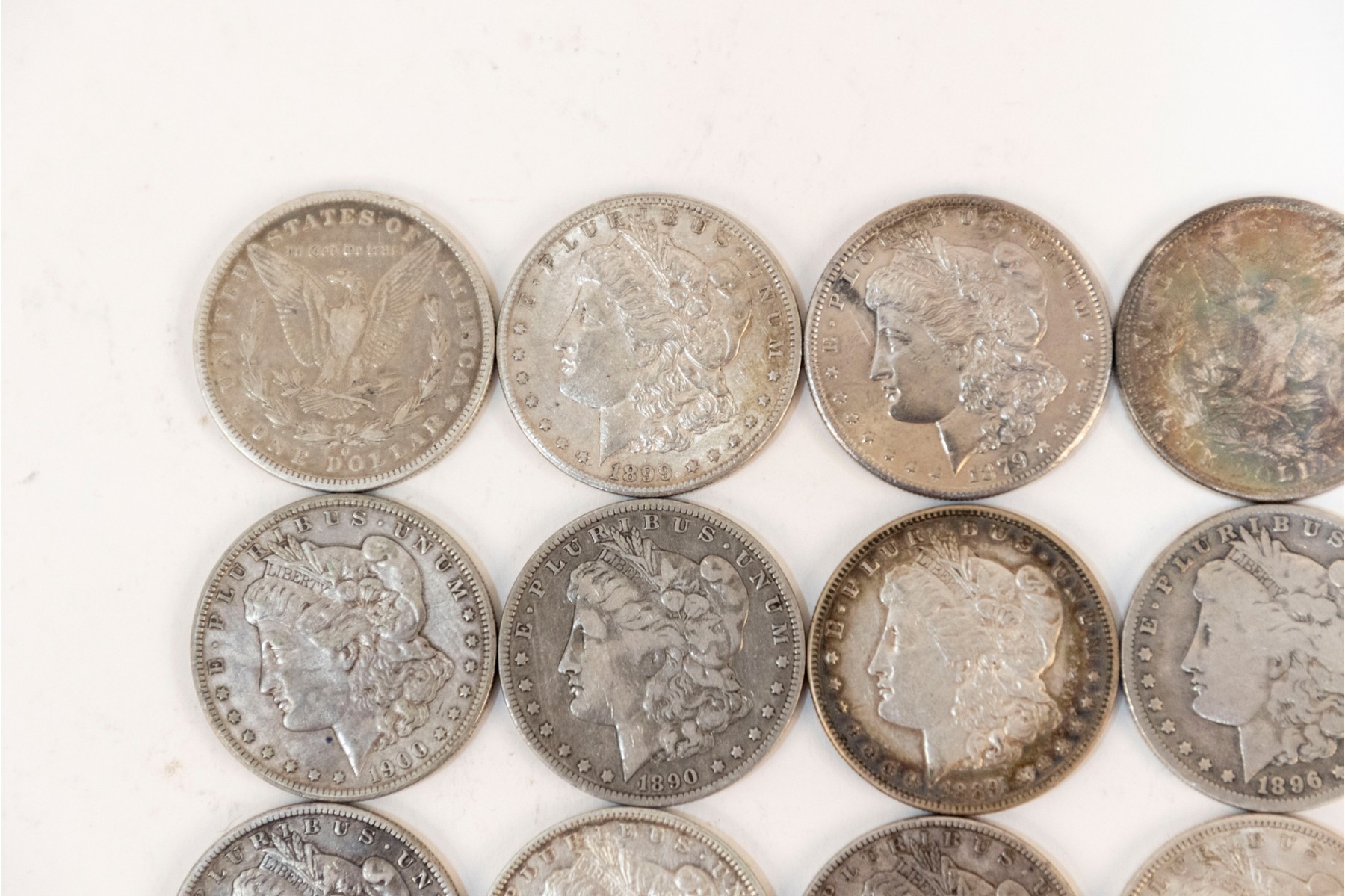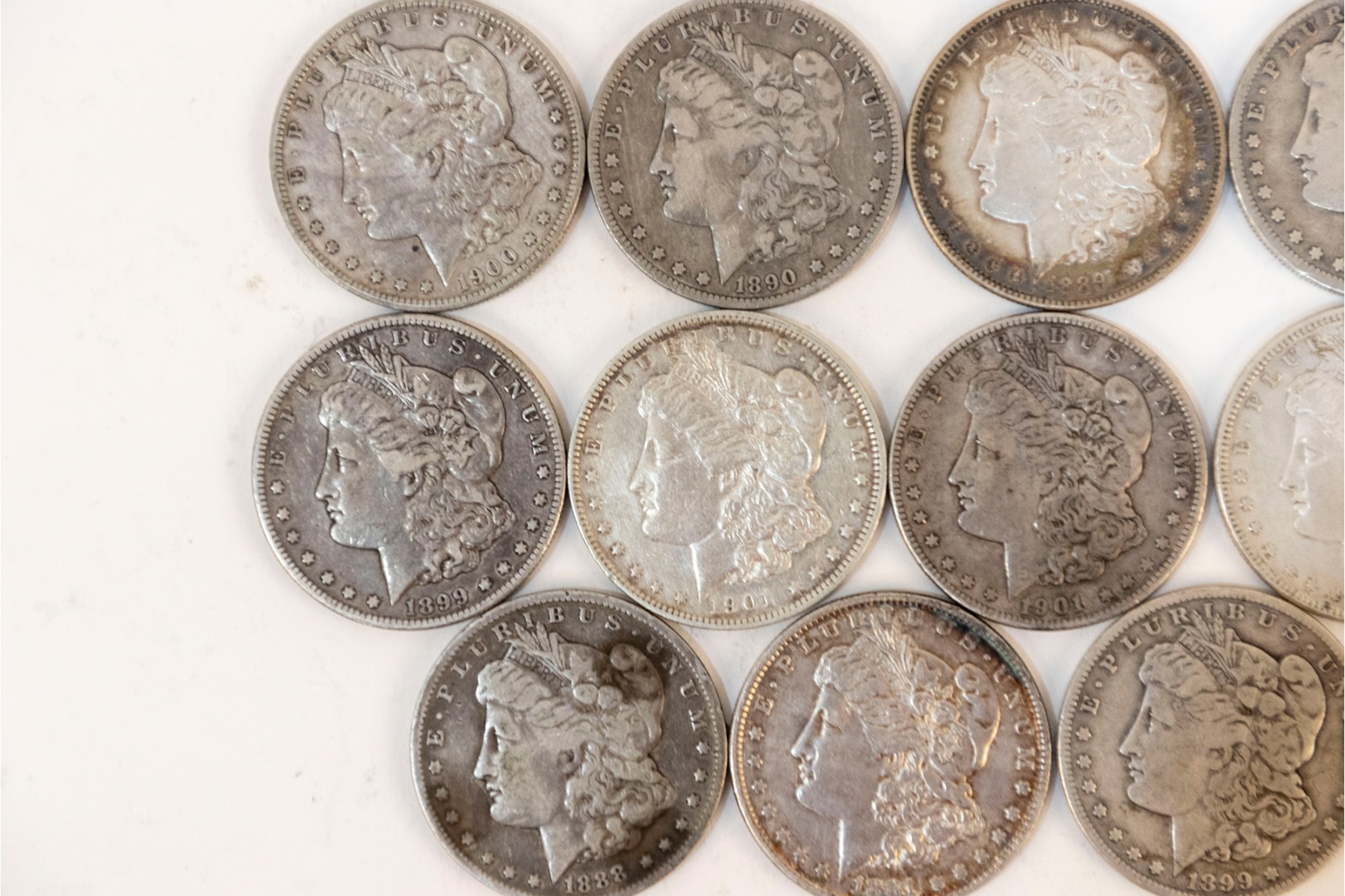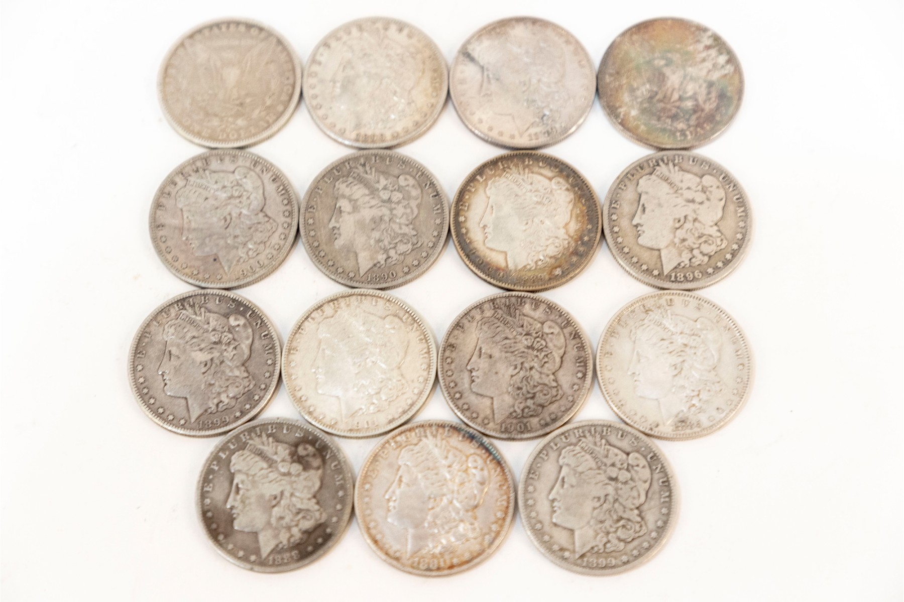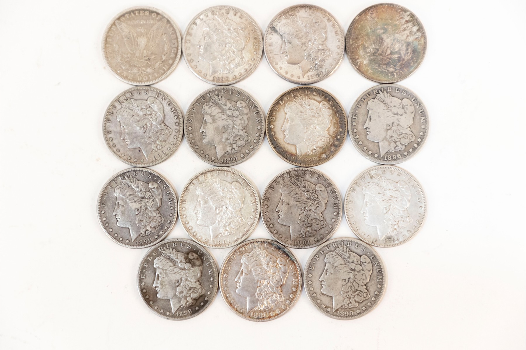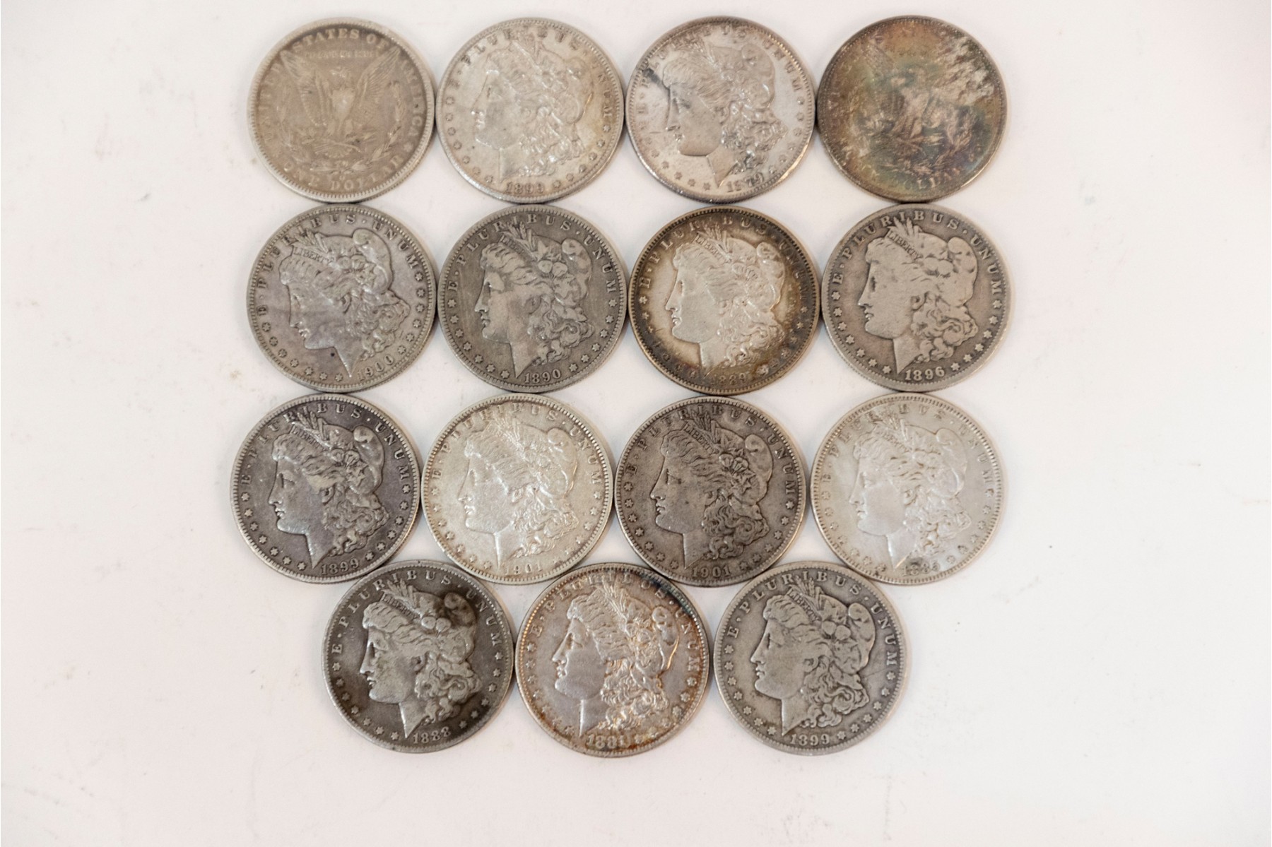 1881 - 1901 Morgan Silver Dollars which contain 412.5 Troy grains of 90% pure silver. Fifteen in total.