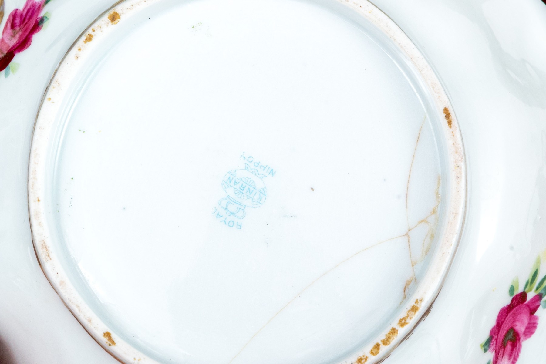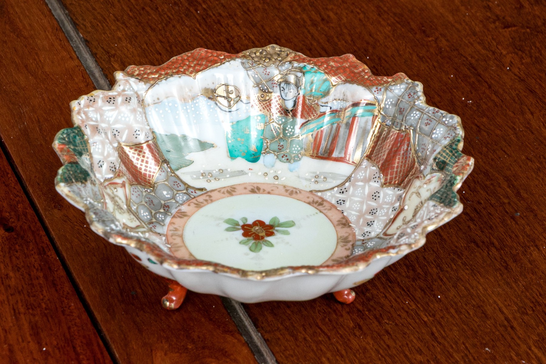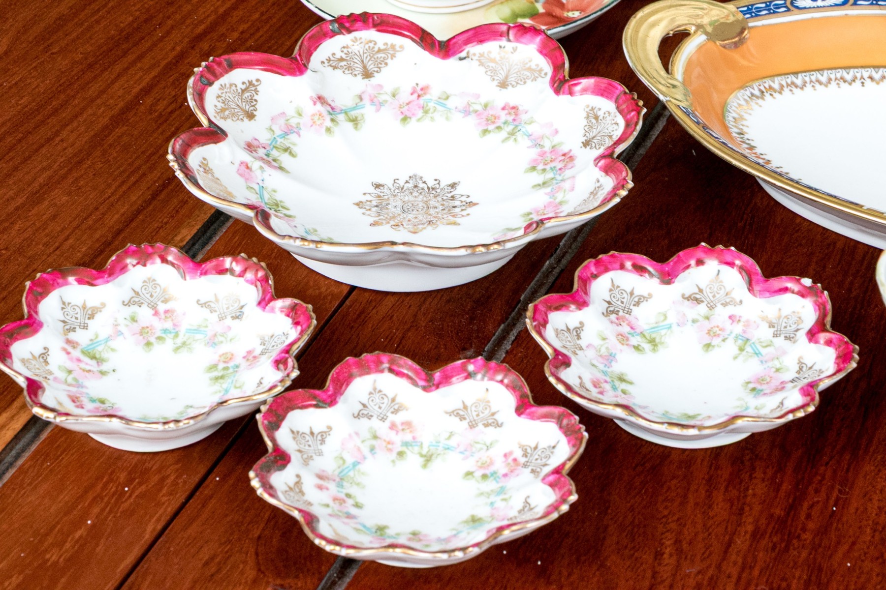 One of the three smaller red rimmed floriform bowls has a chip on the trim. The larger floriform bowl with hairline underfoot.