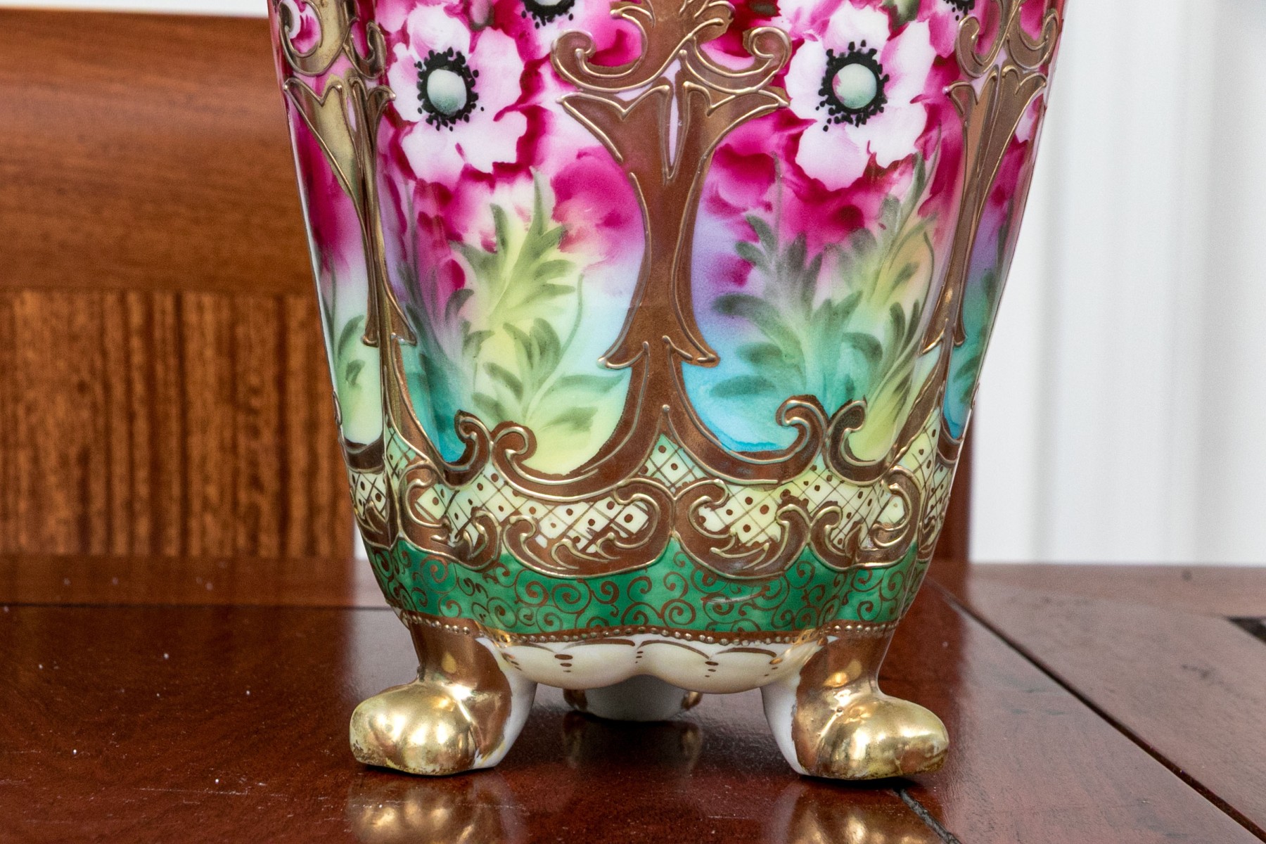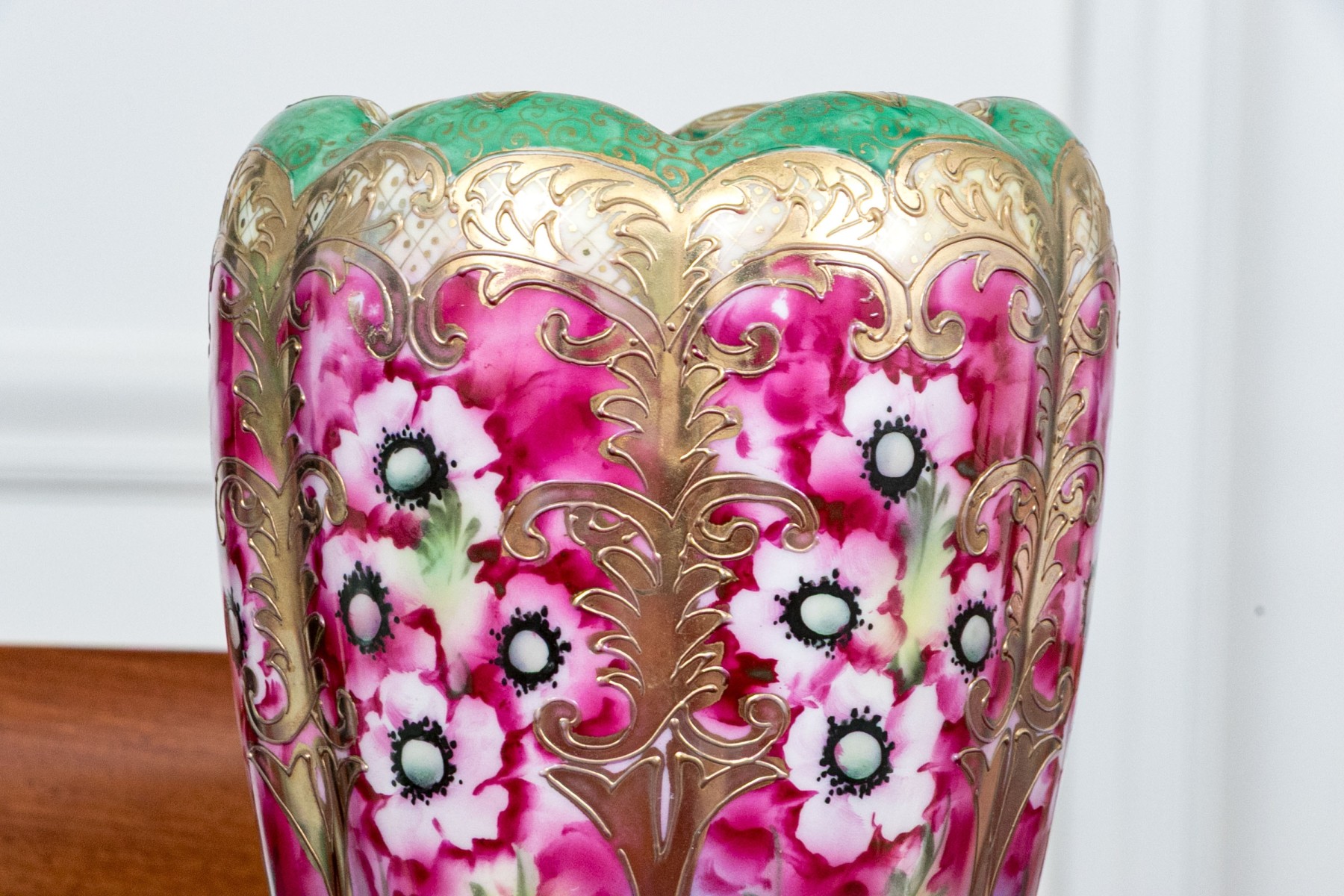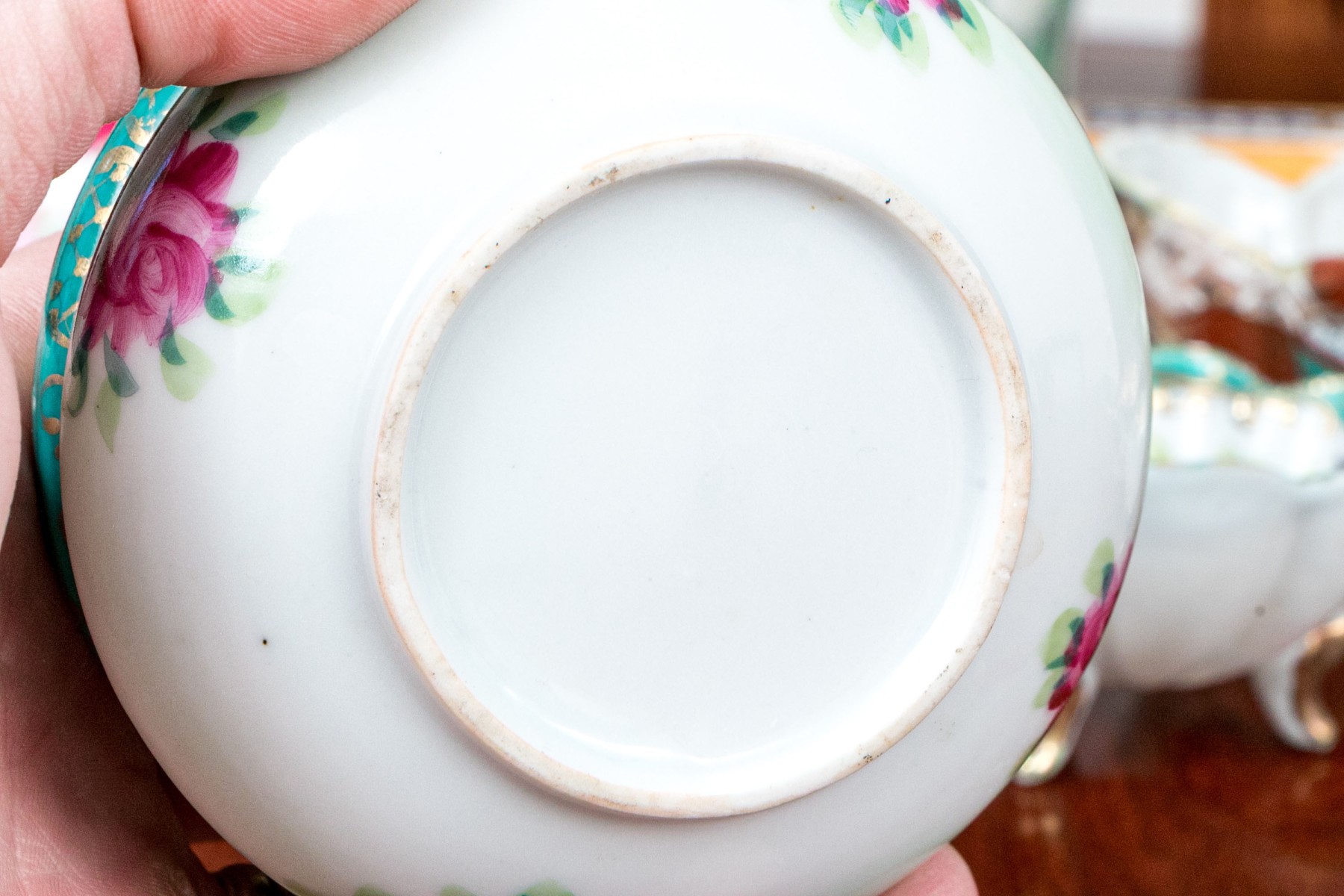 One of the three smaller red rimmed floriform bowls has a chip on the trim. The larger floriform bowl with hairline underfoot.