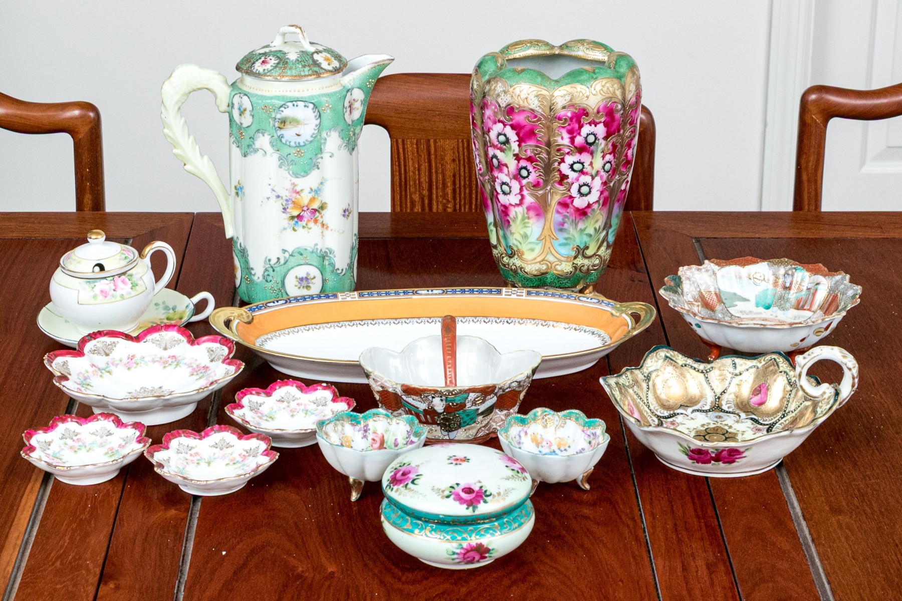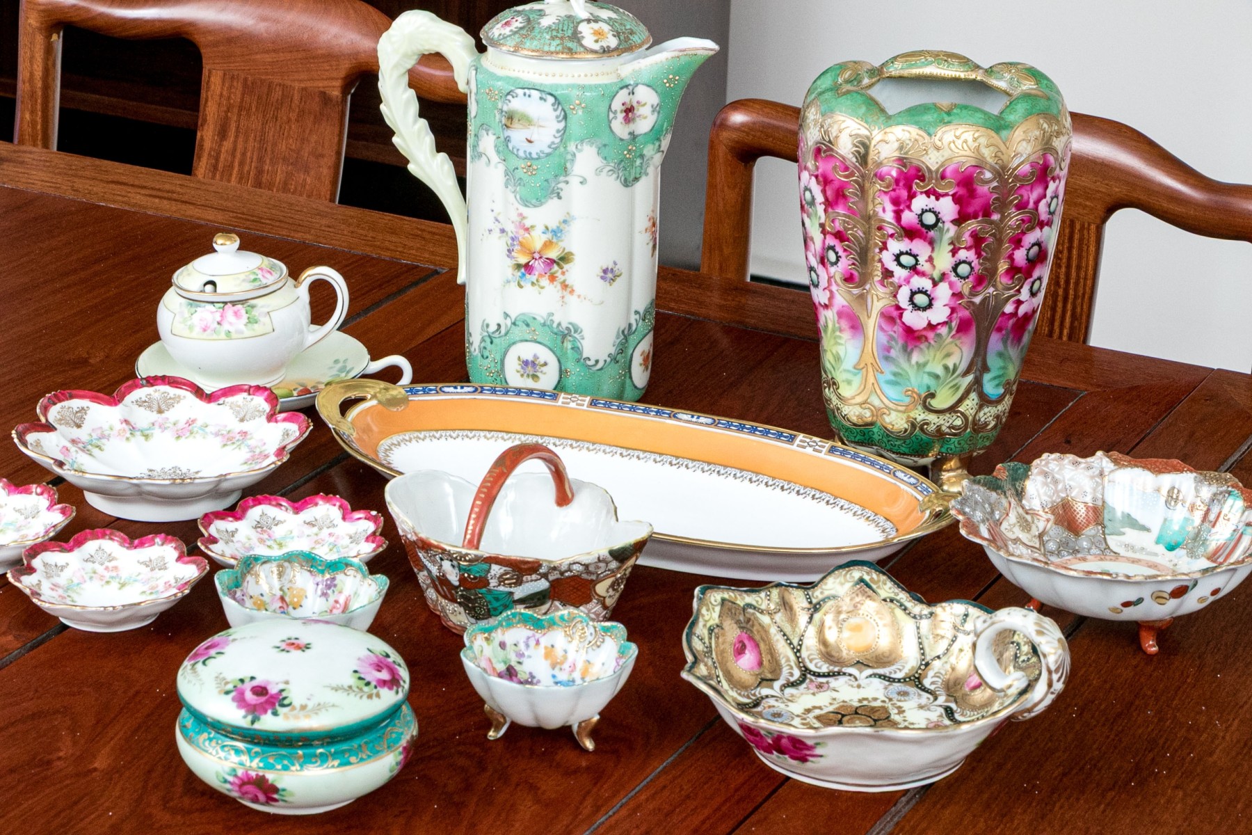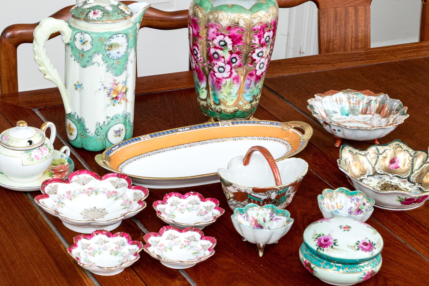 A wonderful assortment of Japanese porcelain with highly decorative designs. Pieces include a lidded ewer, footed floriform vase, lidded bowl, large floriform bowl and three smaller, floriform footed vases (8 1/2" H x 5 1/4" Diameter), twin-handled oval serving plate (13 5/8 x 6 1/2" W), quatrefoil basket with arched handle, lidded cup with creamer, and more.