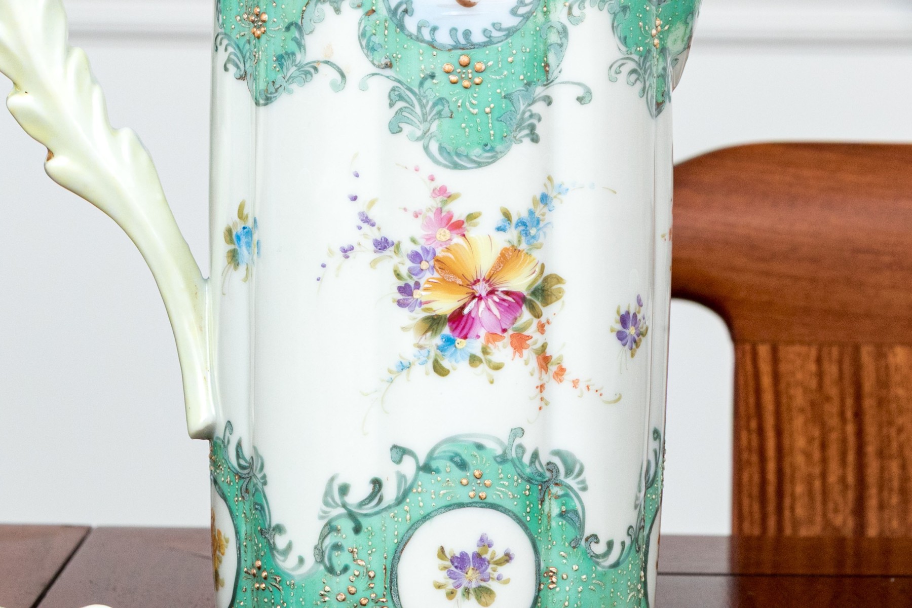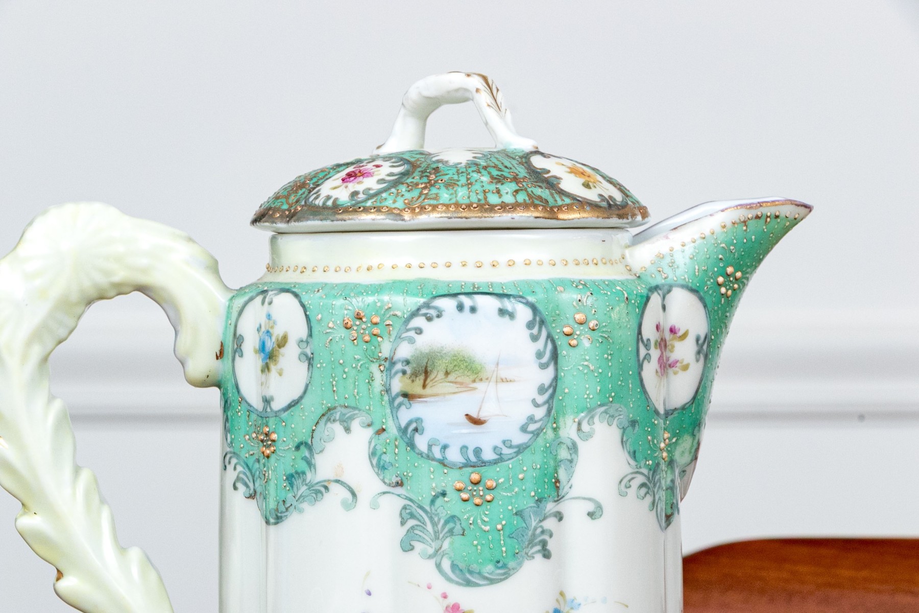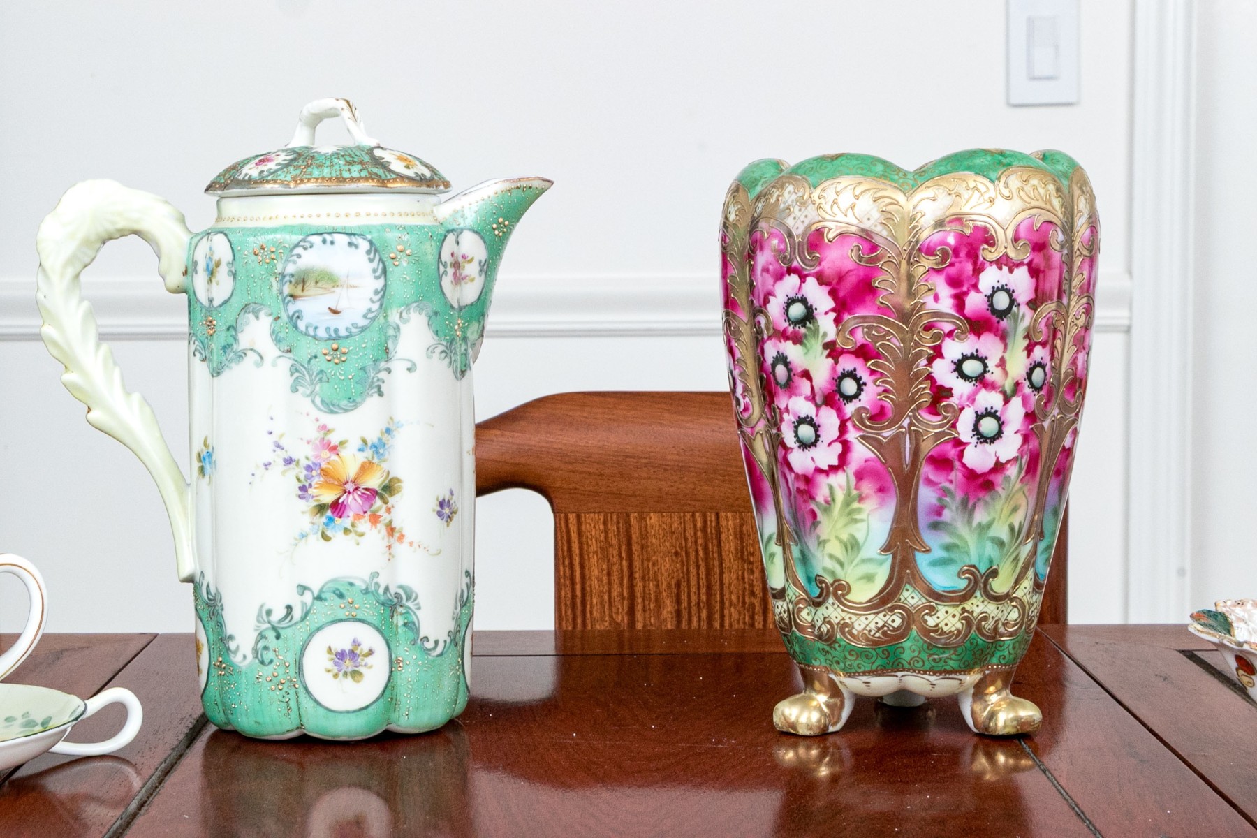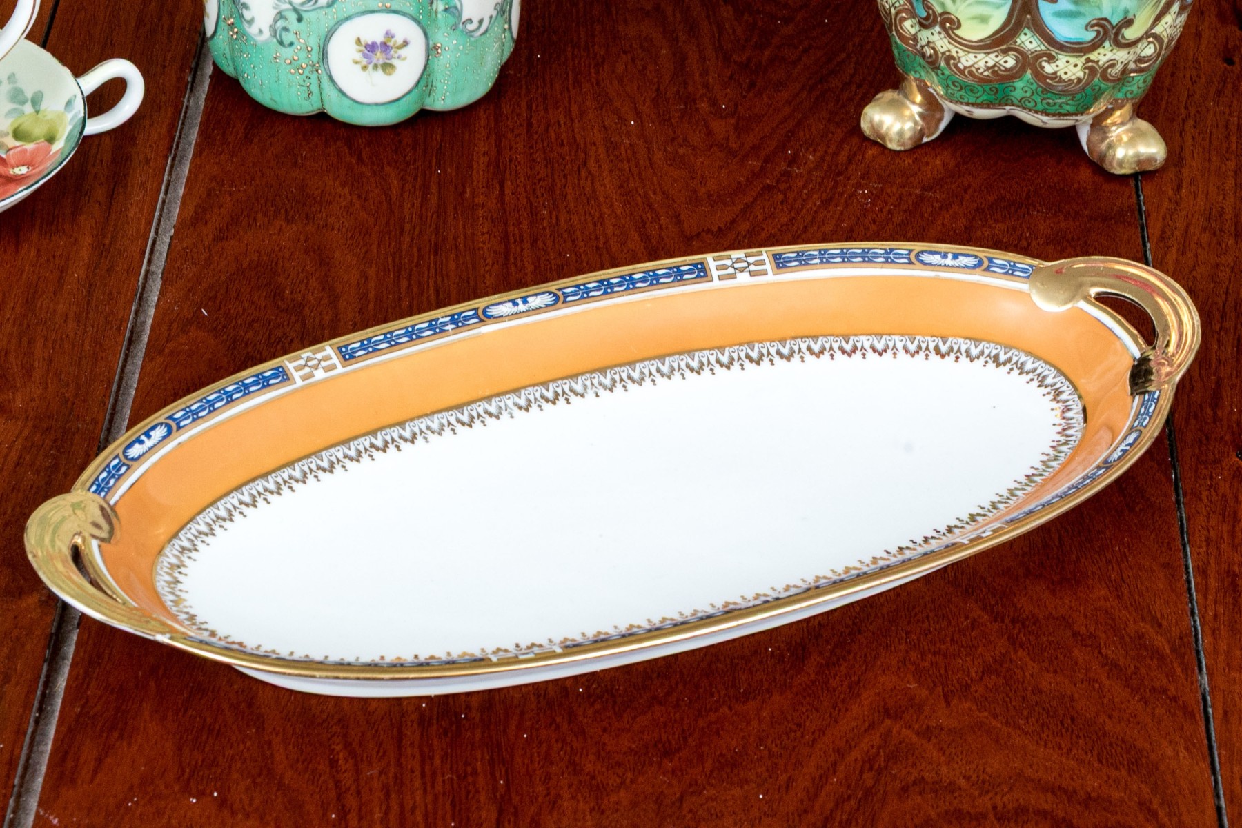 A wonderful assortment of Japanese porcelain with highly decorative designs. Pieces include a lidded ewer, footed floriform vase, lidded bowl, large floriform bowl and three smaller, floriform footed vases (8 1/2" H x 5 1/4" Diameter), twin-handled oval serving plate (13 5/8 x 6 1/2" W), quatrefoil basket with arched handle, lidded cup with creamer, and more.
