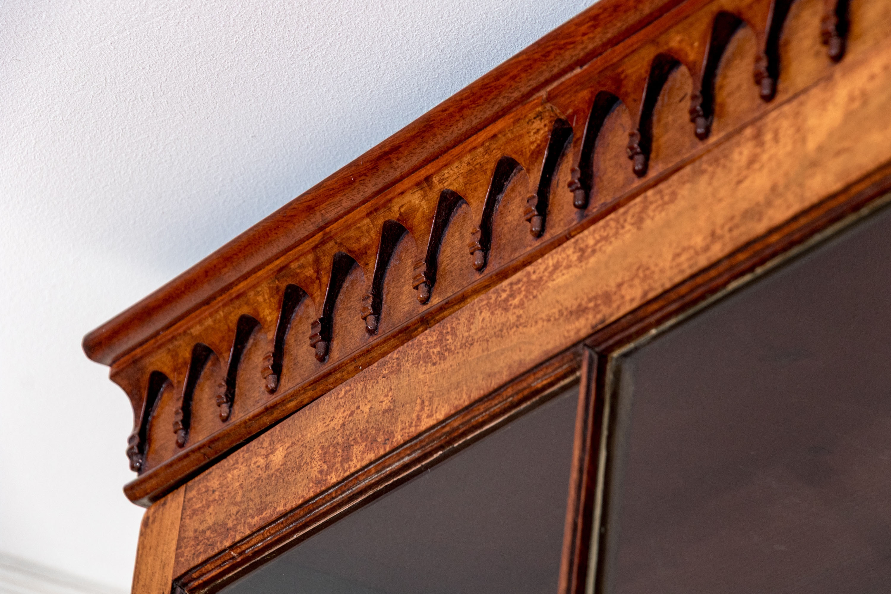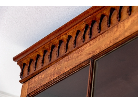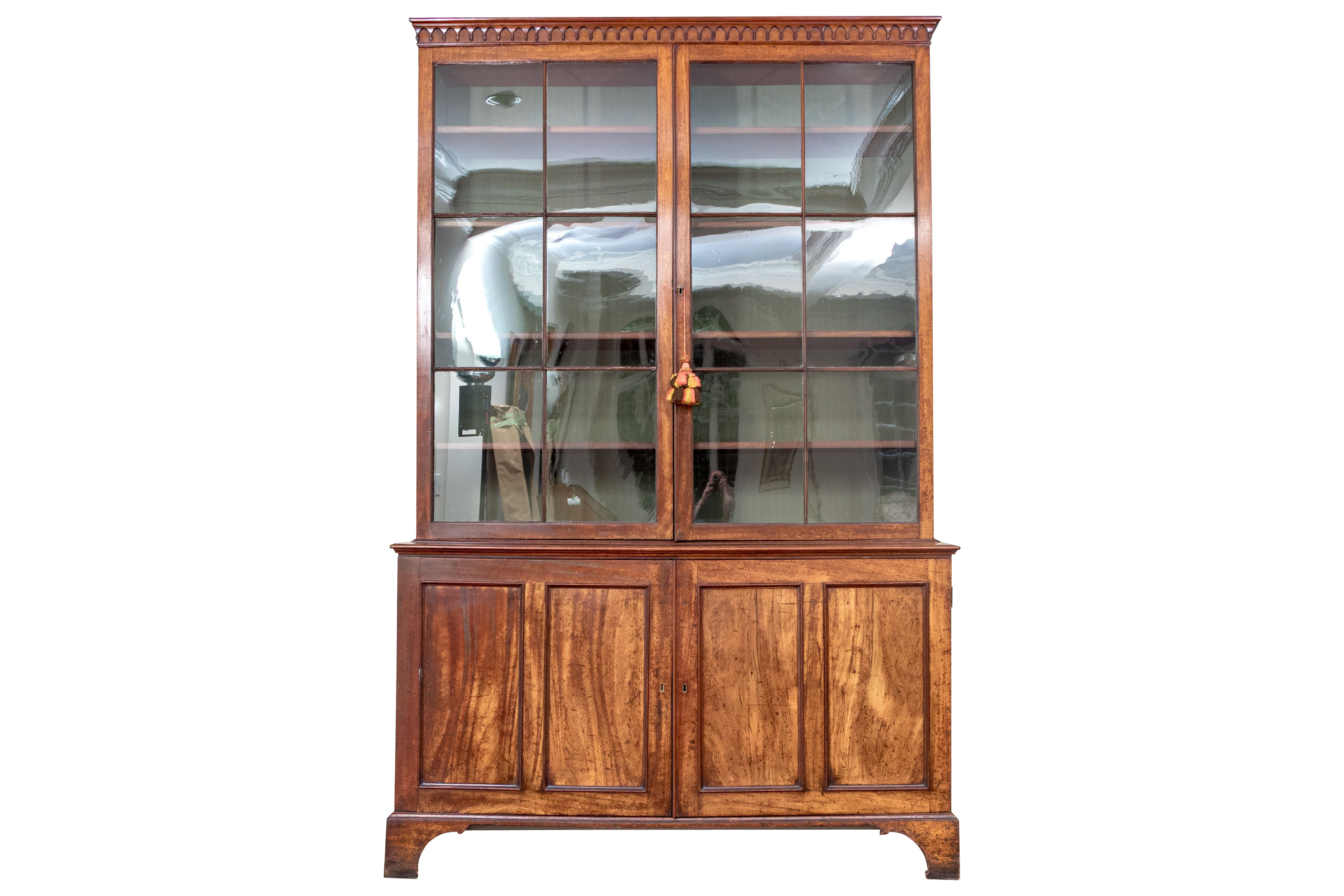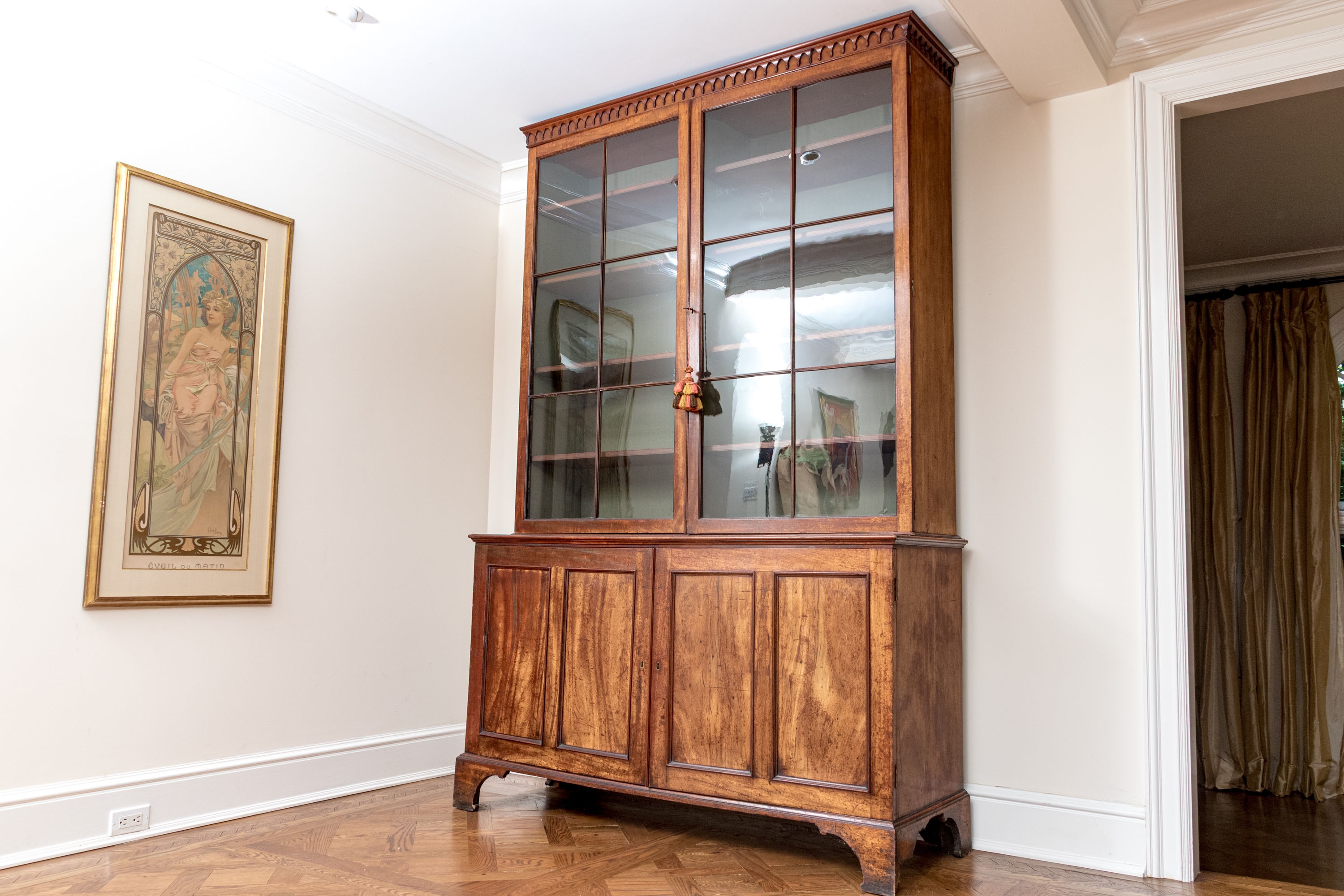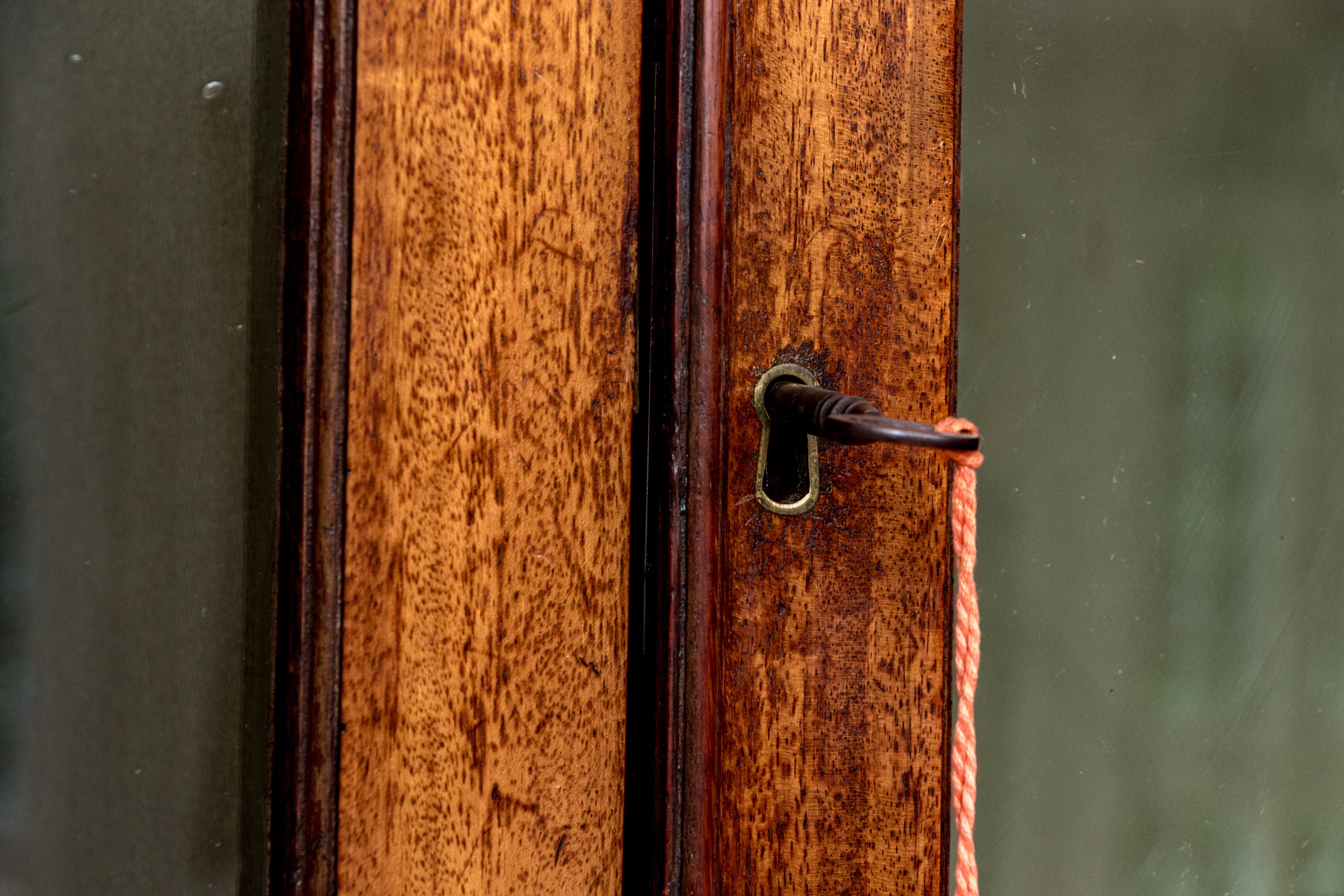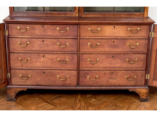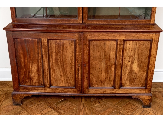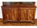 Raised on a four carved low feet with the lower case having two hinged doors with brass key escutcheons. The upper case with glass paneled doors with wonderful fluted and ogee crown. Key with tassels.