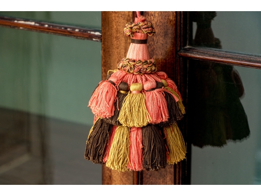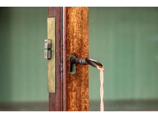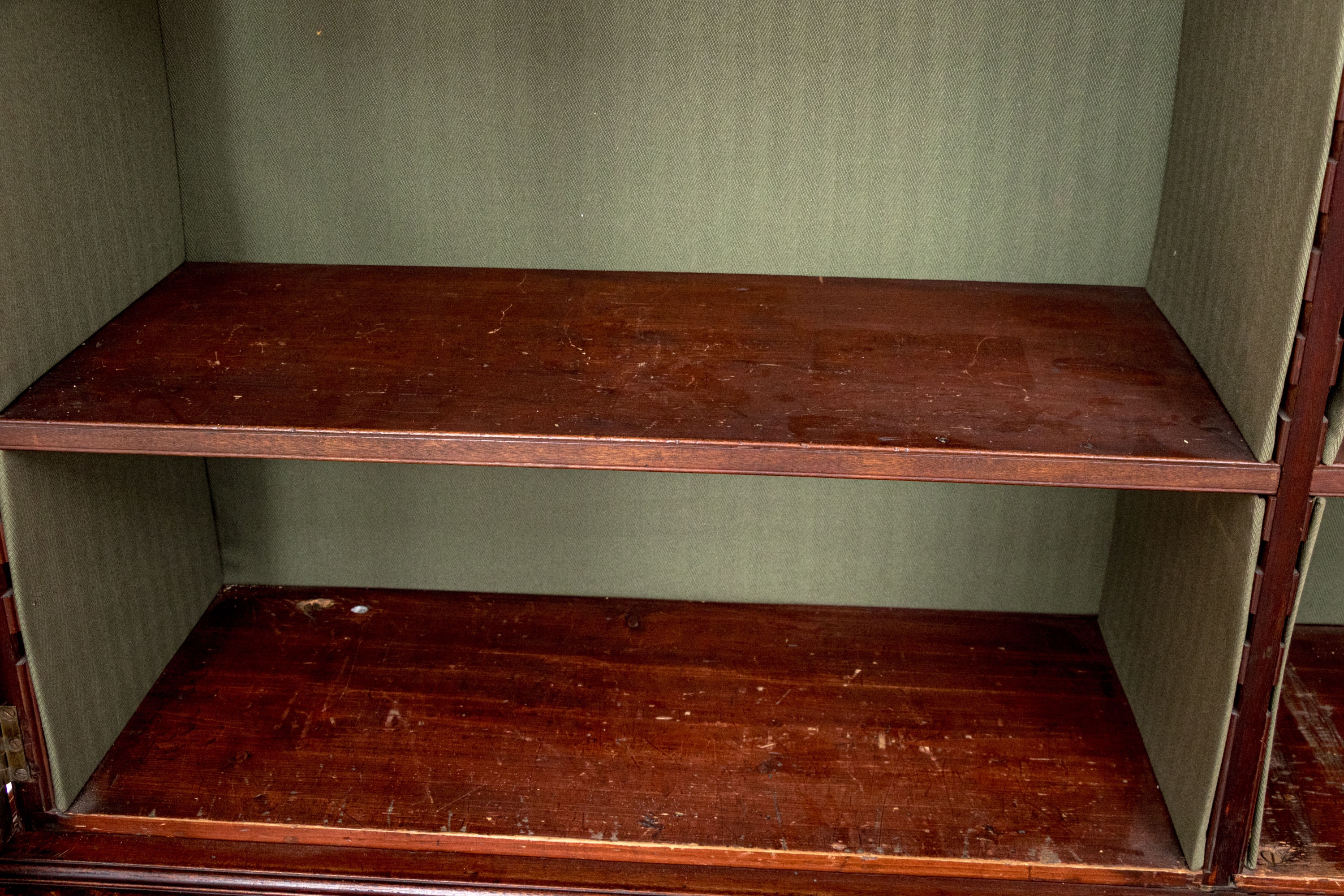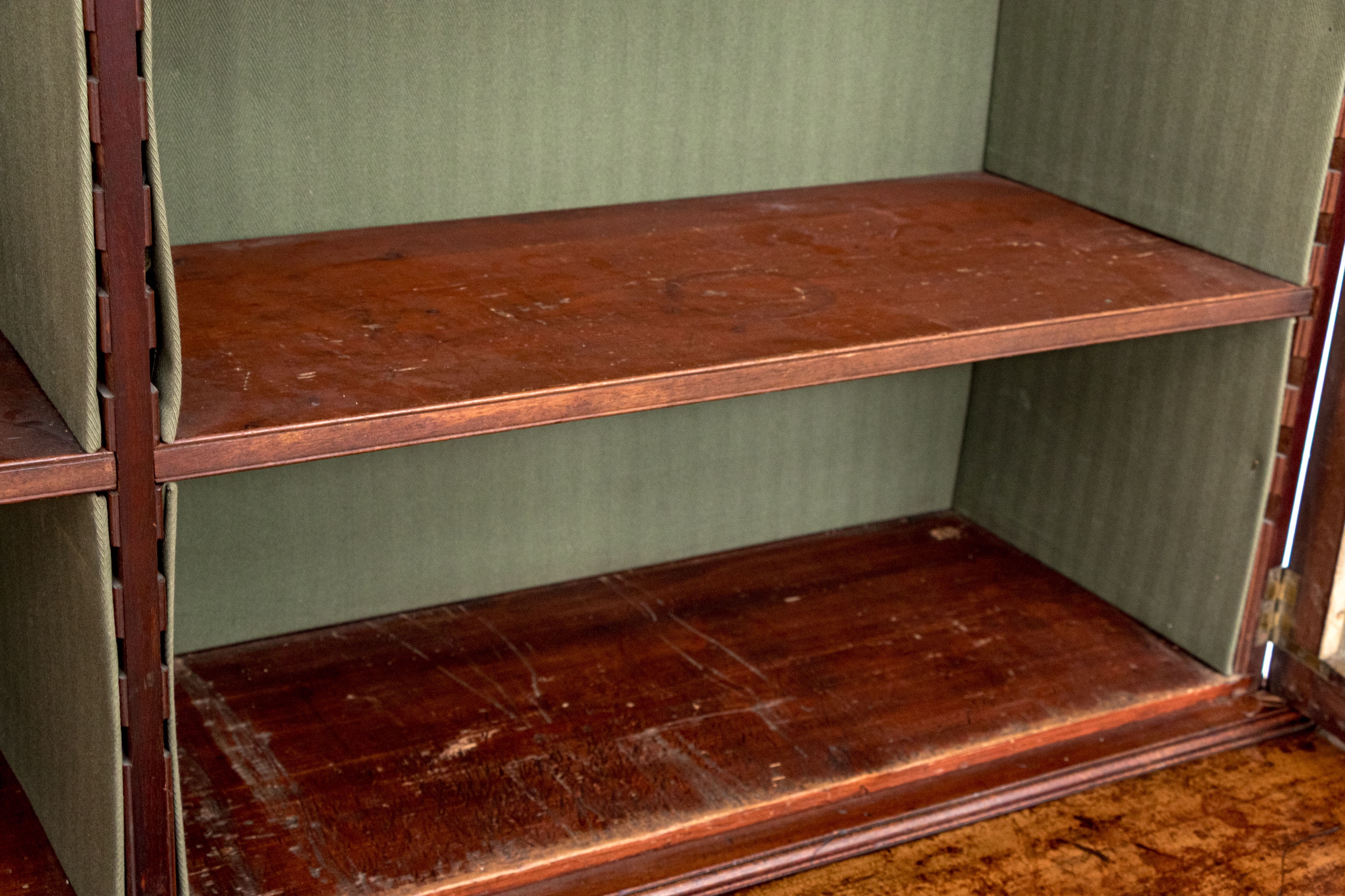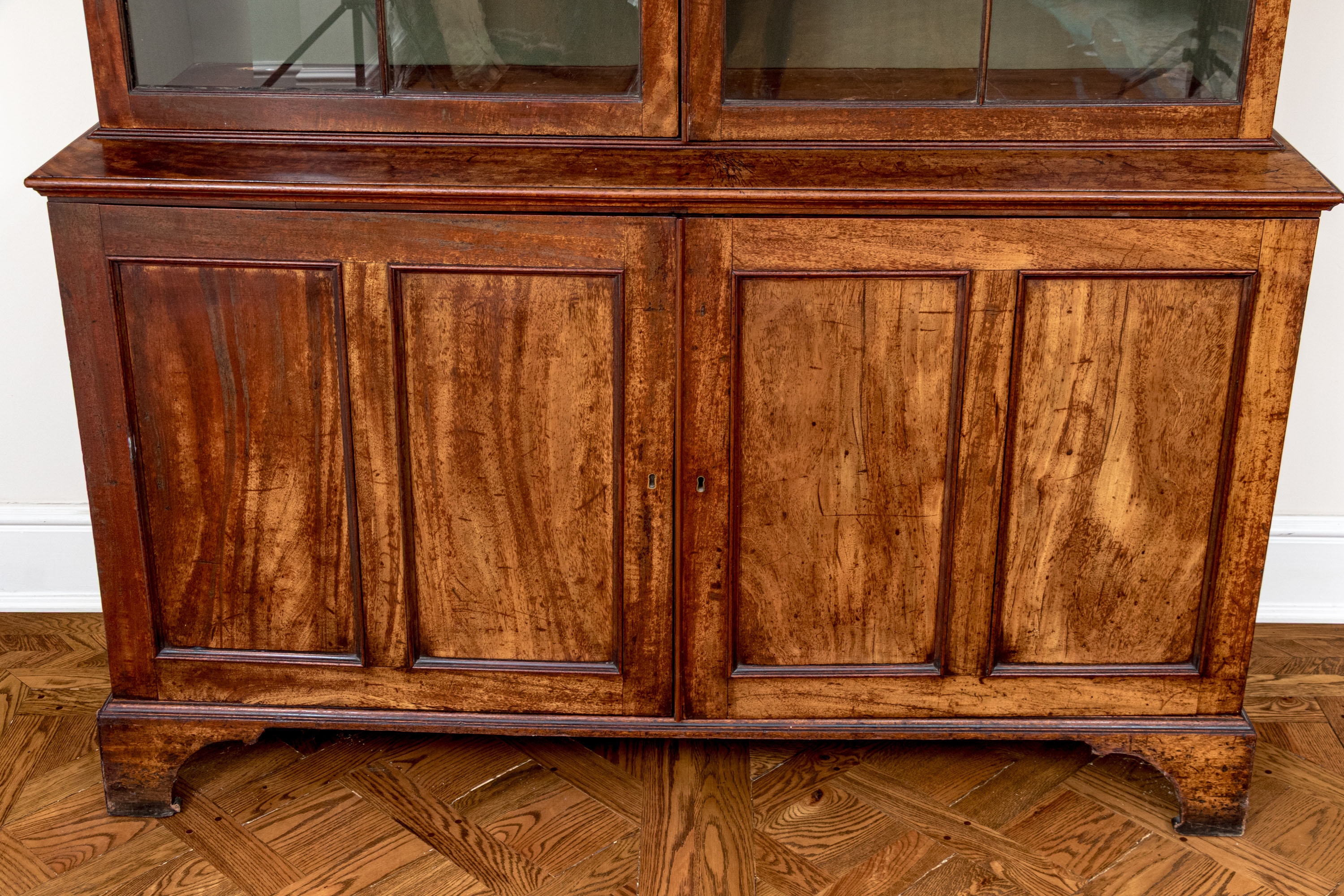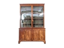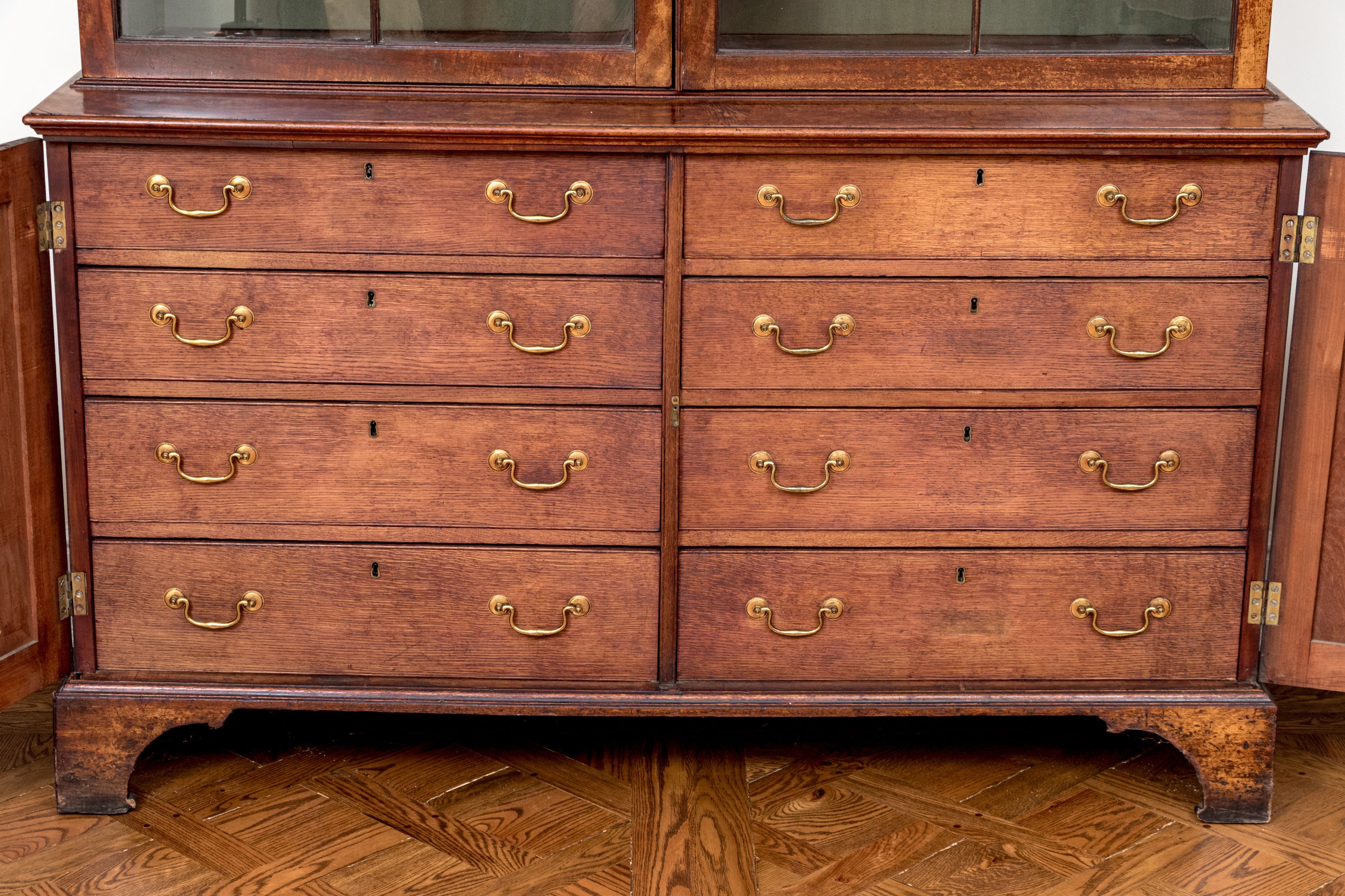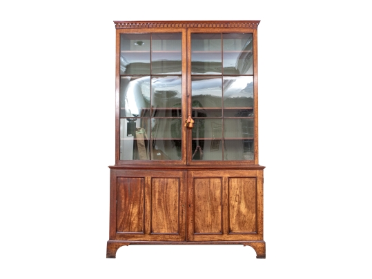 Raised on a four carved low feet with the lower case having two hinged doors with brass key escutcheons. The upper case with glass paneled doors with wonderful fluted and ogee crown. Key with tassels.