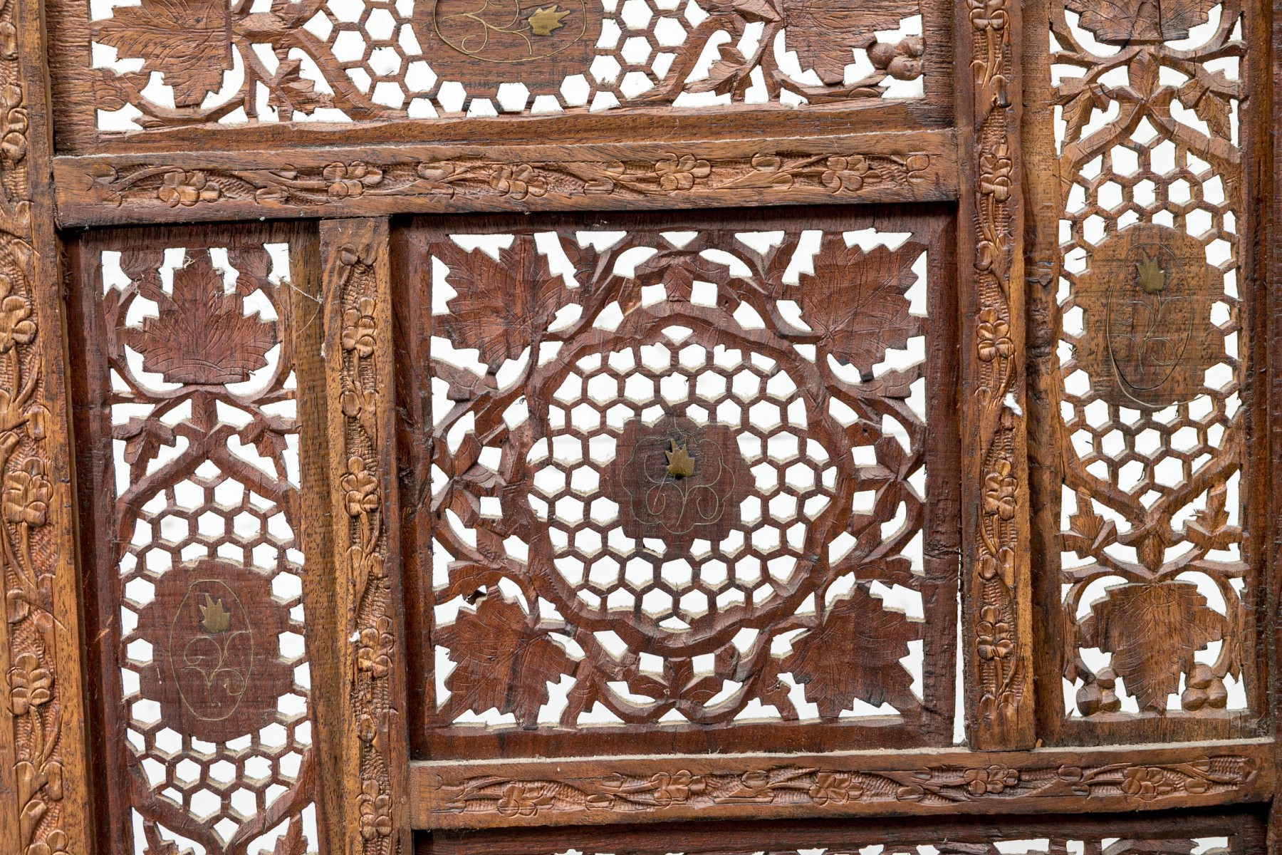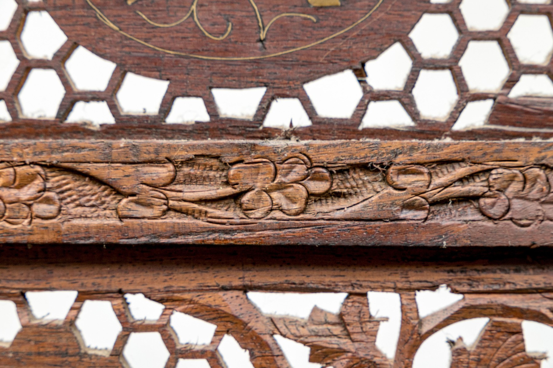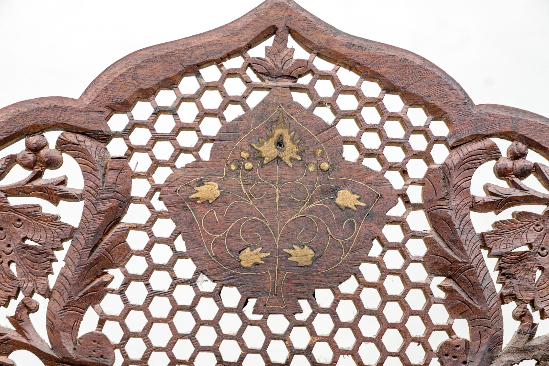 Finely carved openwork mesh like panels and bands of floral and leaf motifs with brass inlaid details. The frames carved in relief, carved on both sides.