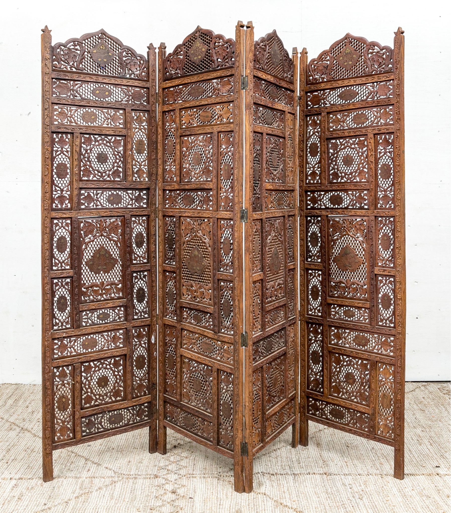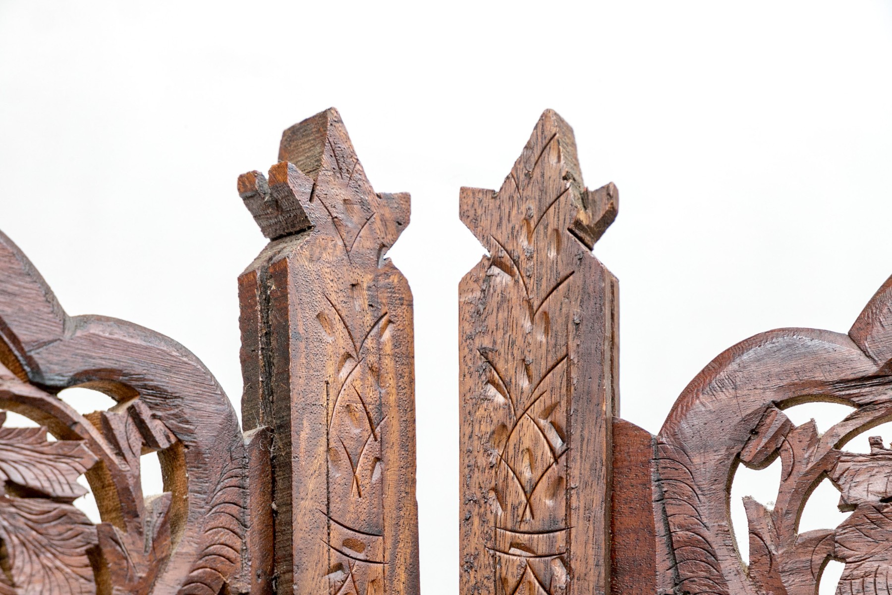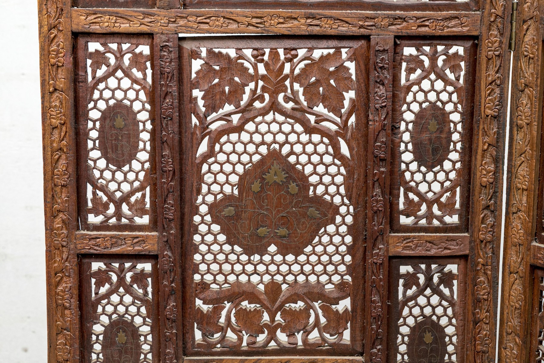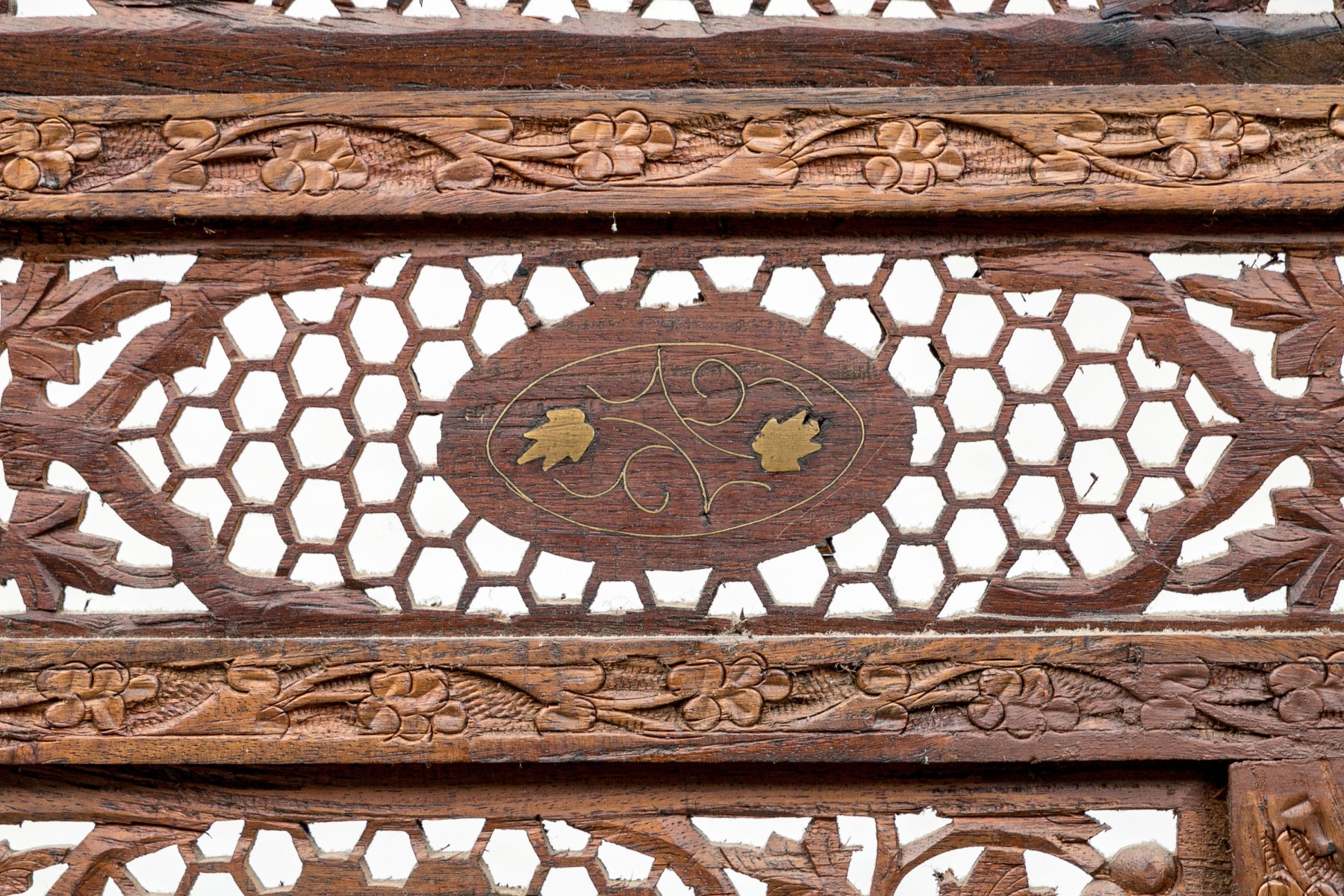 Finely carved openwork mesh like panels and bands of floral and leaf motifs with brass inlaid details. The frames carved in relief, carved on both sides.