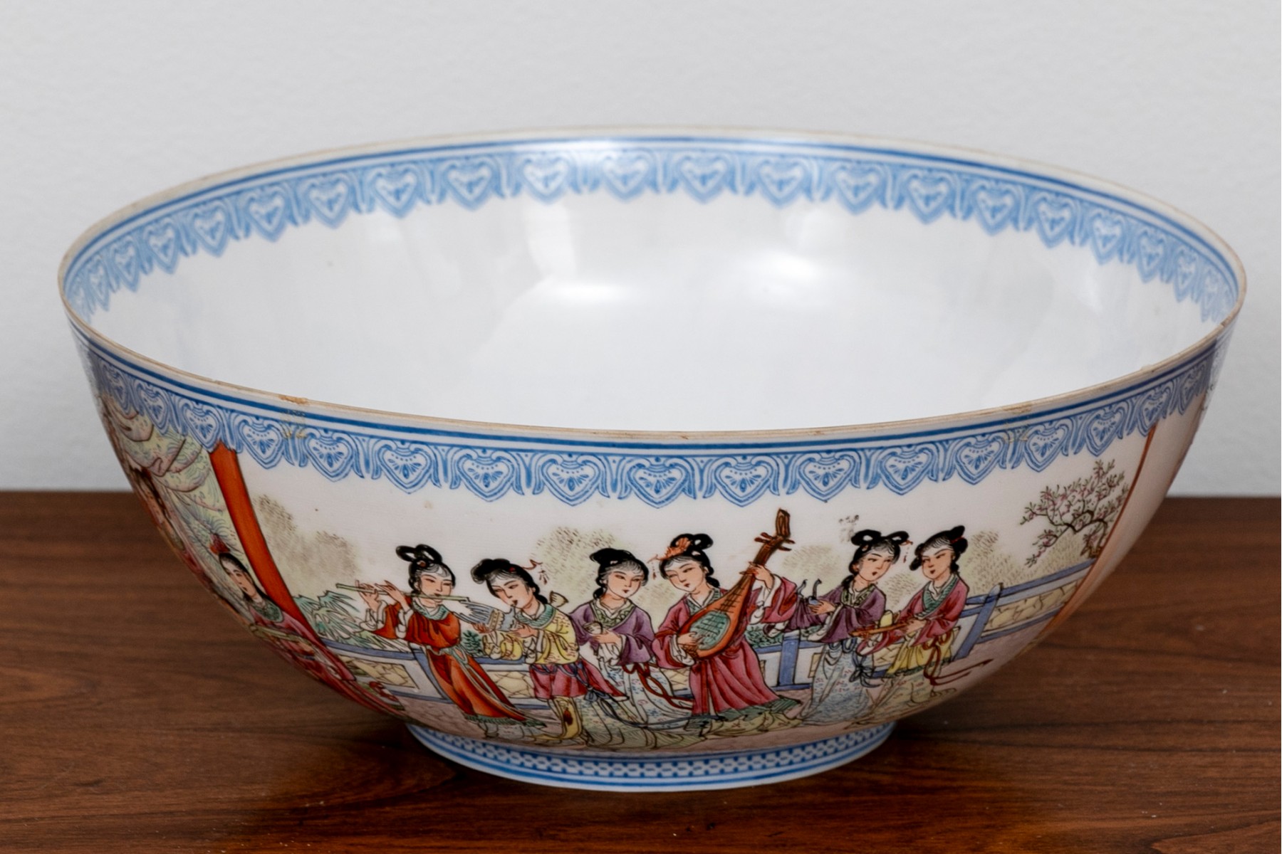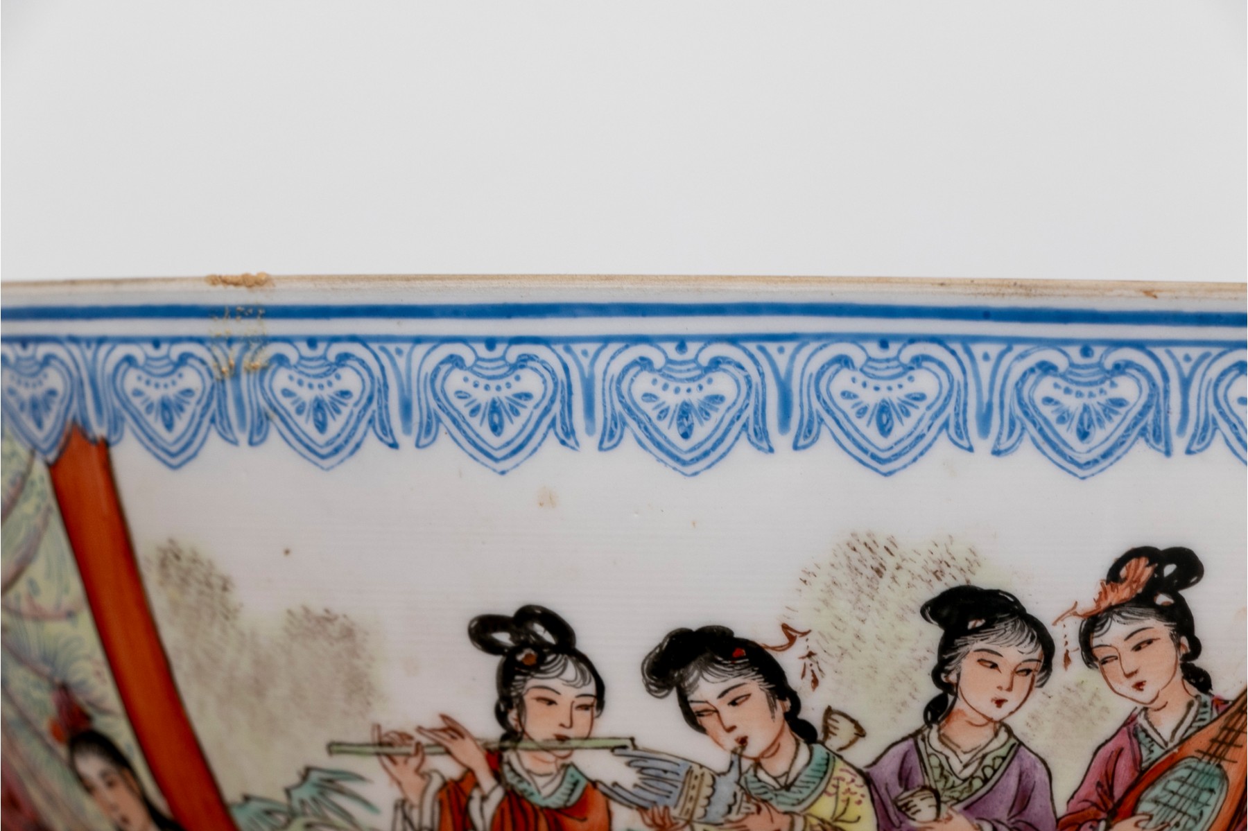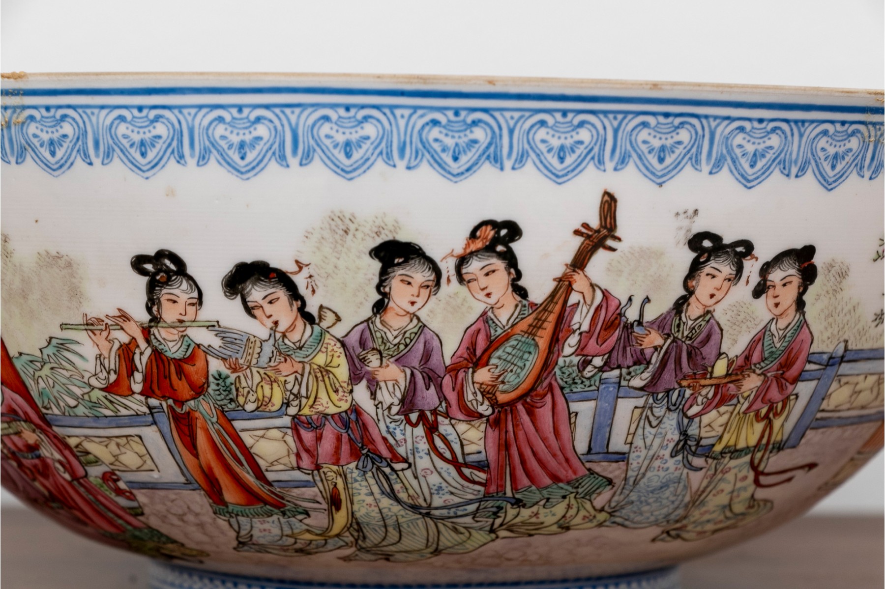Finely made porcelain bowl raised on a circular foot ring with a wonderful figural scene of court women playing musical instruments within an architectural landscape. Above is a continuous band of lingzi in blue around the outer mouth trim.