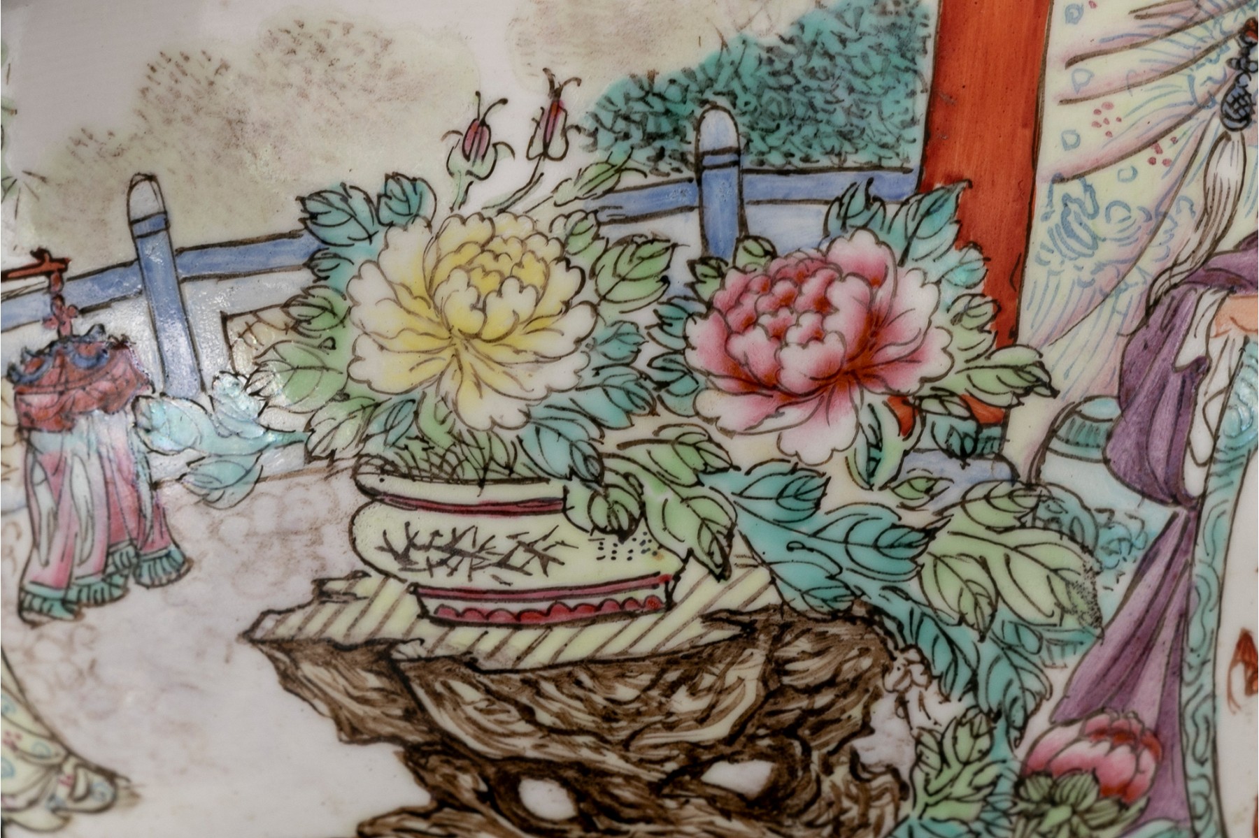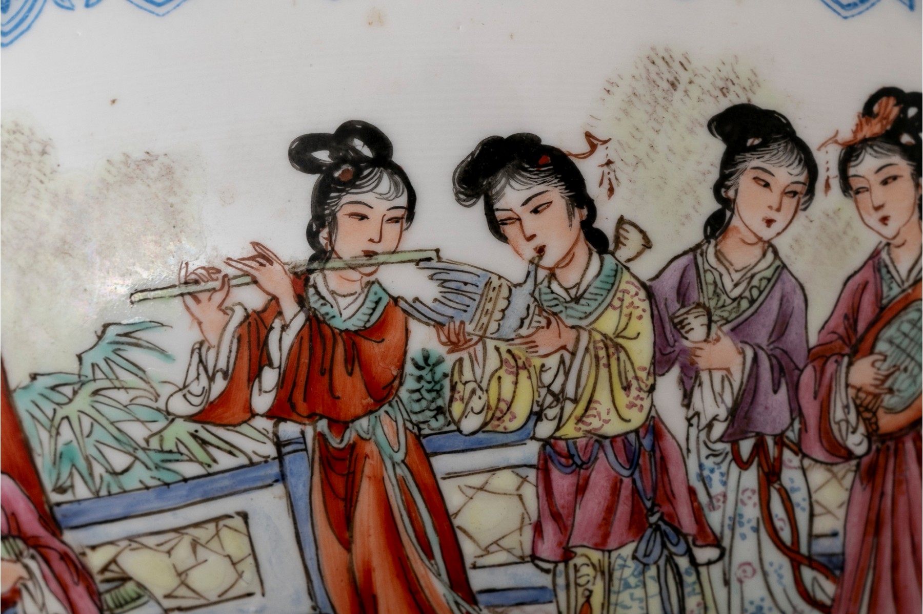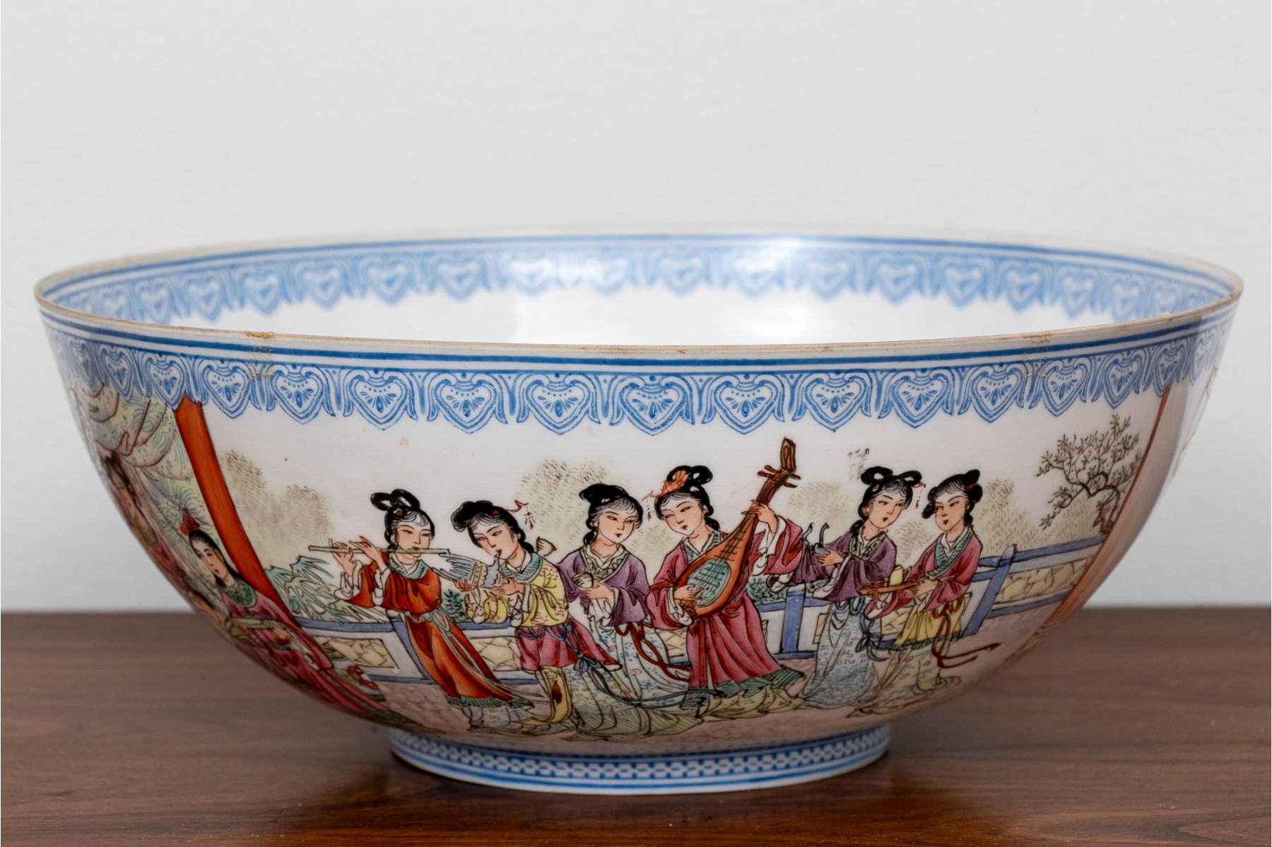 Finely made porcelain bowl raised on a circular foot ring with a wonderful figural scene of court women playing musical instruments within an architectural landscape. Above is a continuous band of lingzi in blue around the outer mouth trim.