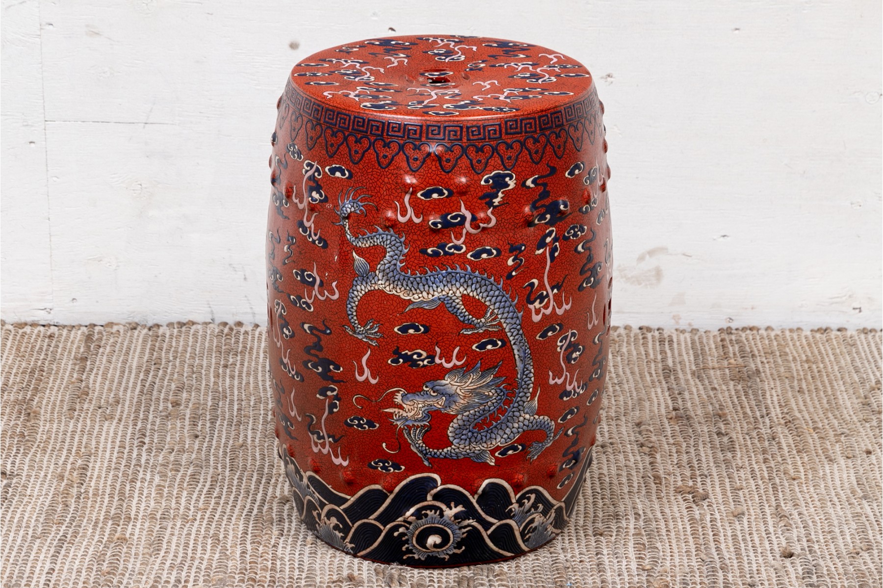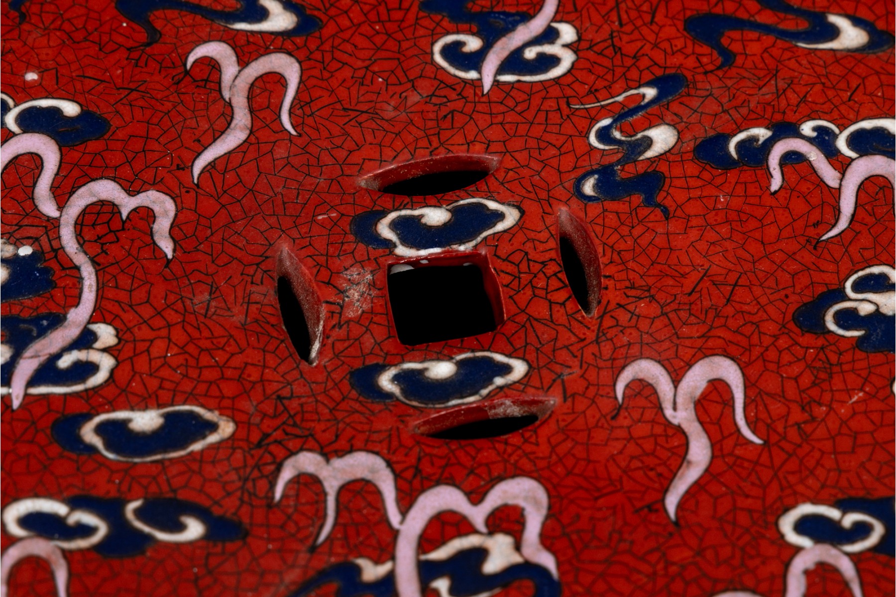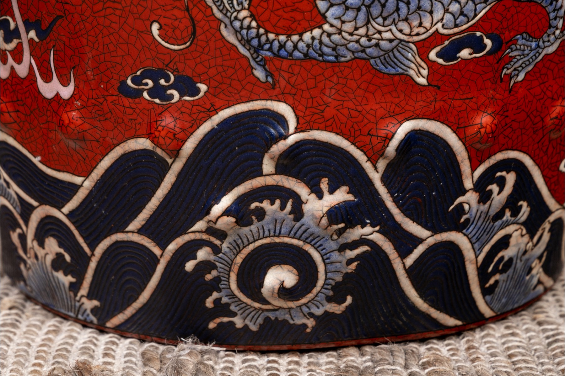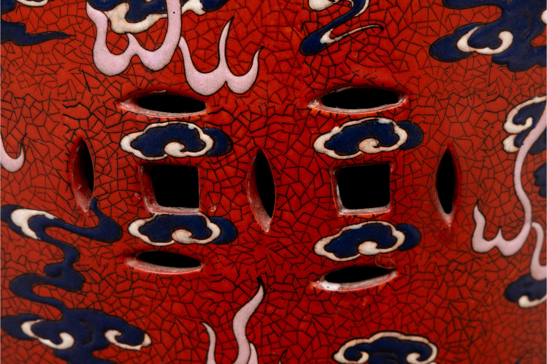 Painted red with blue dragons and clouds over blue and white waves below. The top and sides pierced.