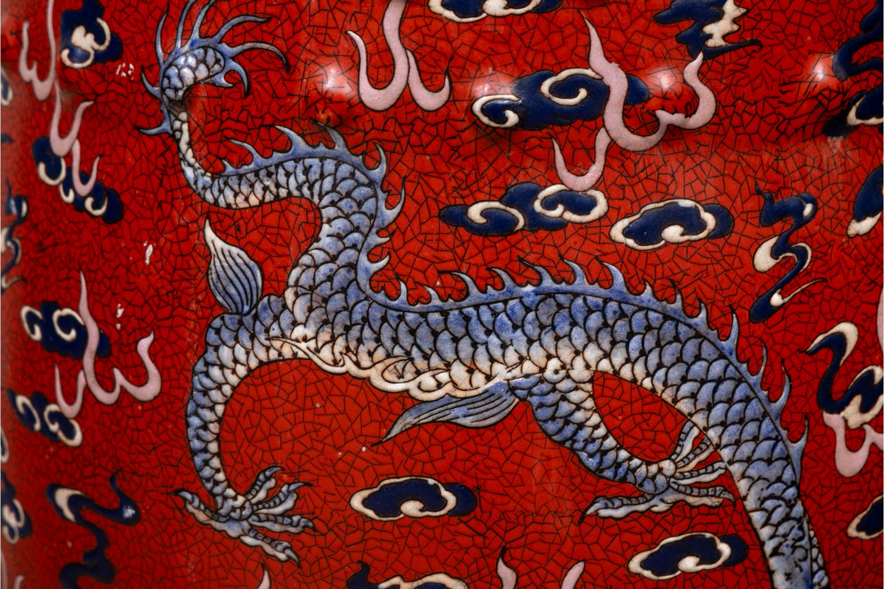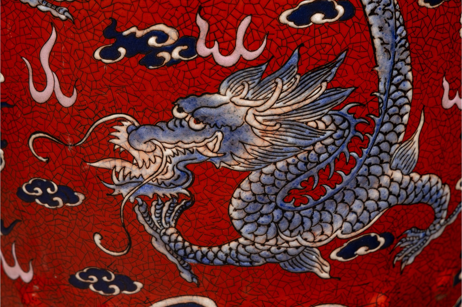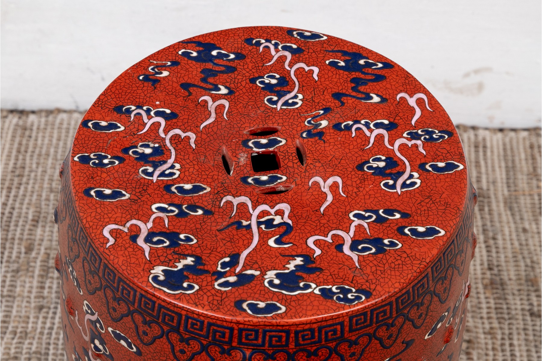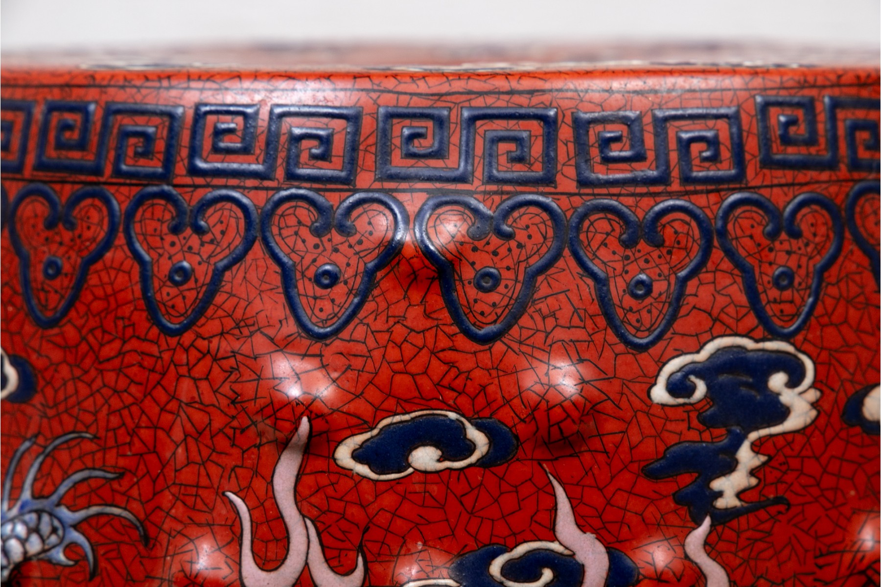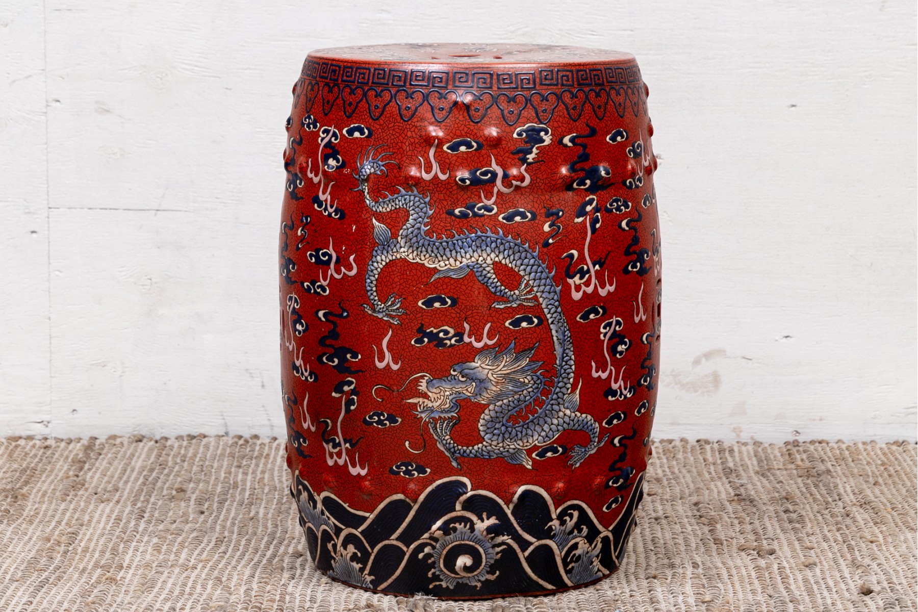 Painted red with blue dragons and clouds over blue and white waves below. The top and sides pierced.