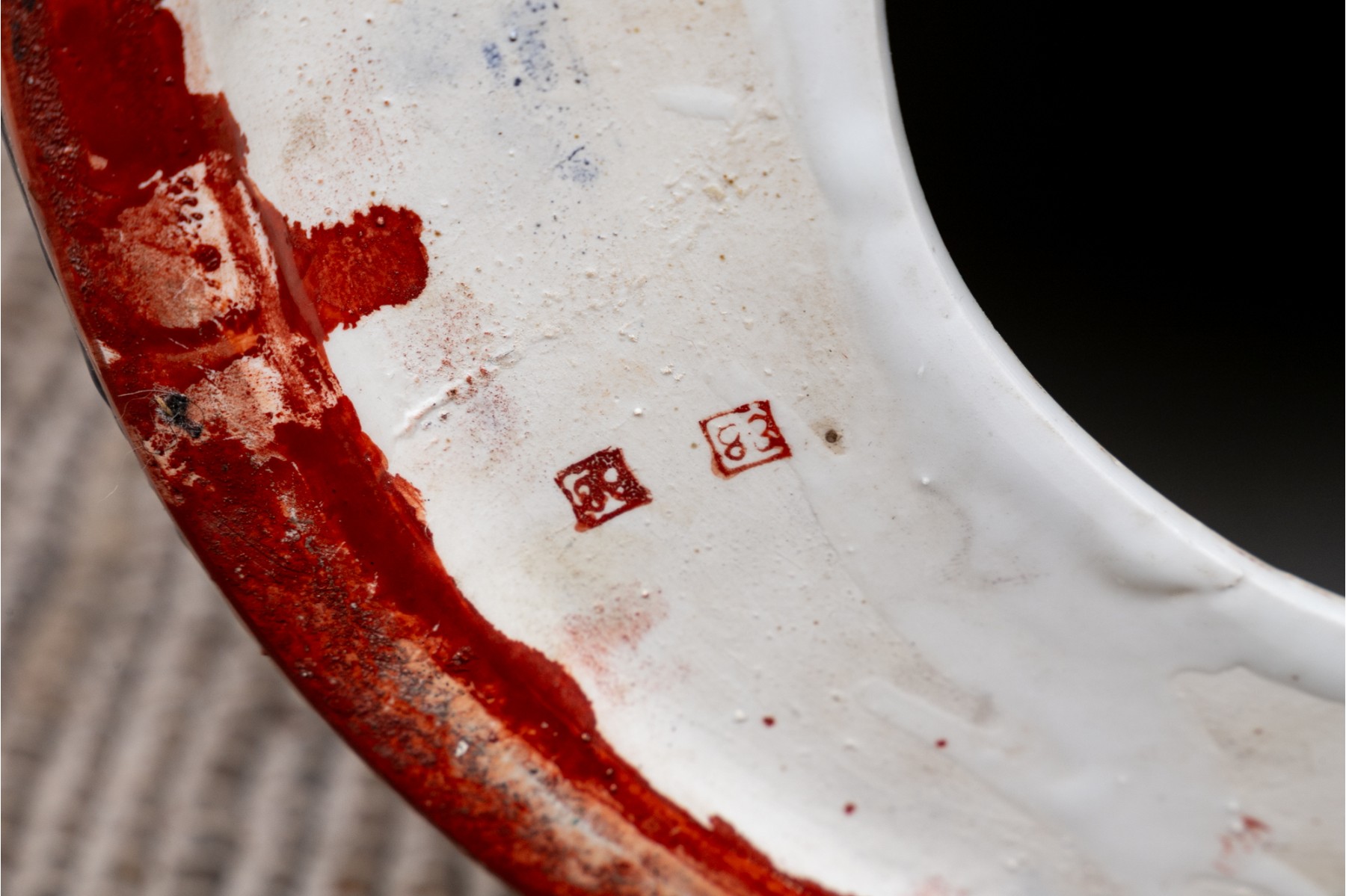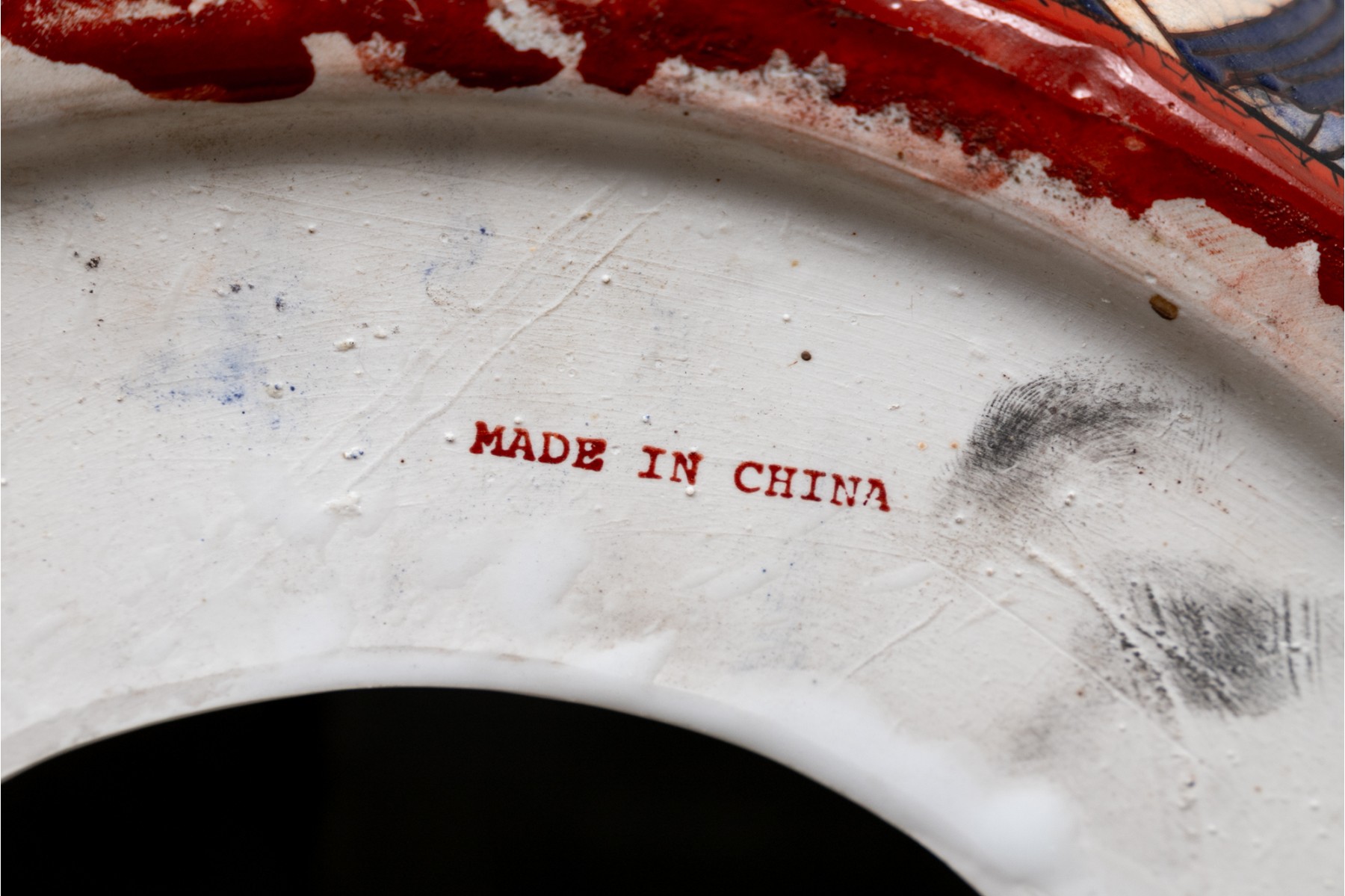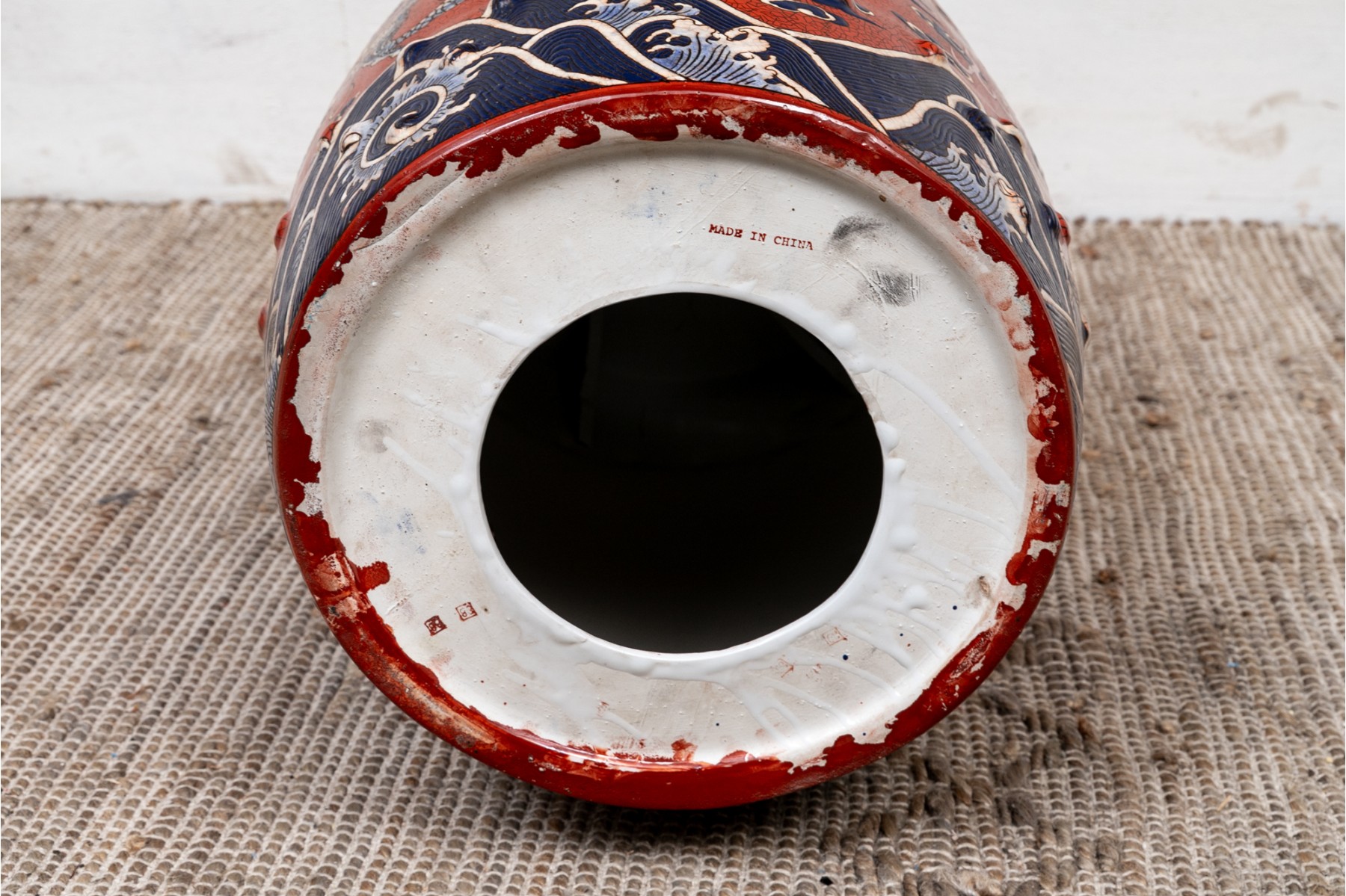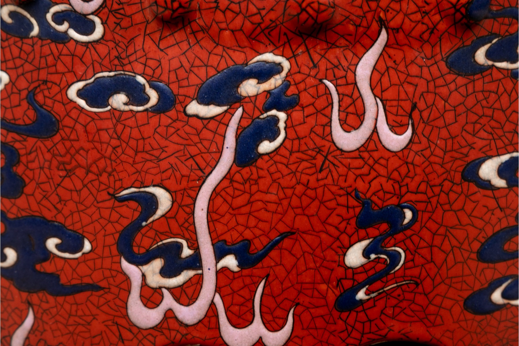 Painted red with blue dragons and clouds over blue and white waves below. The top and sides pierced.