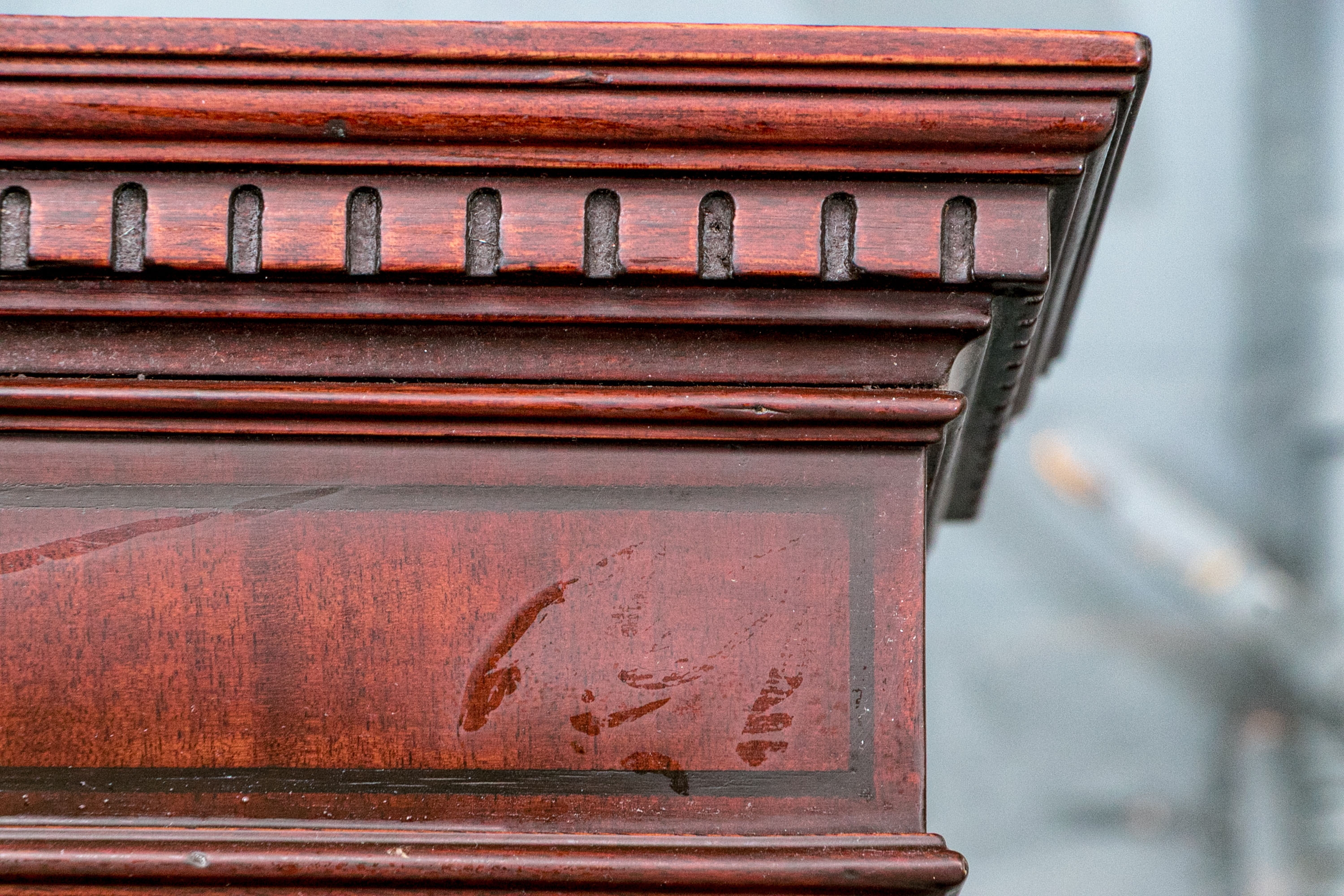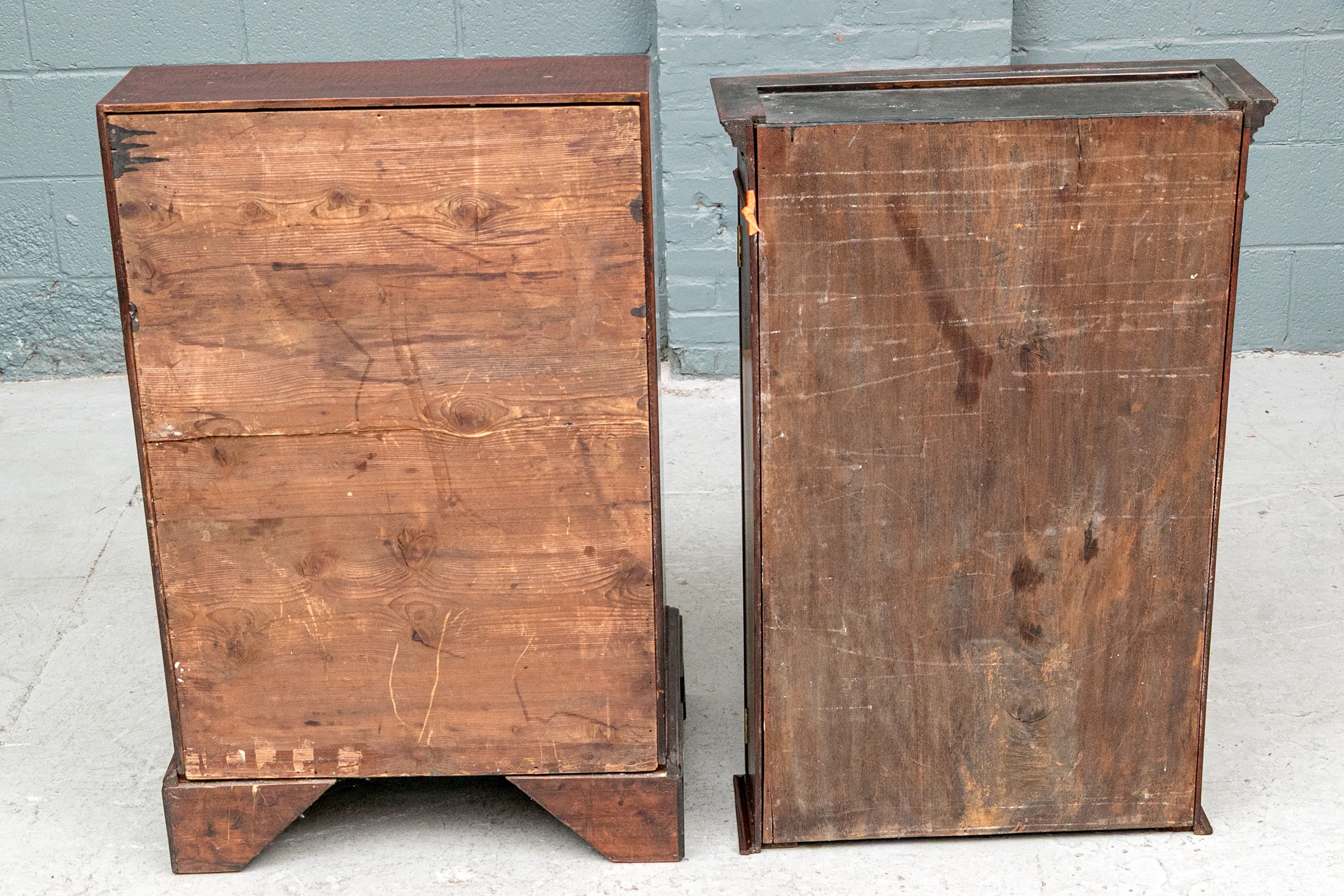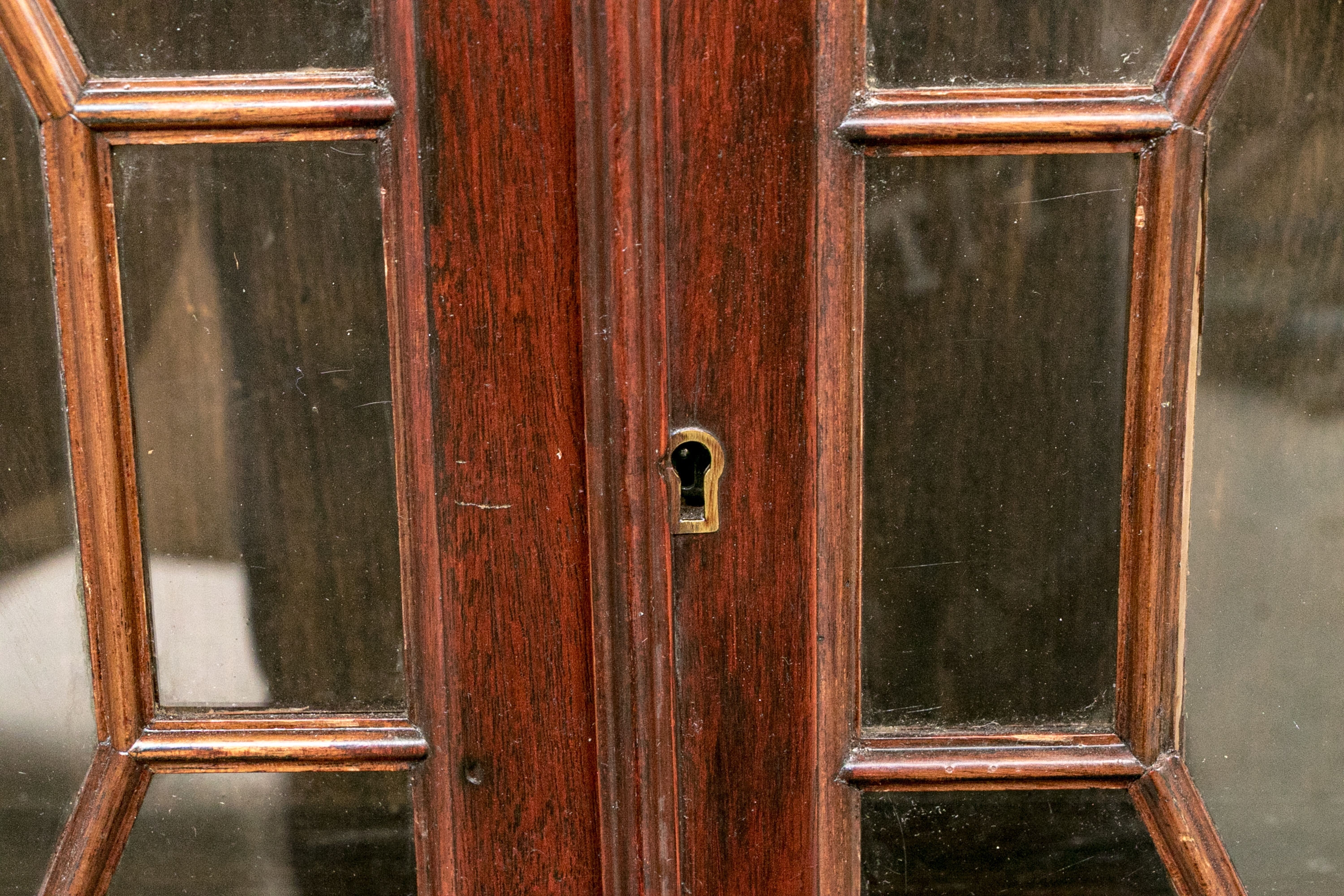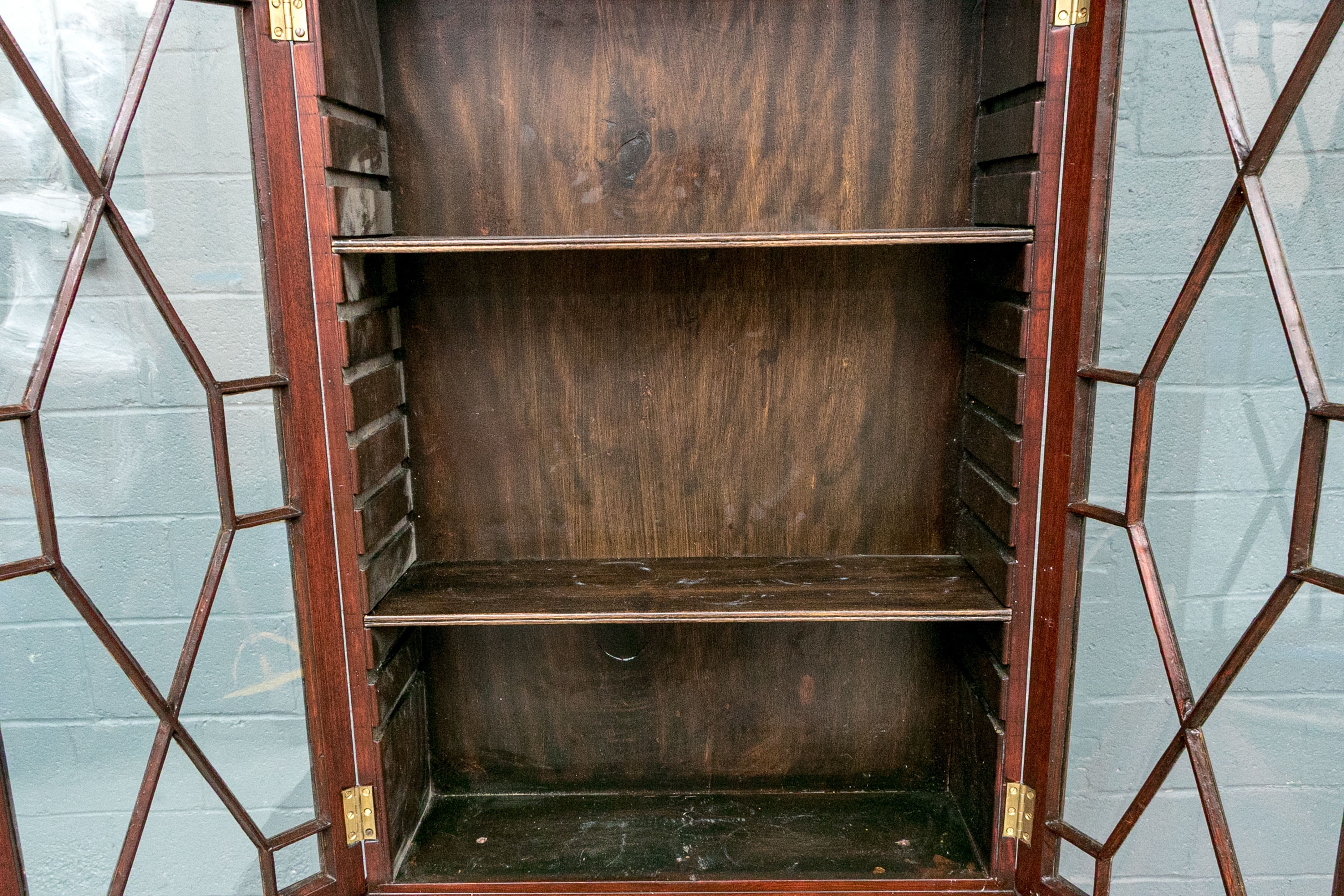 Condition: Please review the detail photos. There are some old gouges on the top of the lower case and some wear inside the bookcase. The cabinet has been professionally restored at an earlier time and presents in a refined manner.