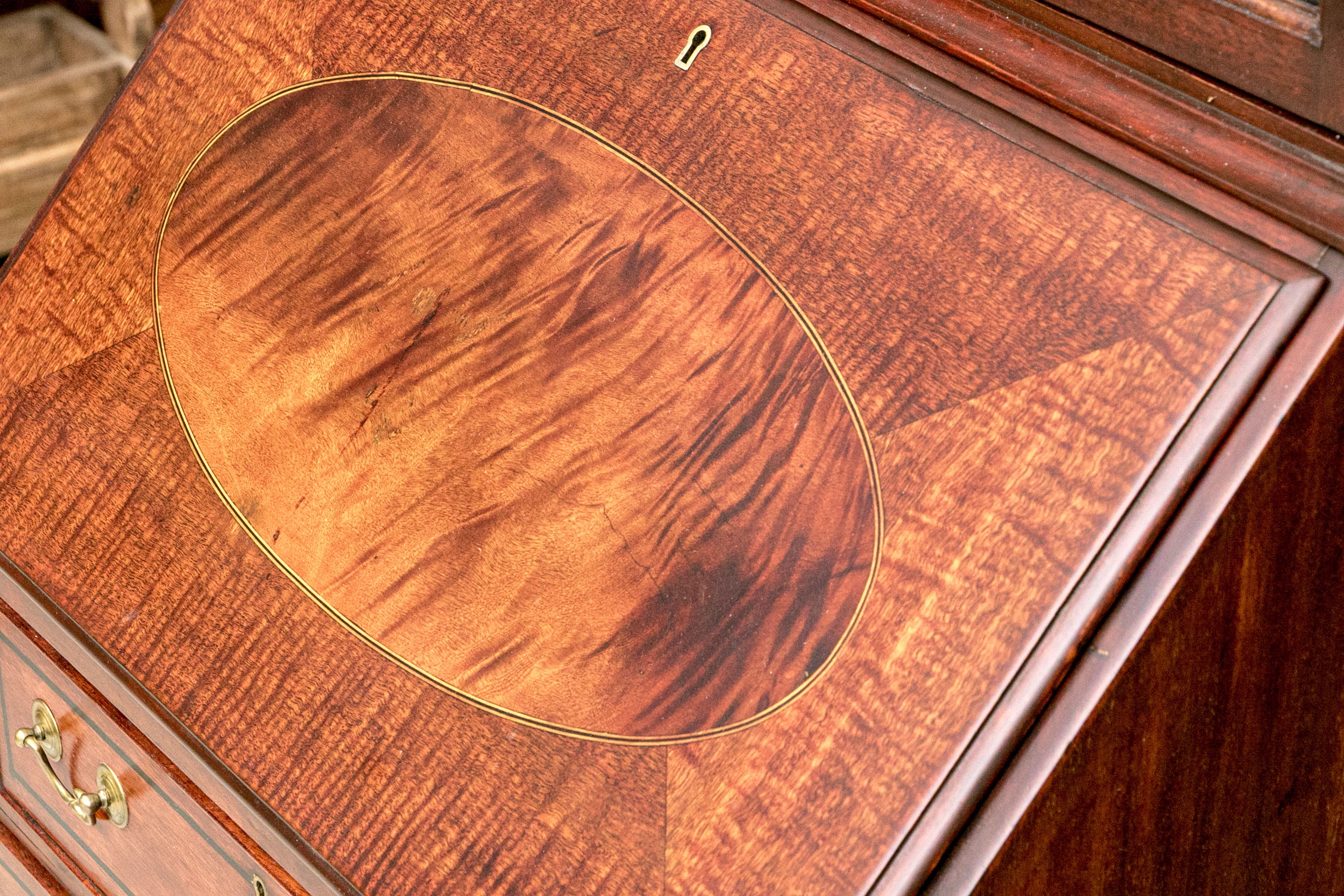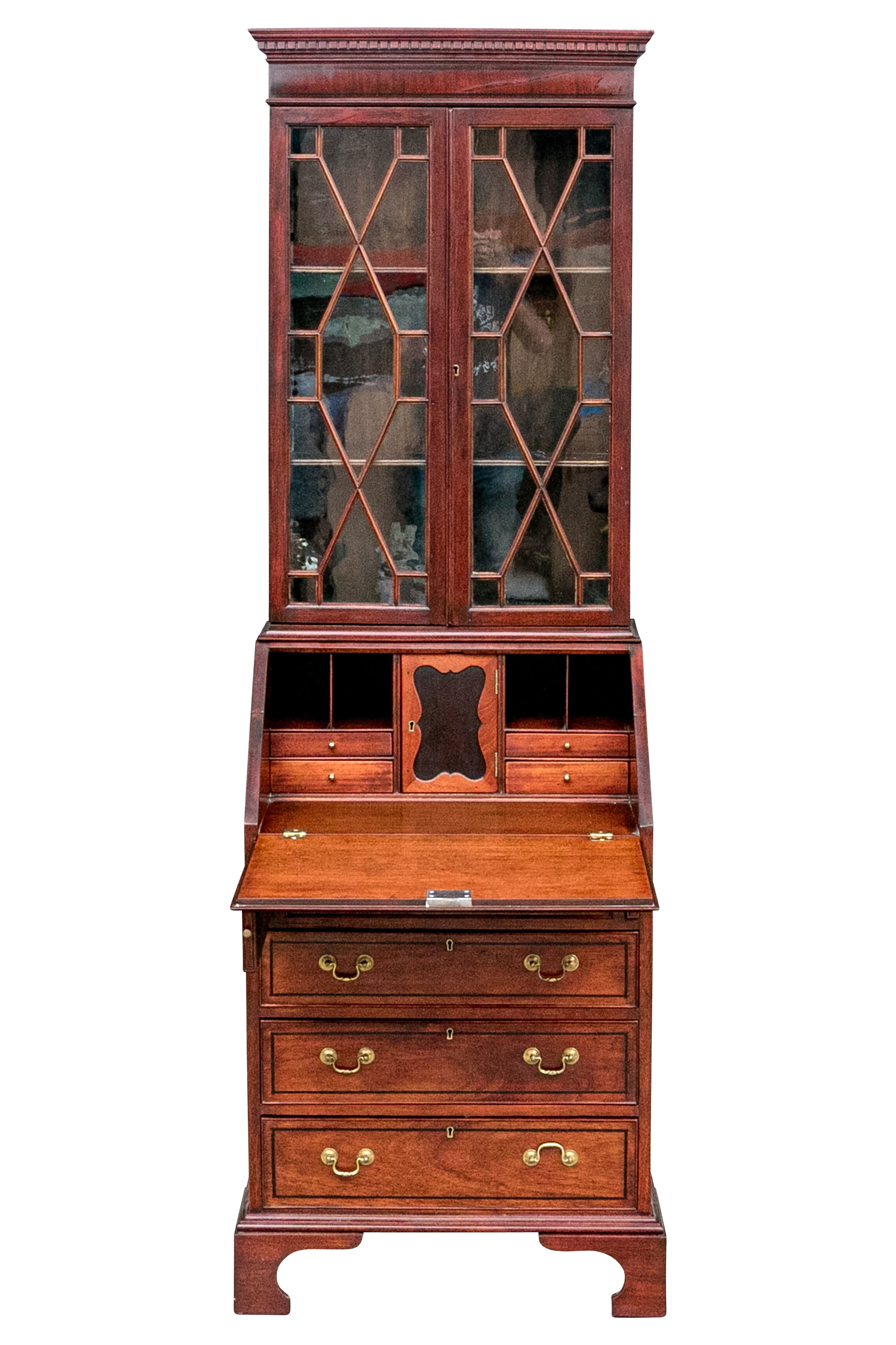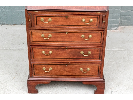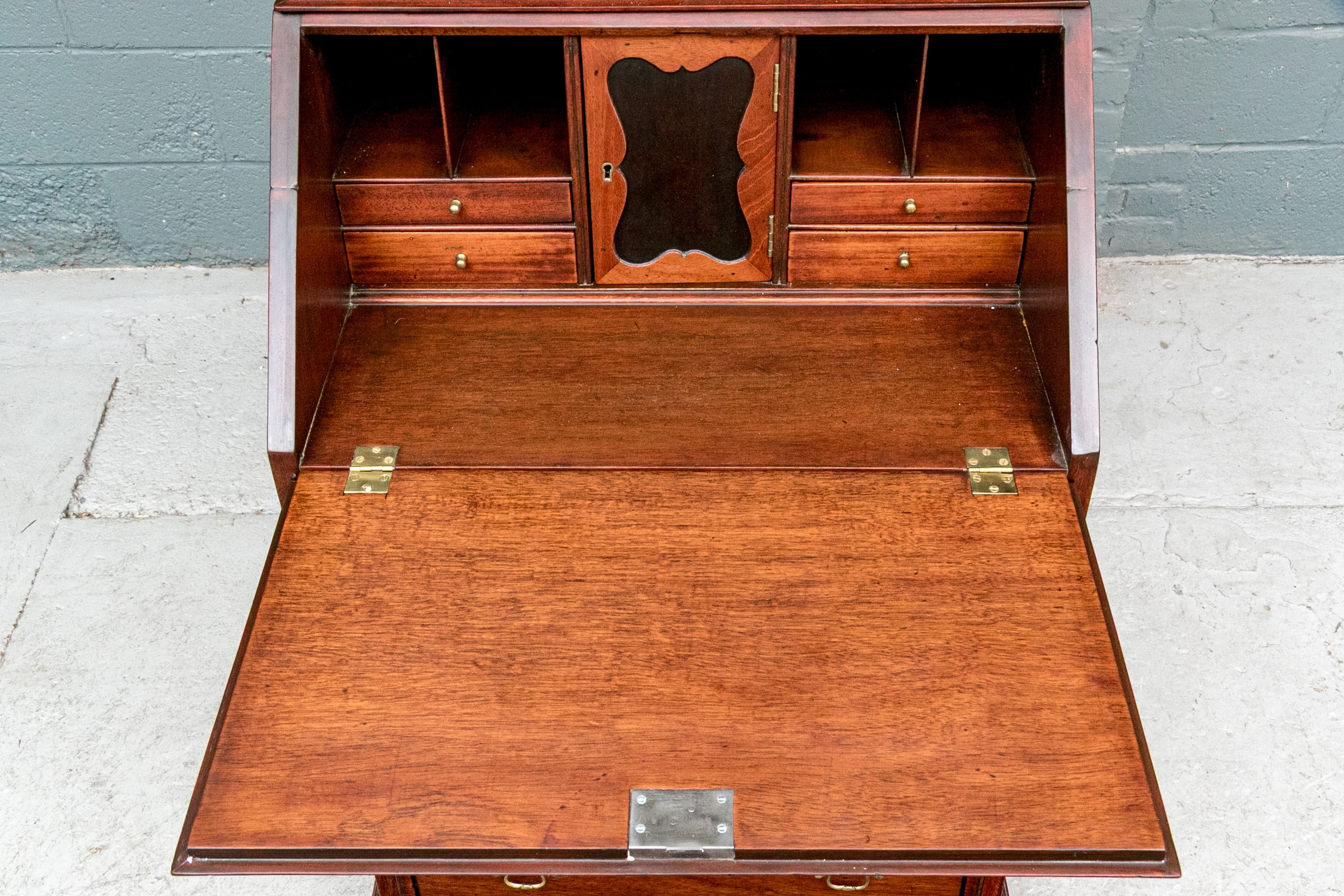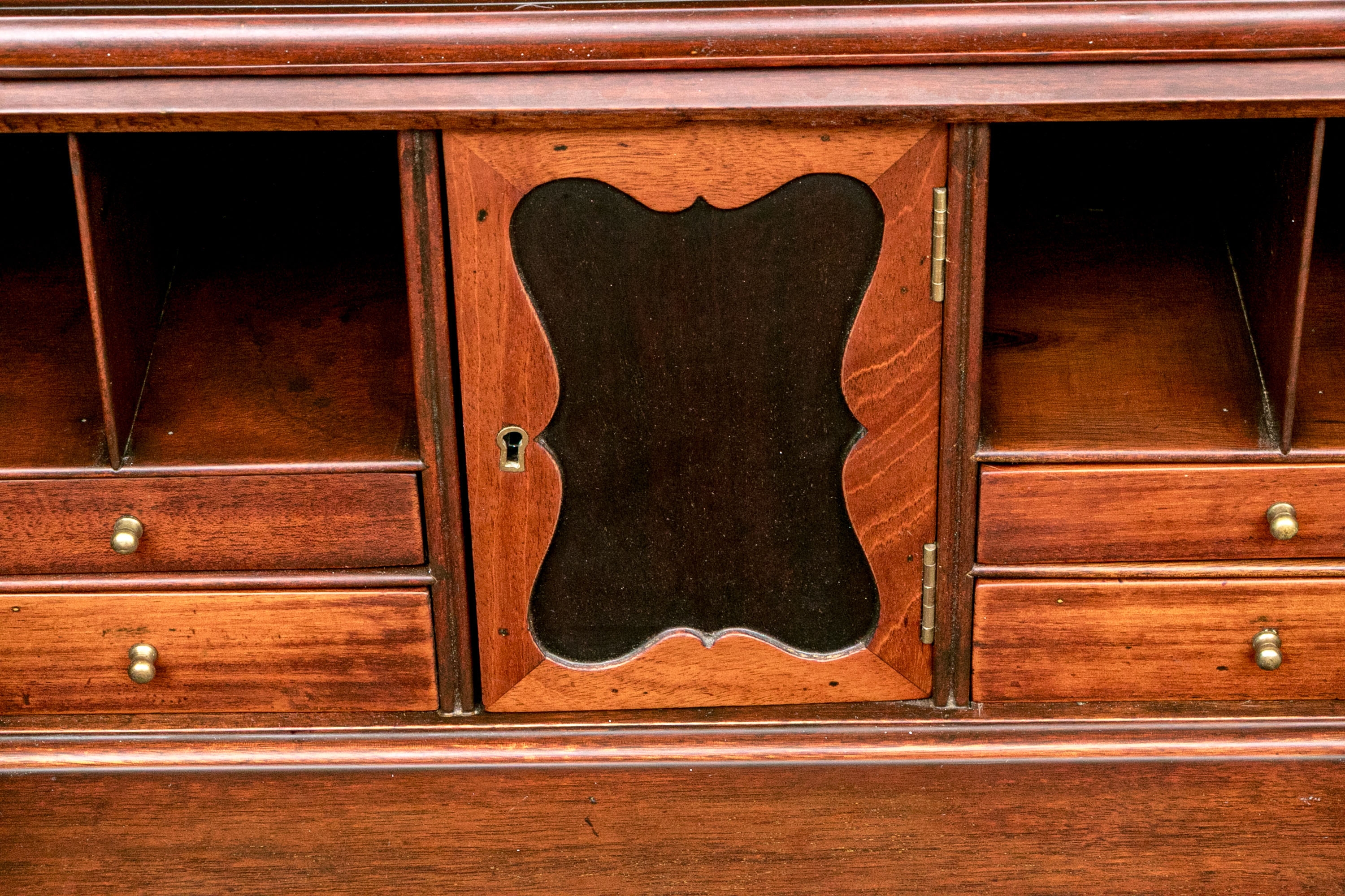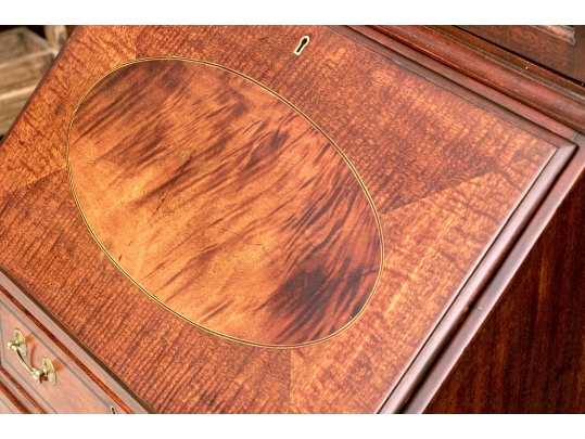 The lower case slant front with a figured wood medallion opening to cubby holes, drawers and a center door compartment. The chest with four long graduated drawers with ebonized string inlays, brass bales and key holes (lacking the key). The carved skirt rail raised on bracket feet.