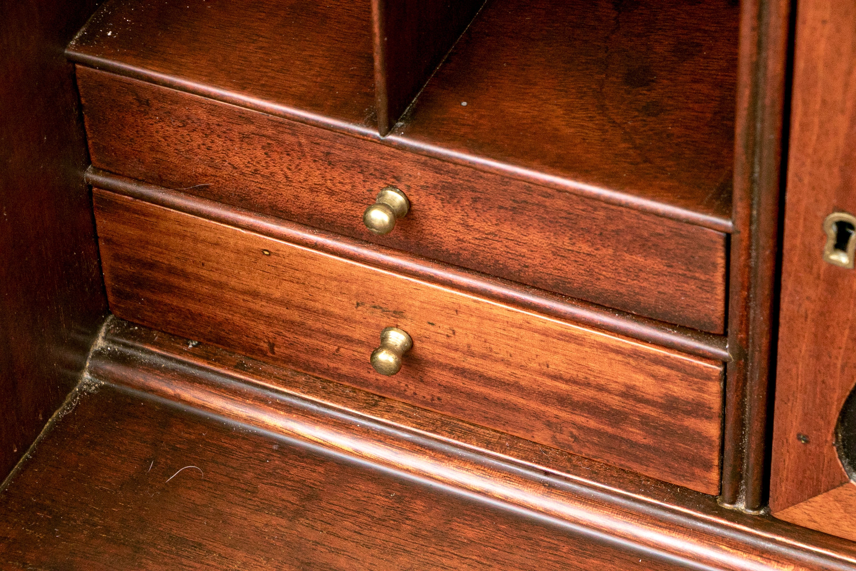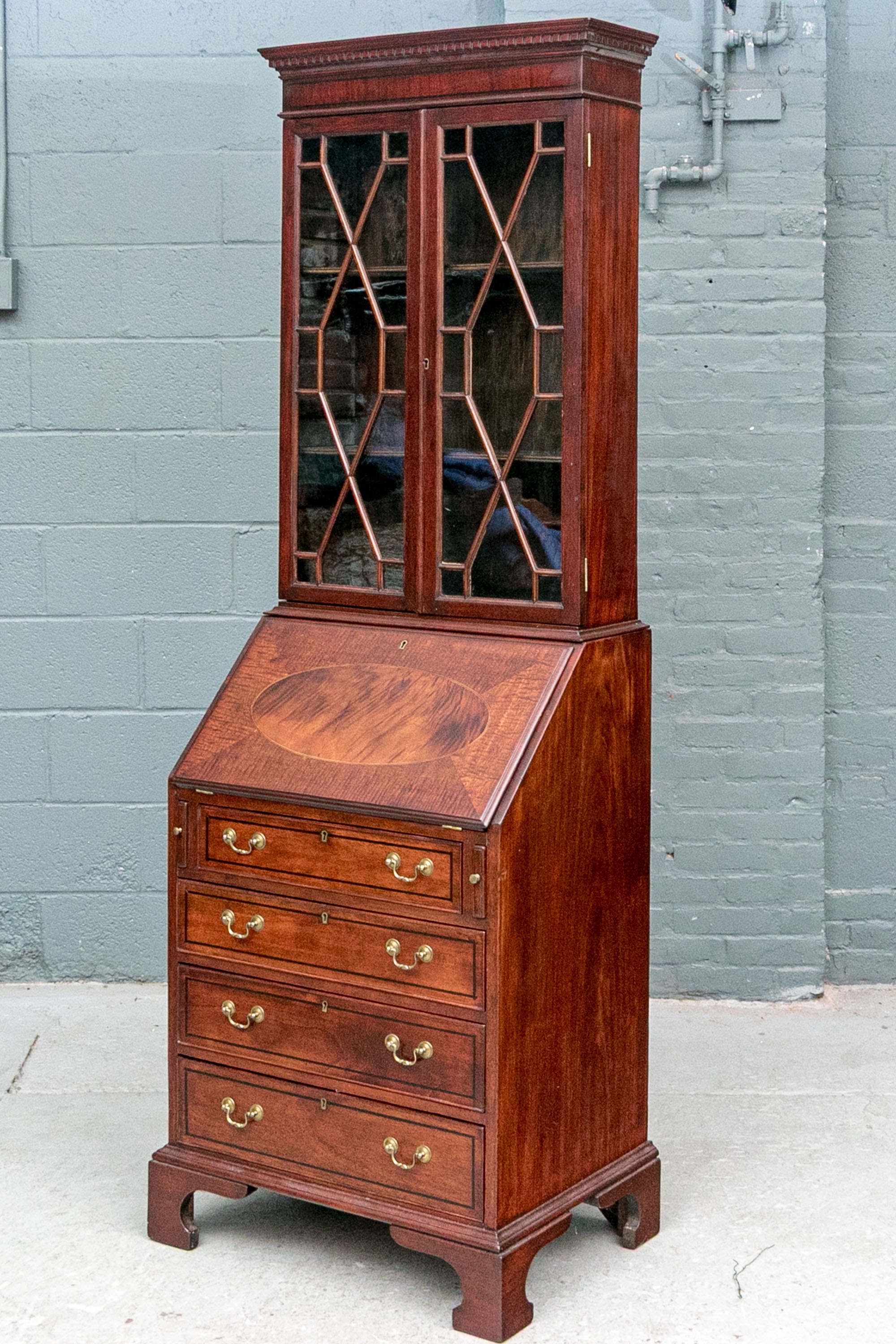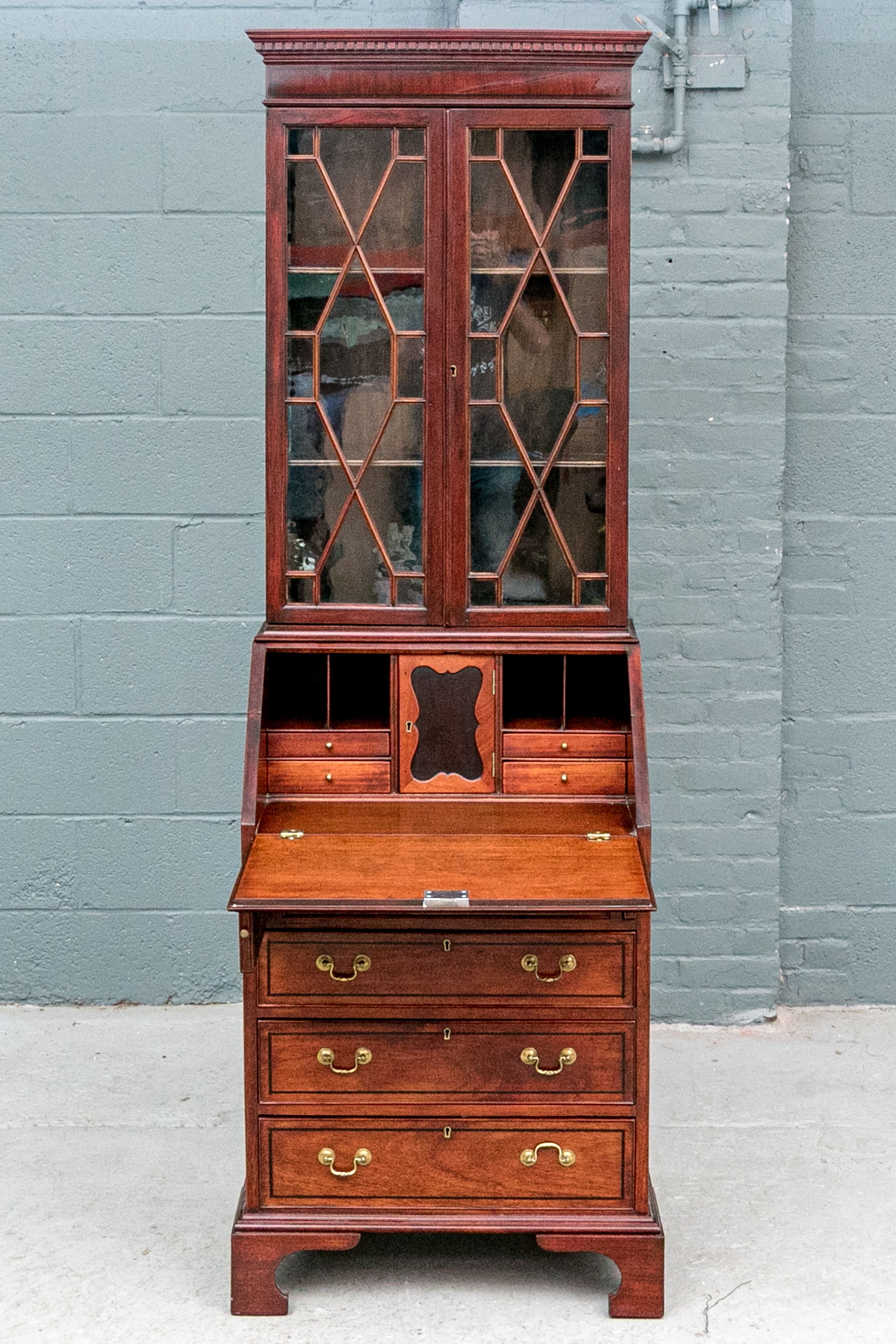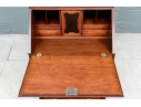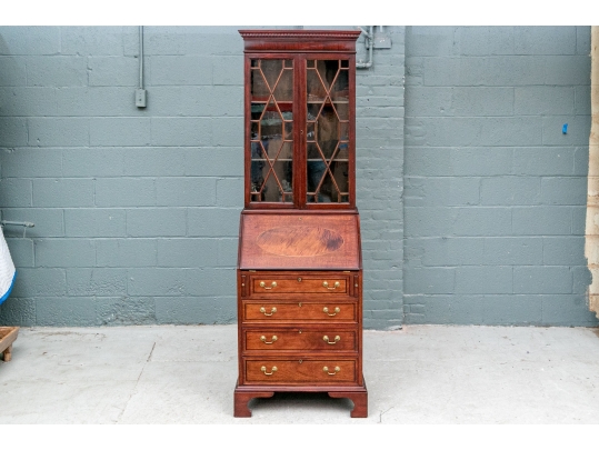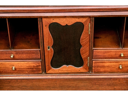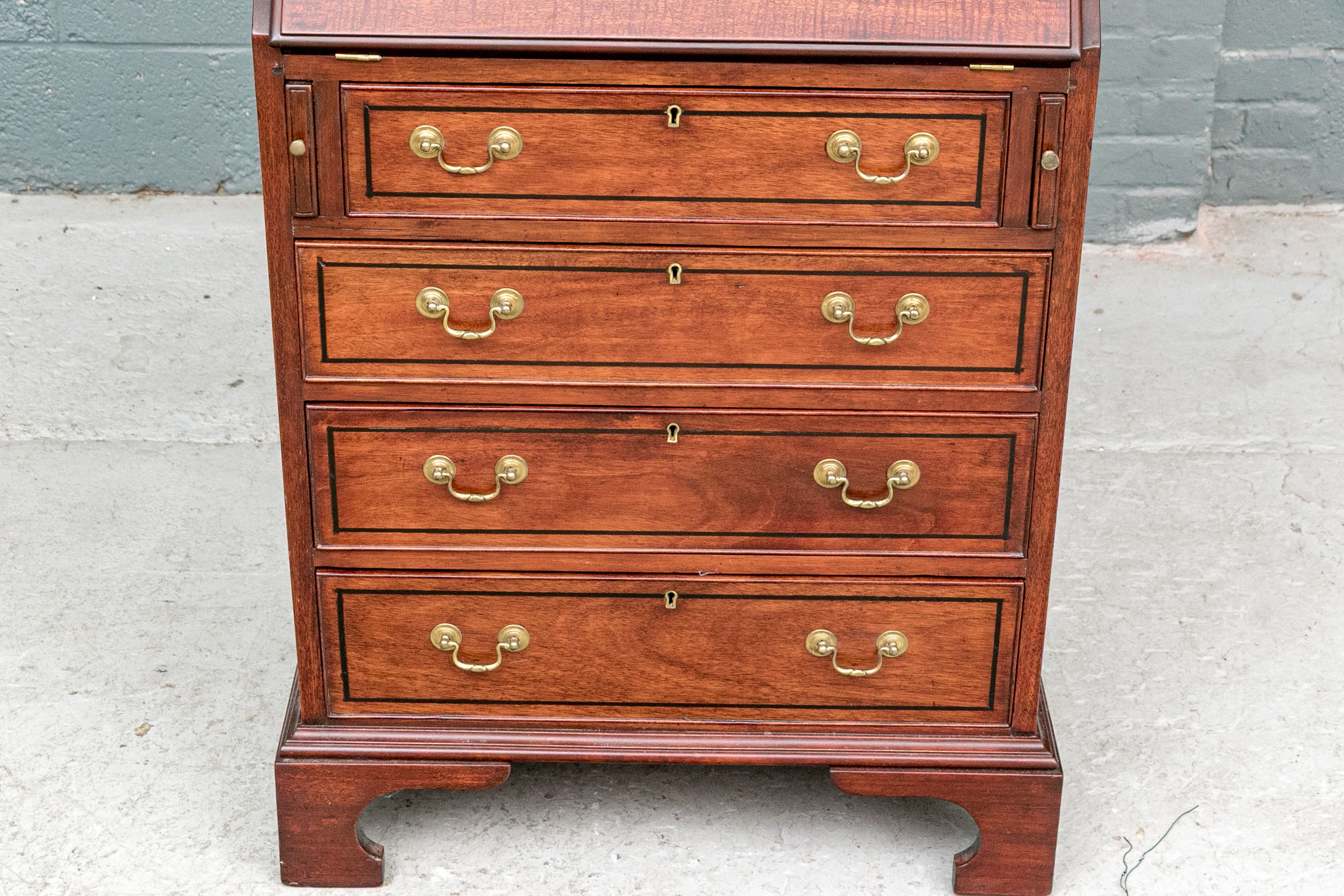 The lower case slant front with a figured wood medallion opening to cubby holes, drawers and a center door compartment. The chest with four long graduated drawers with ebonized string inlays, brass bales and key holes (lacking the key). The carved skirt rail raised on bracket feet.