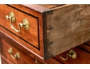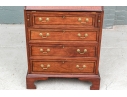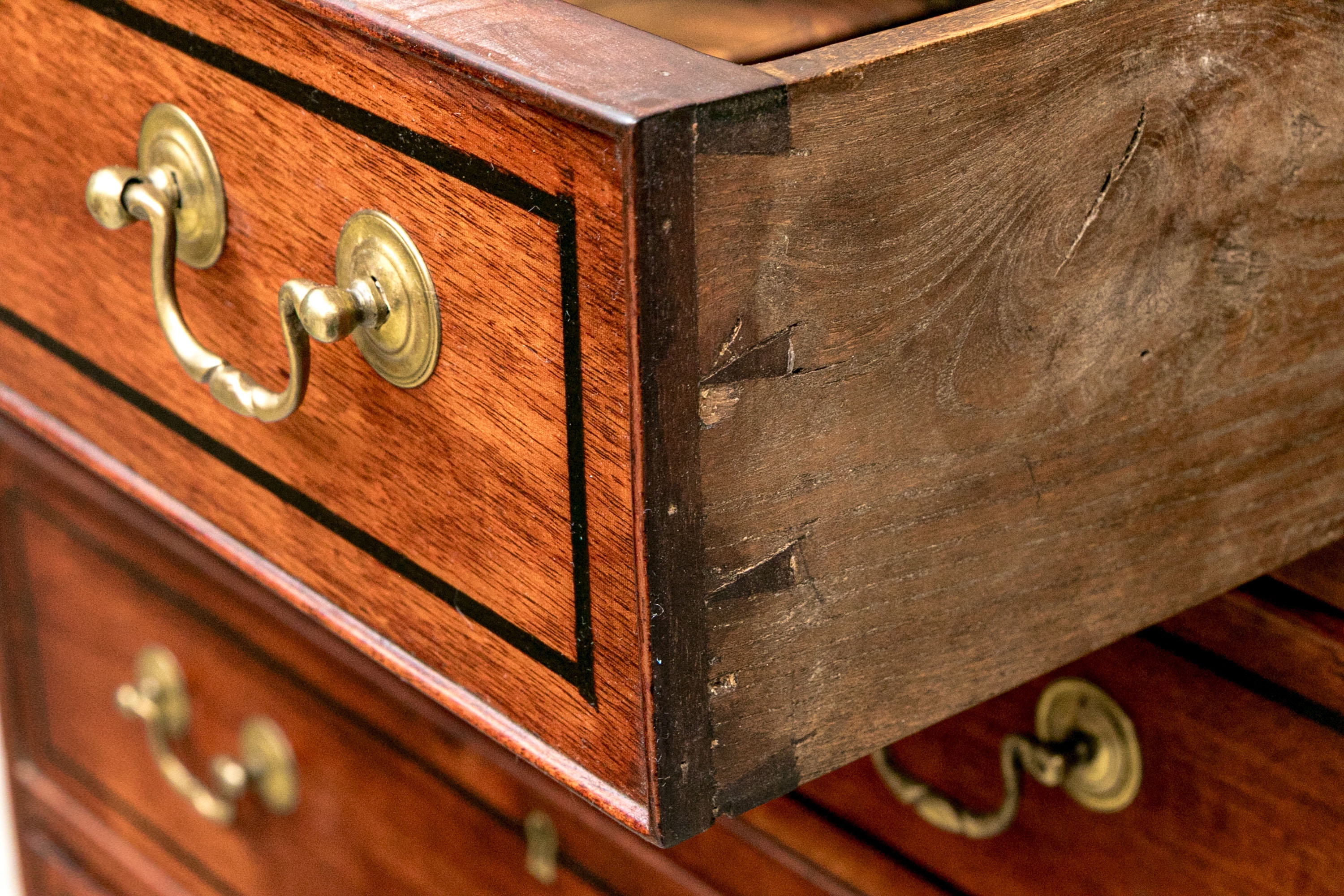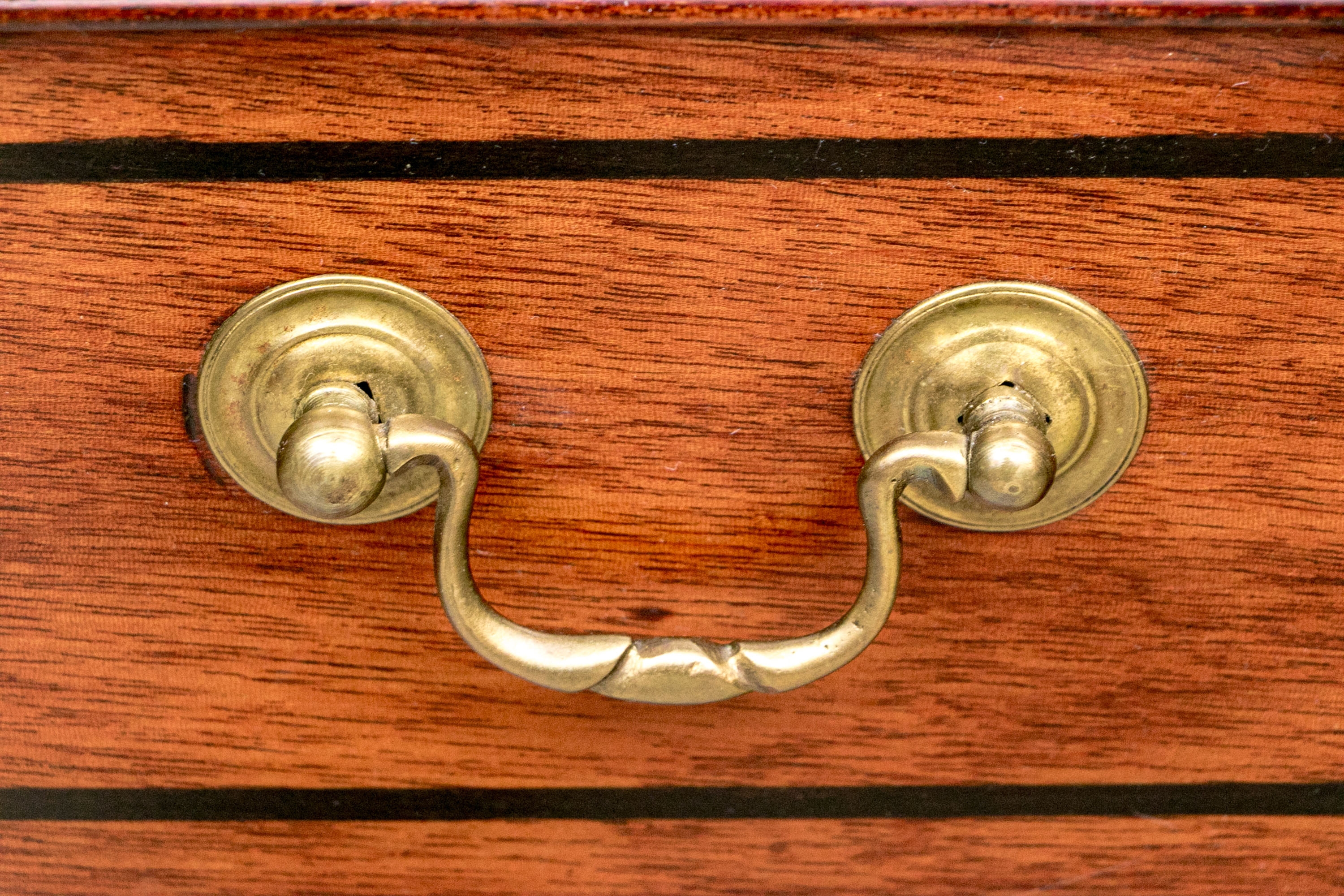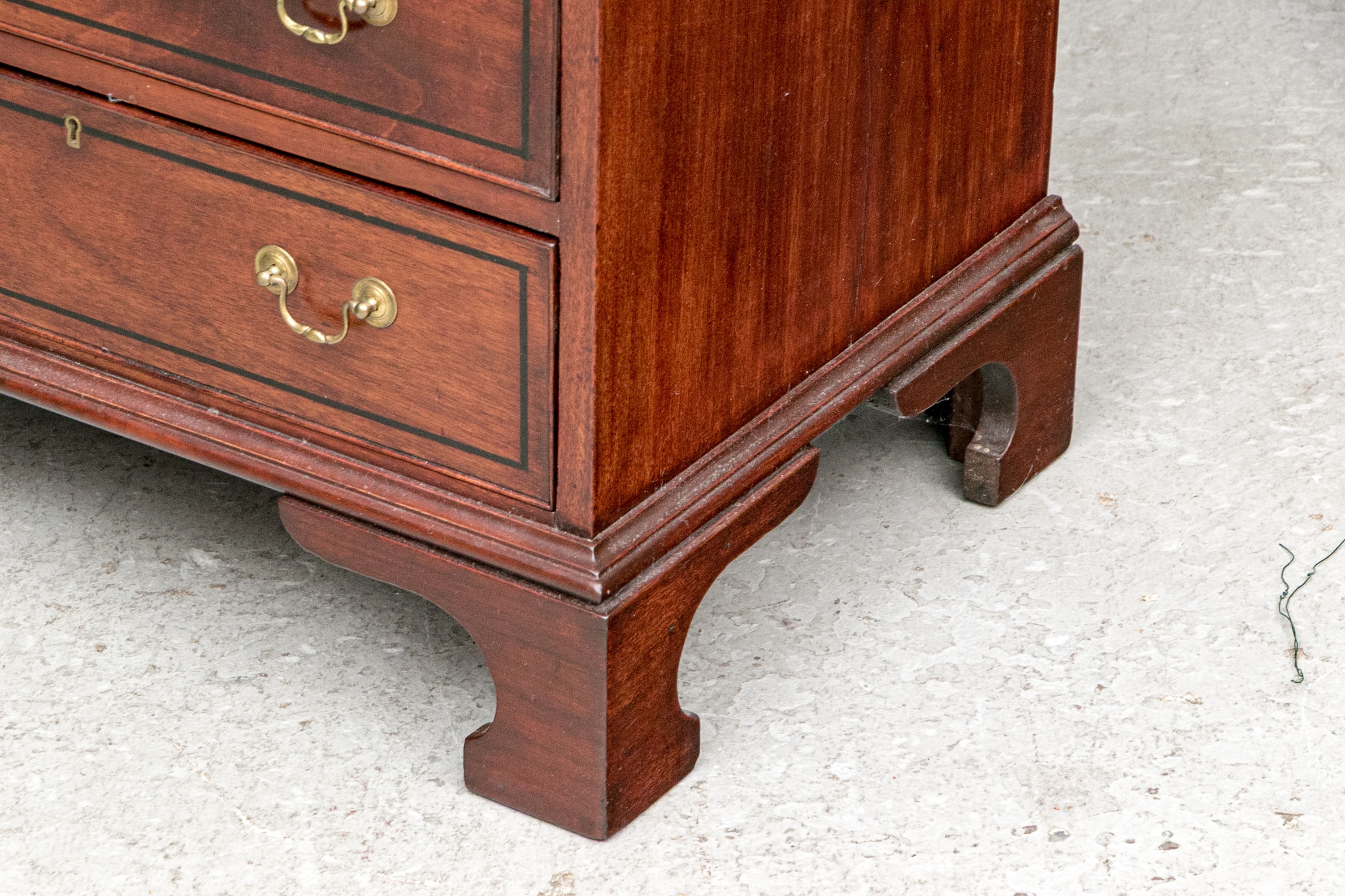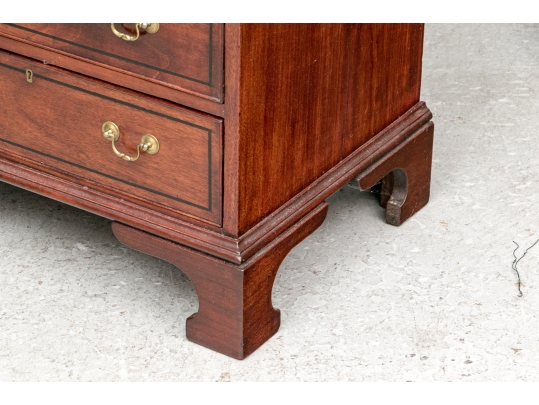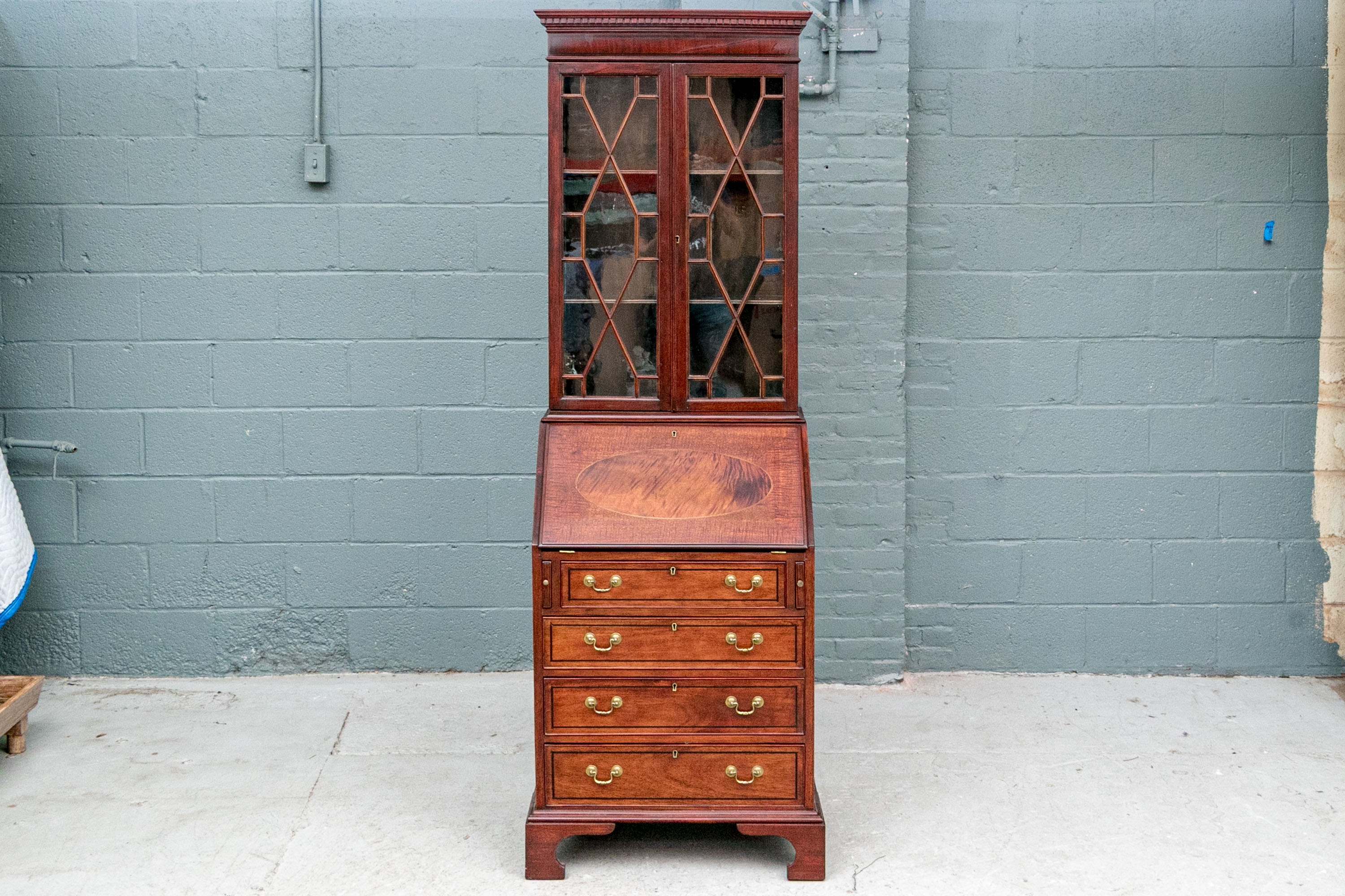 The lower case slant front with a figured wood medallion opening to cubby holes, drawers and a center door compartment. The chest with four long graduated drawers with ebonized string inlays, brass bales and key holes (lacking the key). The carved skirt rail raised on bracket feet.