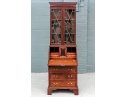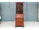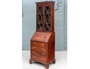 A well made diminutive mahogany bookcase secretary. The upper bookcase cabinet with a carved dentil cornice over the glass mullion doors and two adjustable interior shelves. Lacking a key.