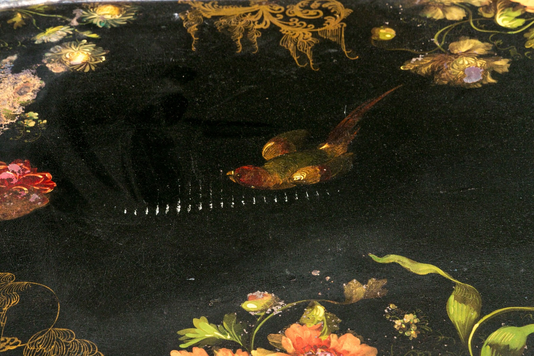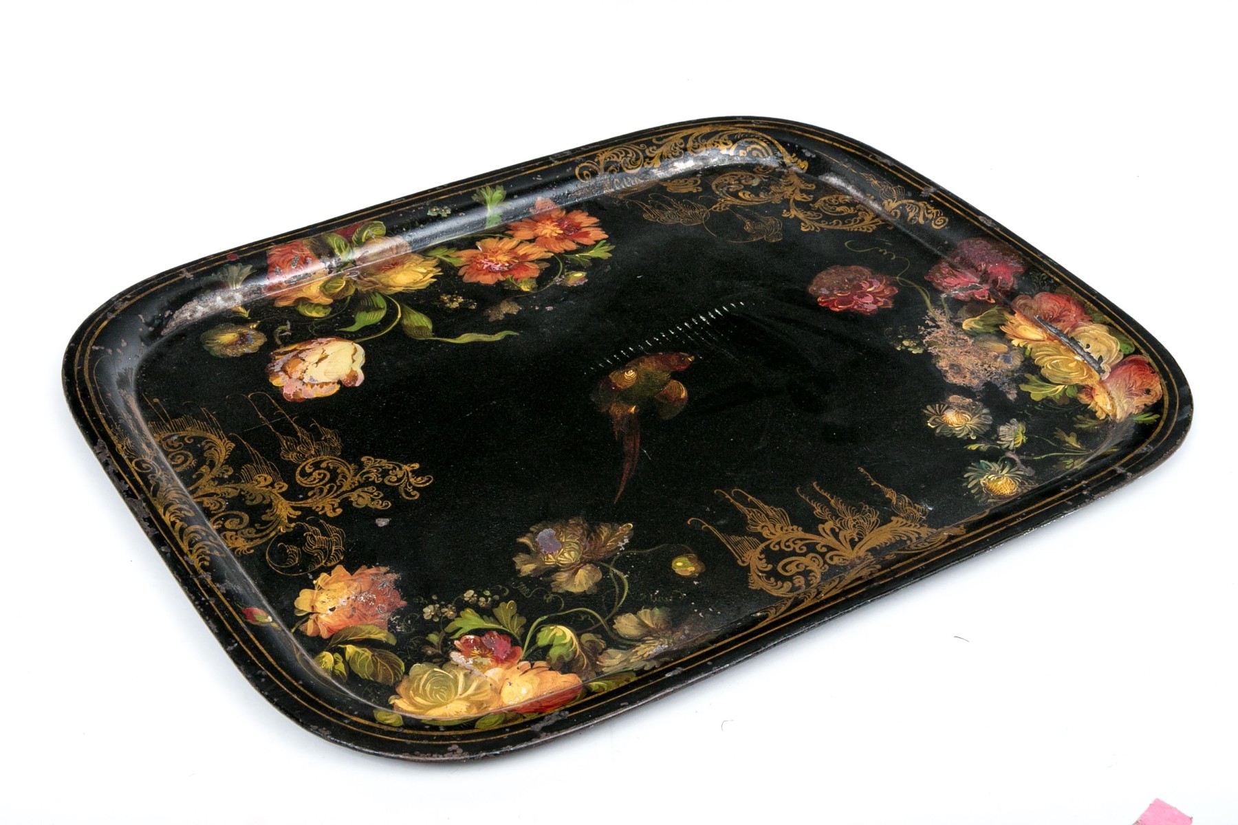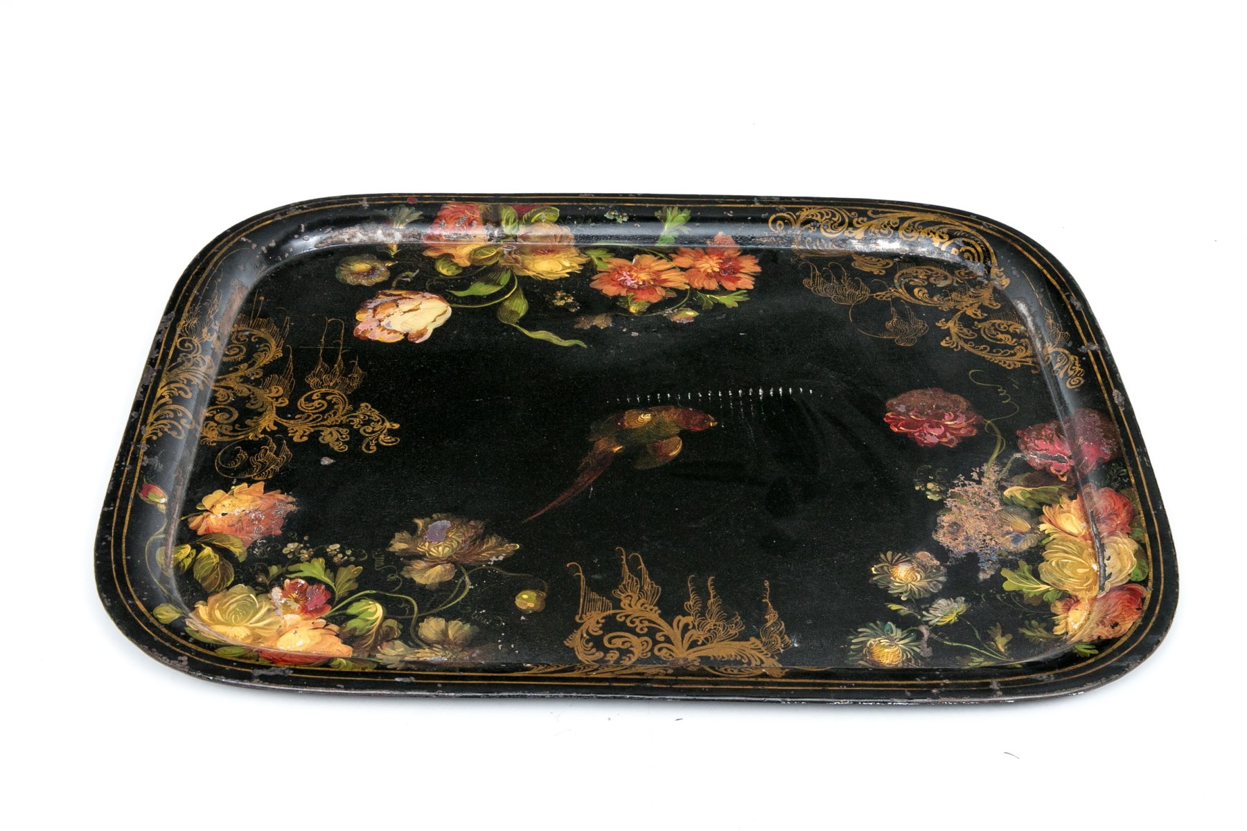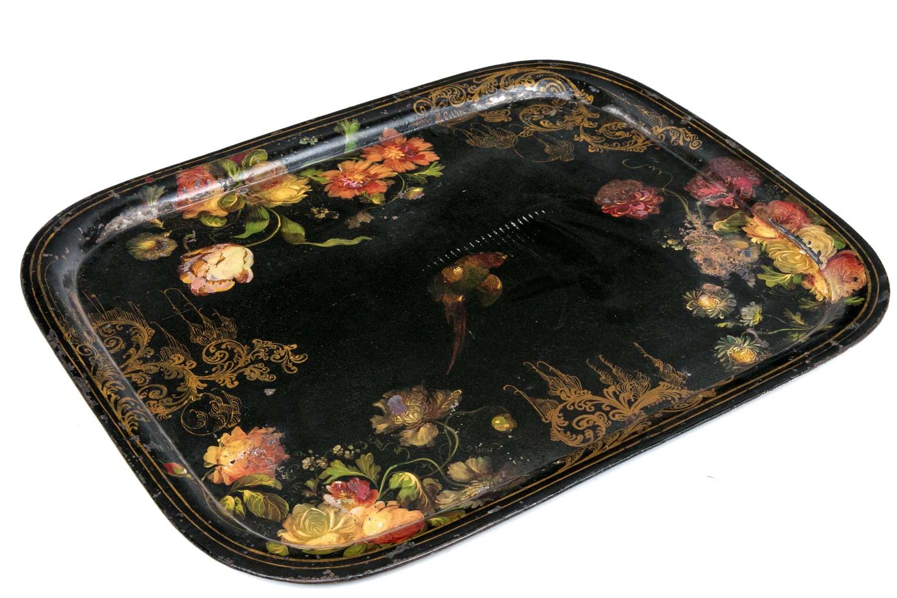 A lovely large black tole rectangular tray with colorful floral decoration and a long tailed parrot in the center. With three gilt scrolled details on the sides.