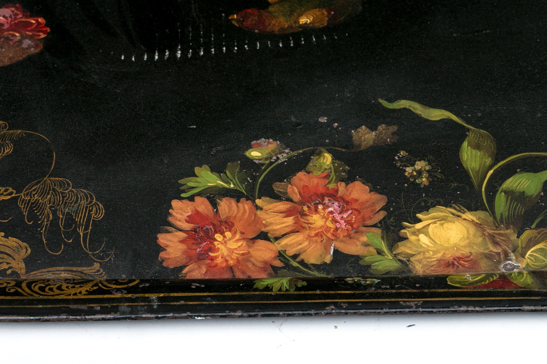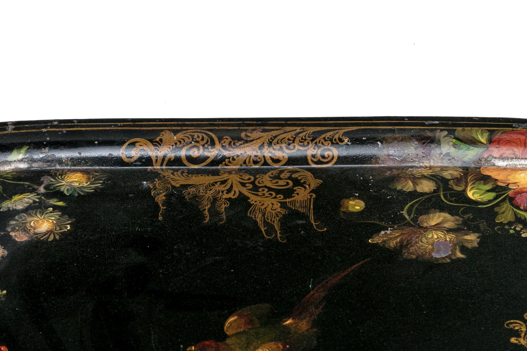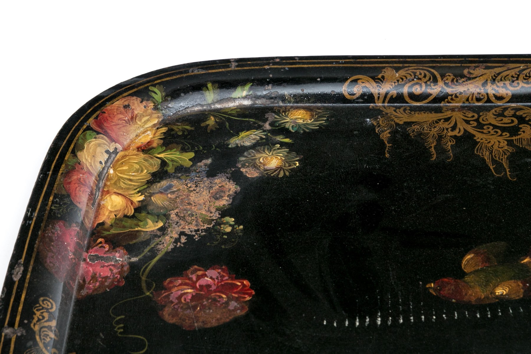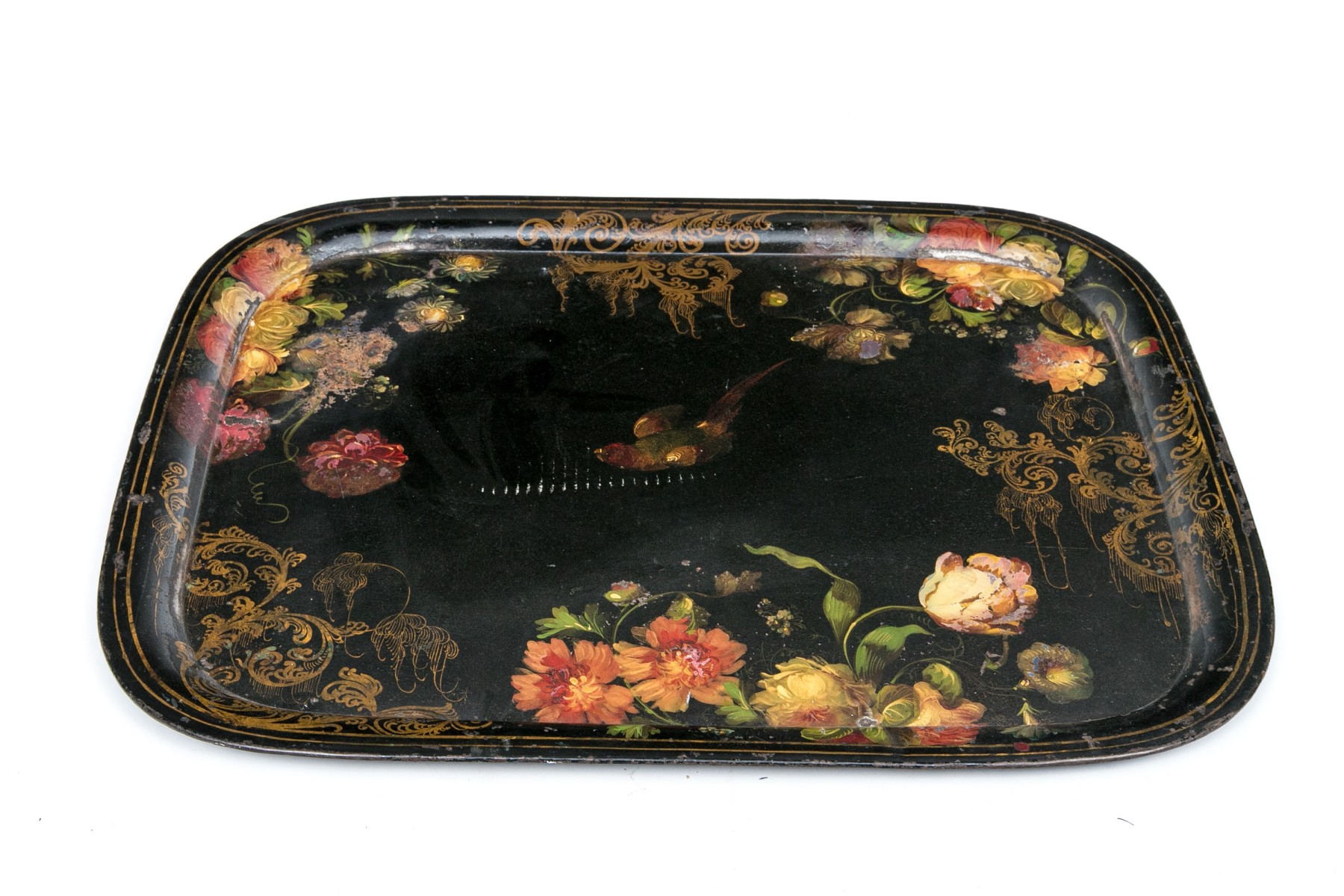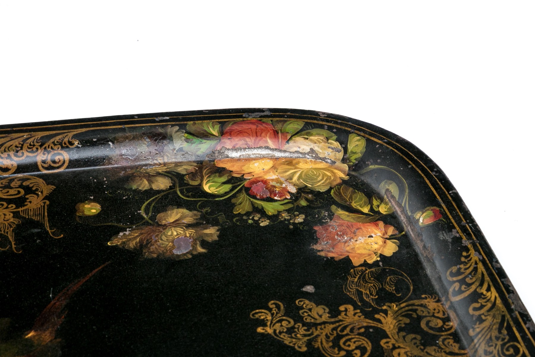 A lovely large black tole rectangular tray with colorful floral decoration and a long tailed parrot in the center. With three gilt scrolled details on the sides.