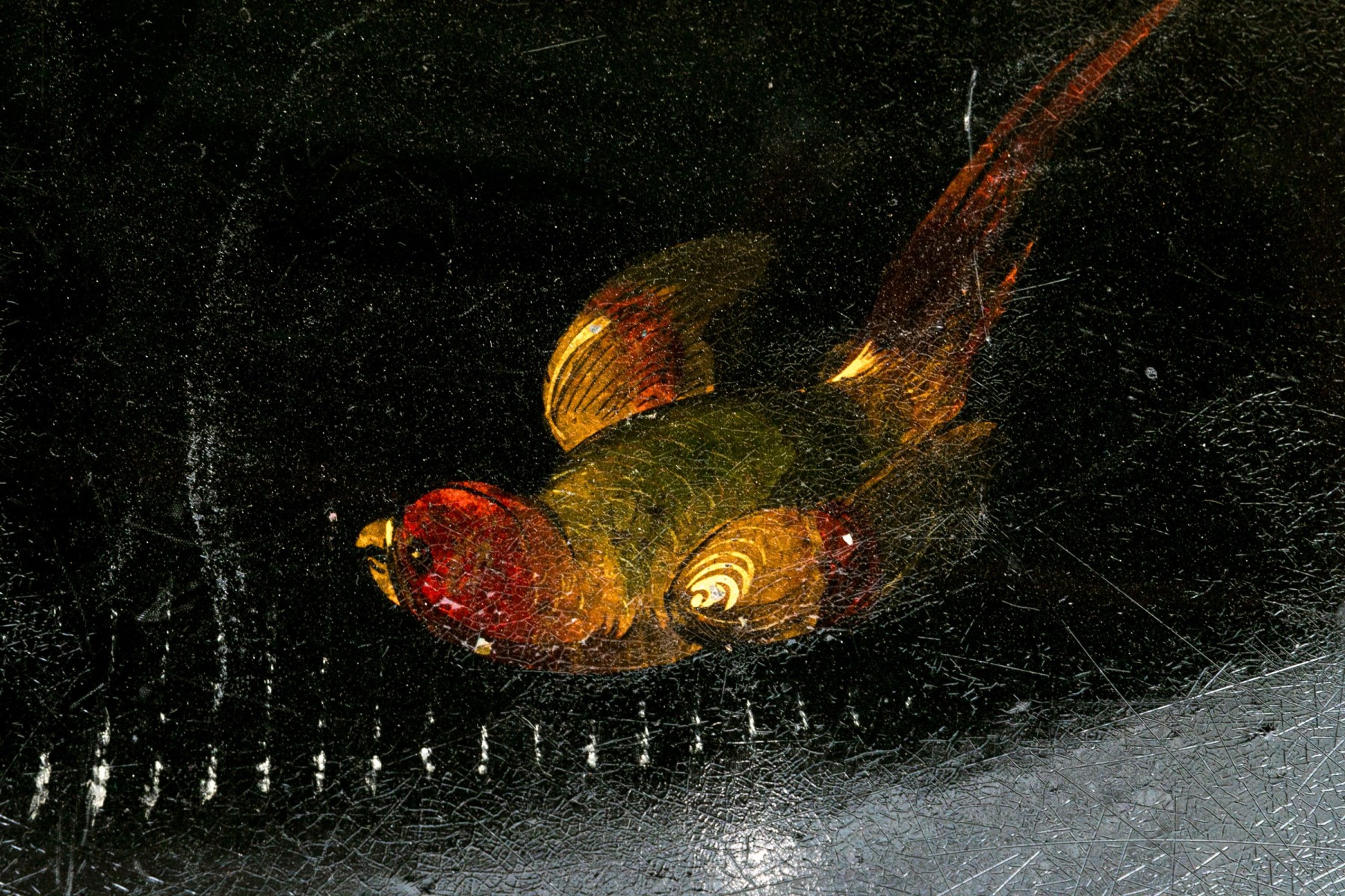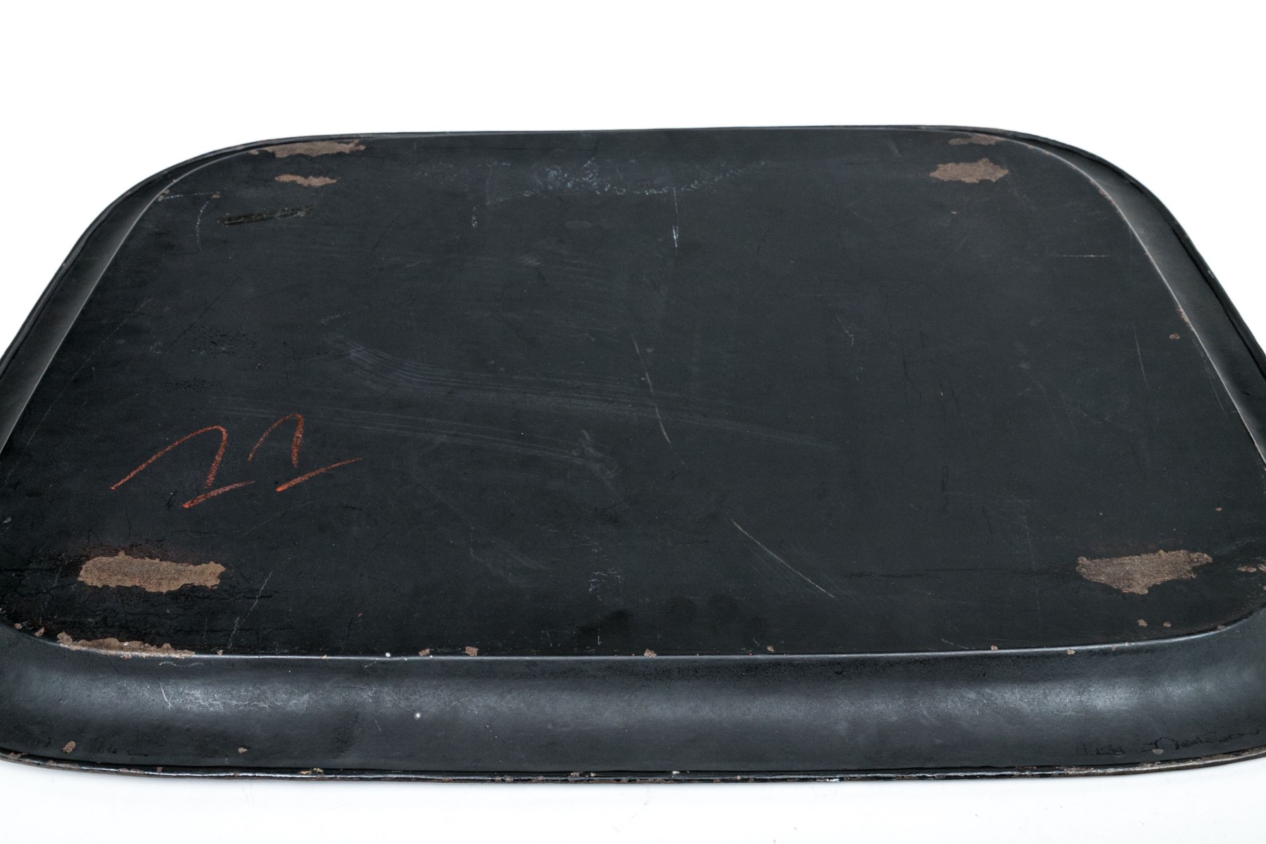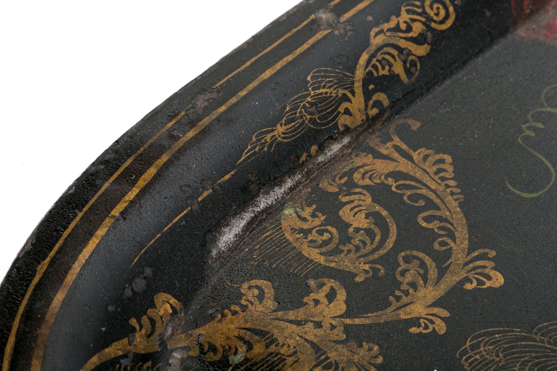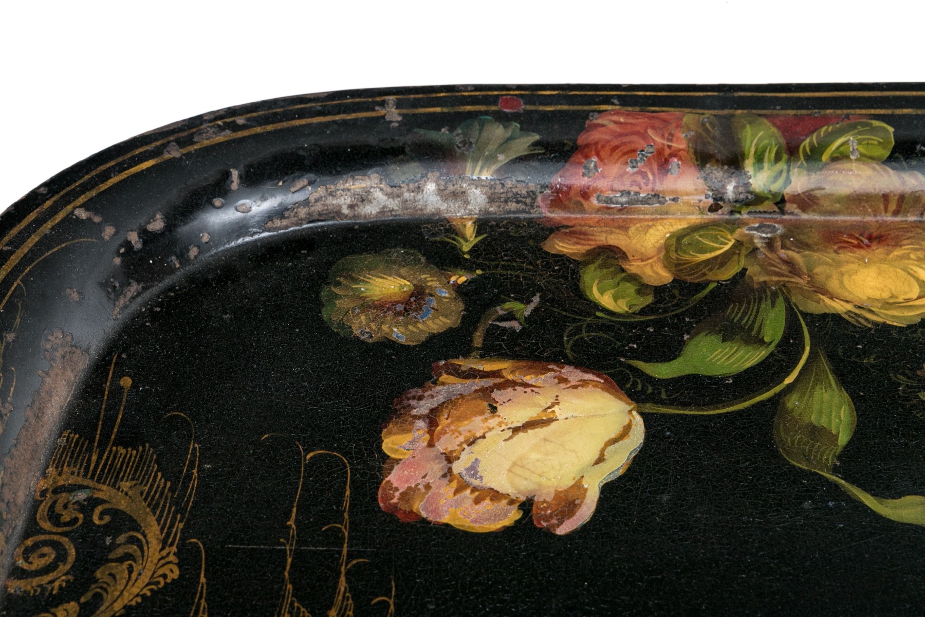 A lovely large black tole rectangular tray with colorful floral decoration and a long tailed parrot in the center. With three gilt scrolled details on the sides.