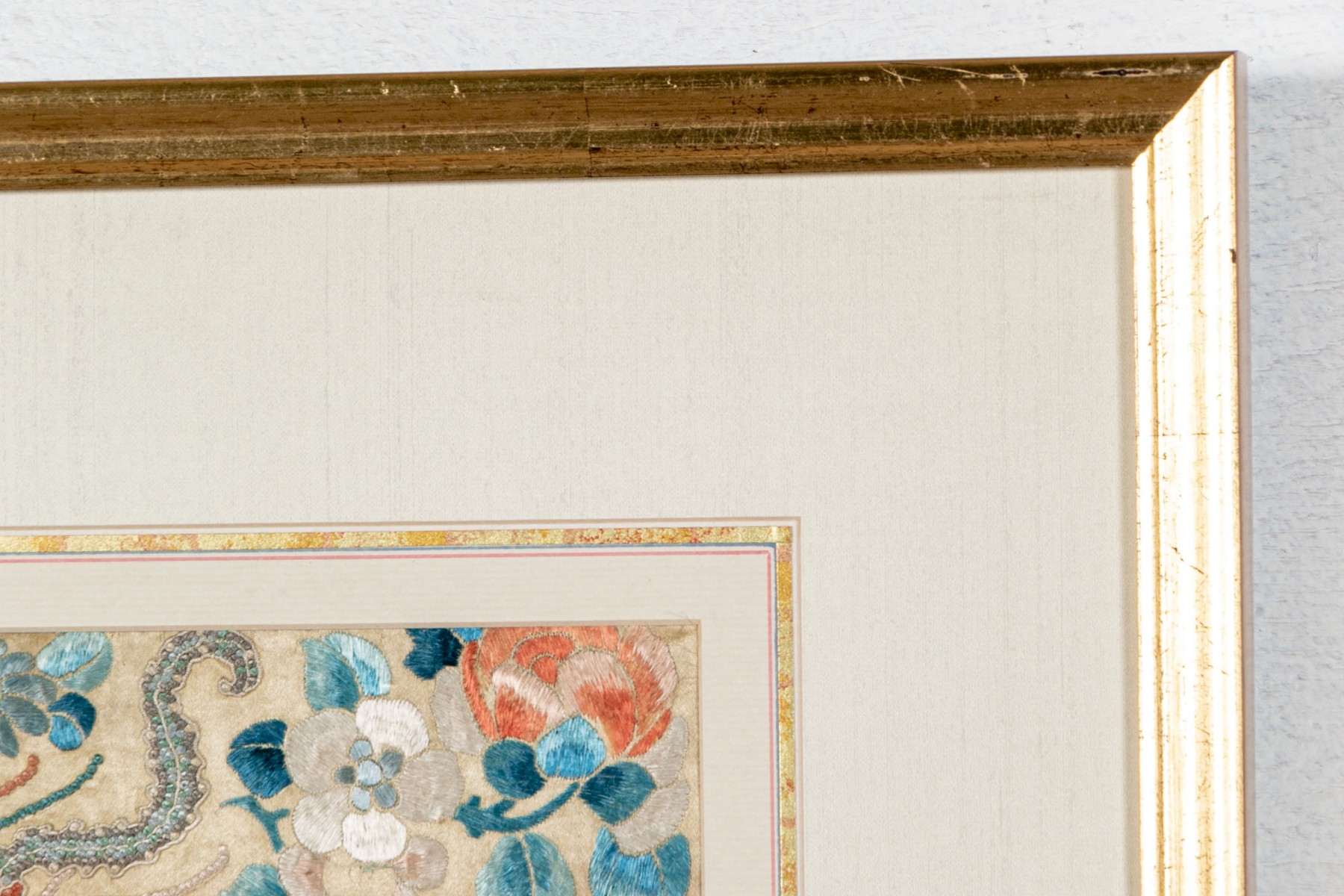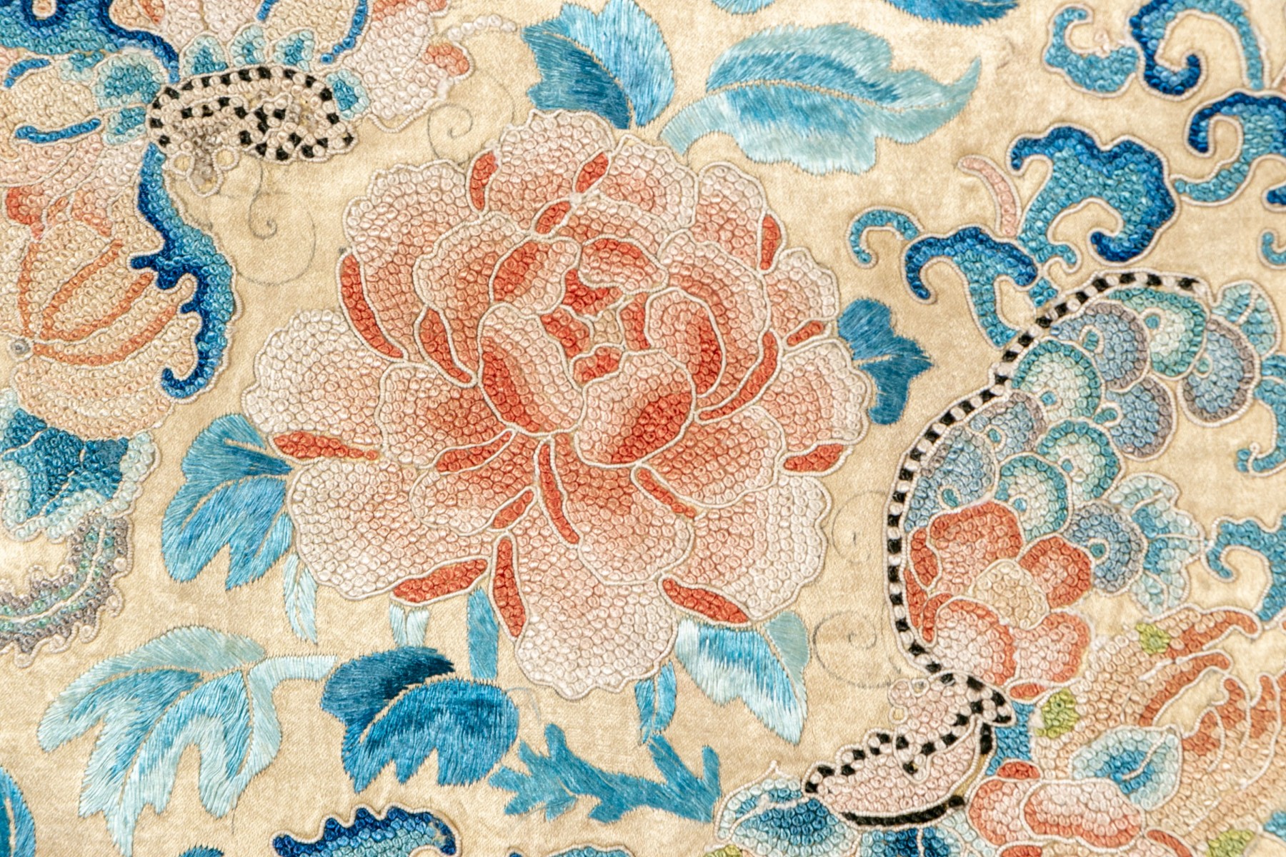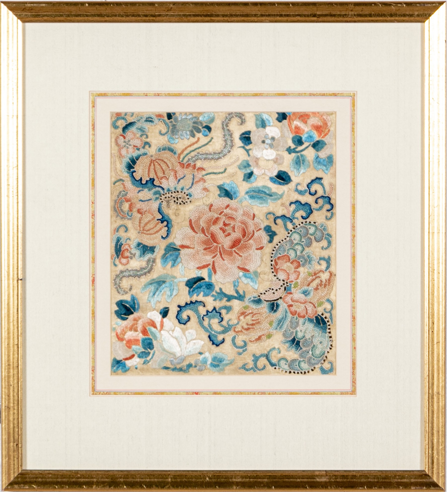 A finely embroidered panel with coral pink and white flowers and blue scrolled stems on pale tan ground.