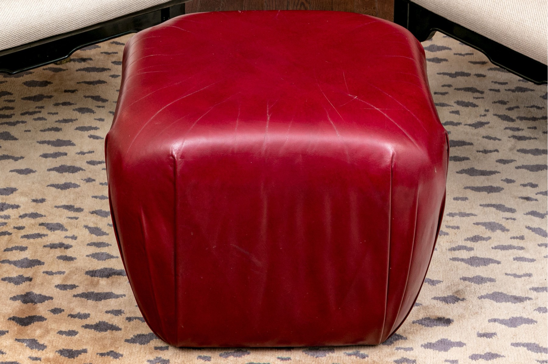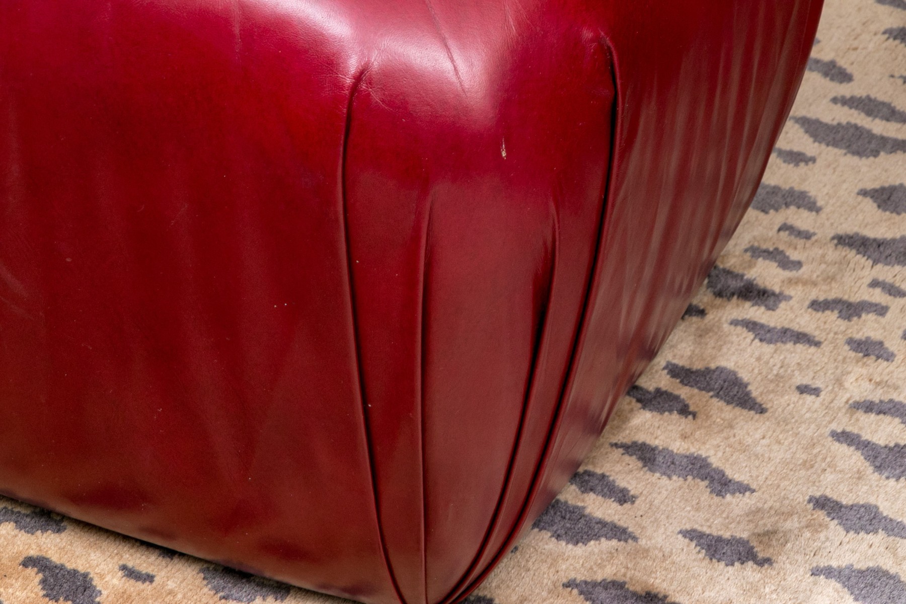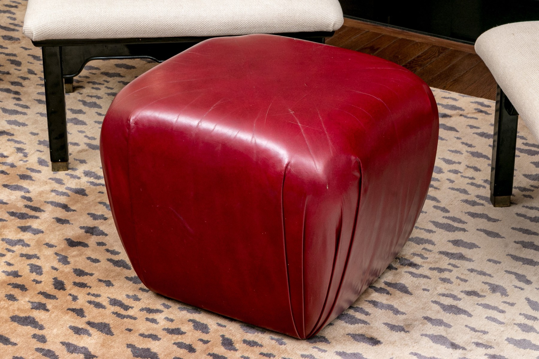 A cube shaped ottoman with slightly tapering sides in quality red leather with pleated corners.
