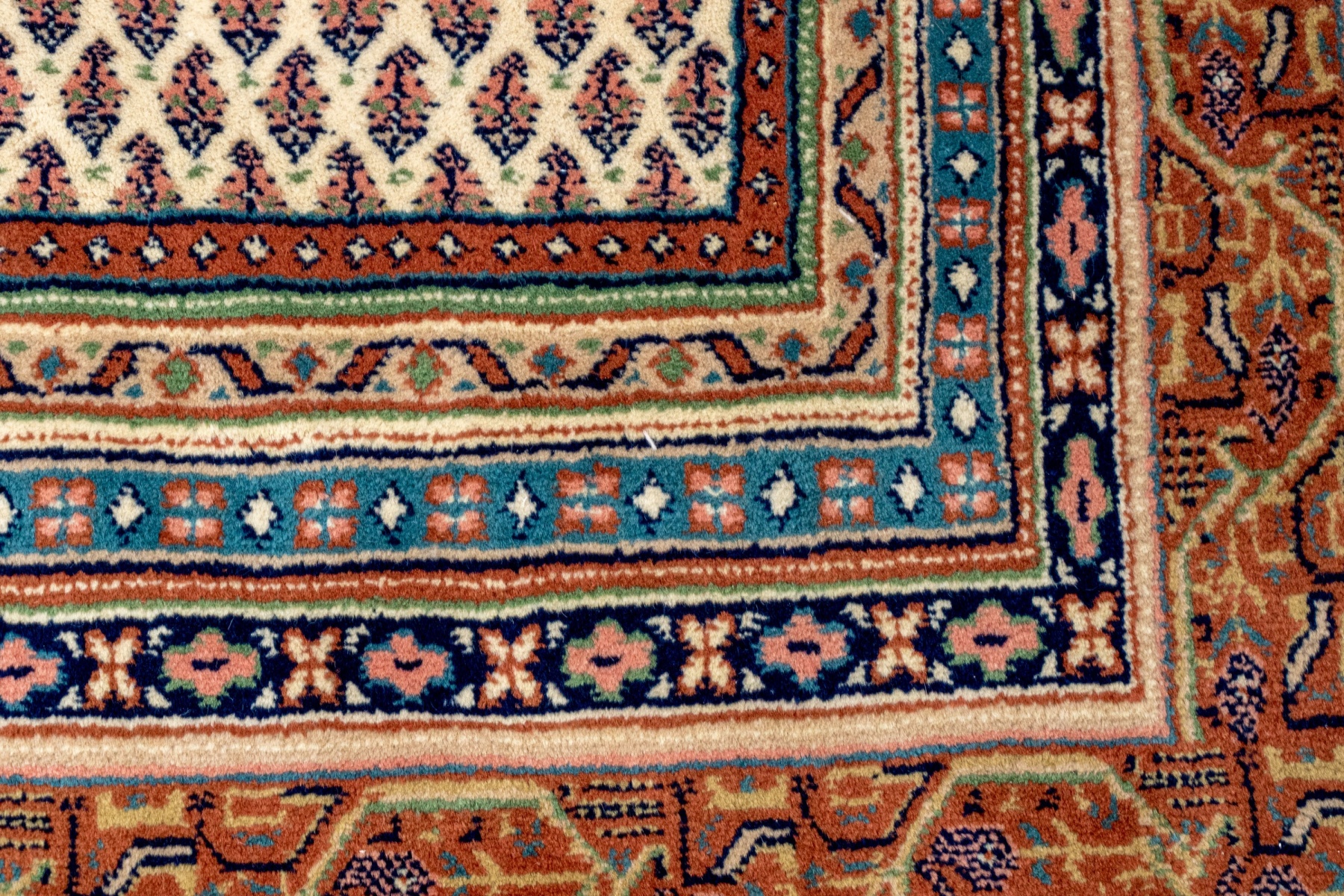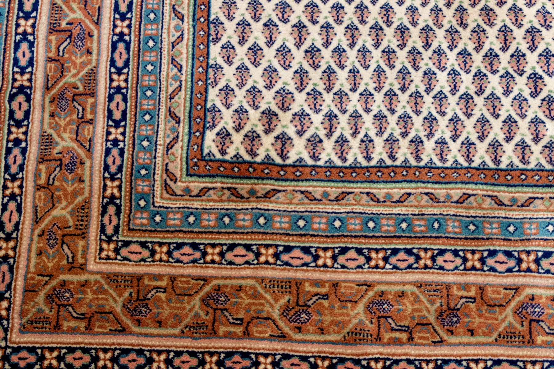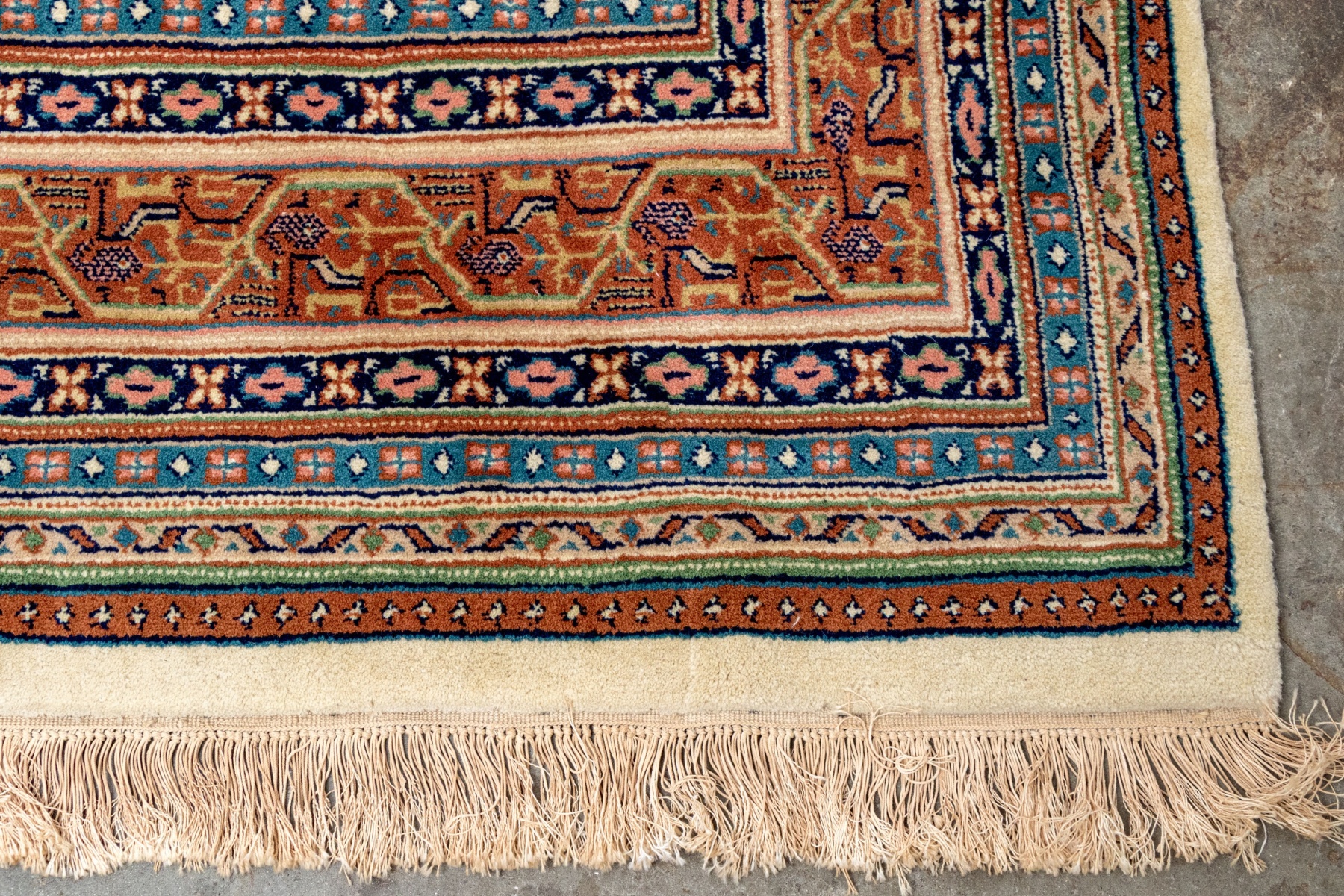 A gorgous hand-knotted wool carpet with an ornately decorated central field on warm hued ground. The pattern is evenly spaced lending a geometric appearance. The central field is marvelously encompassed with numerous, ornately decorated border guards.