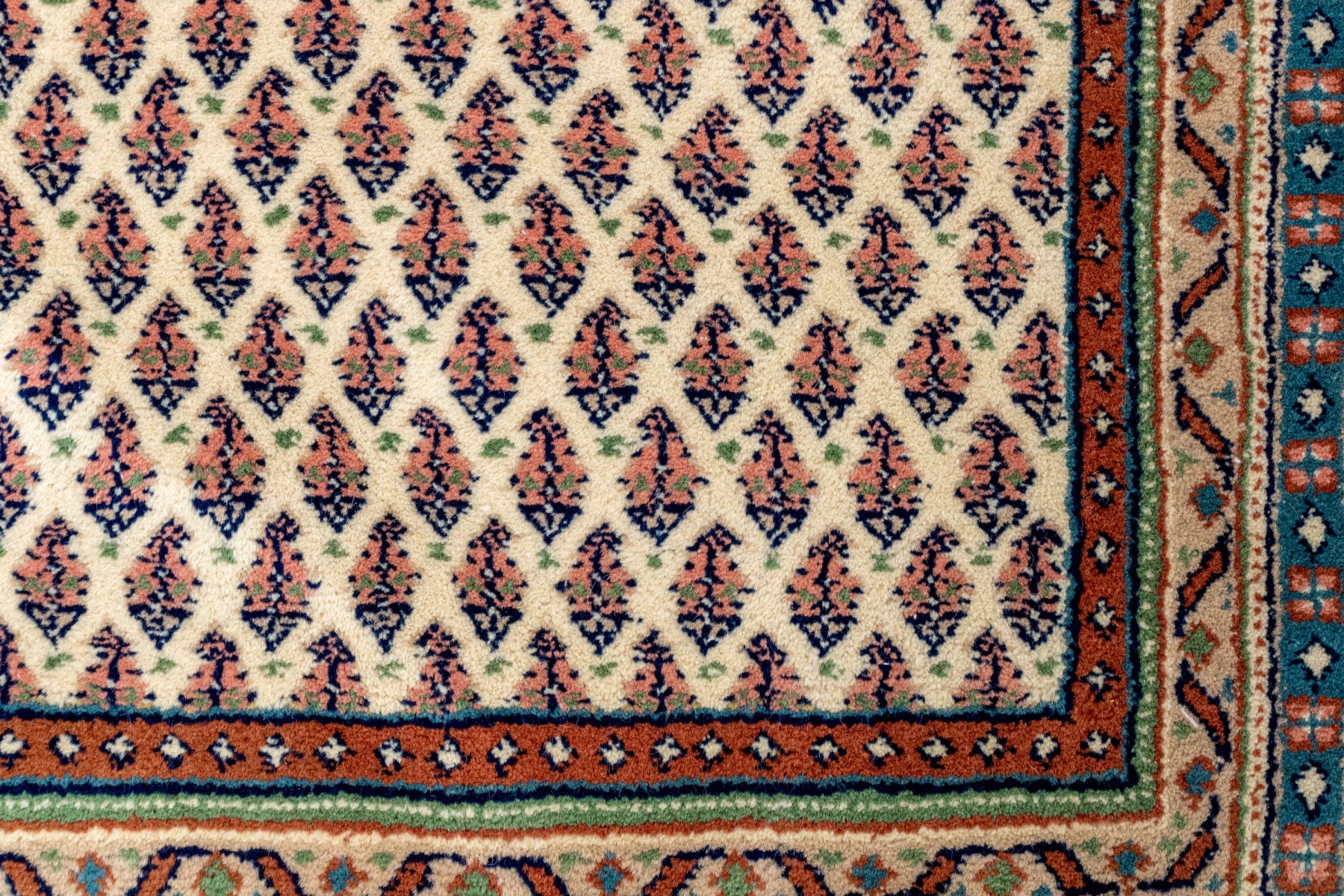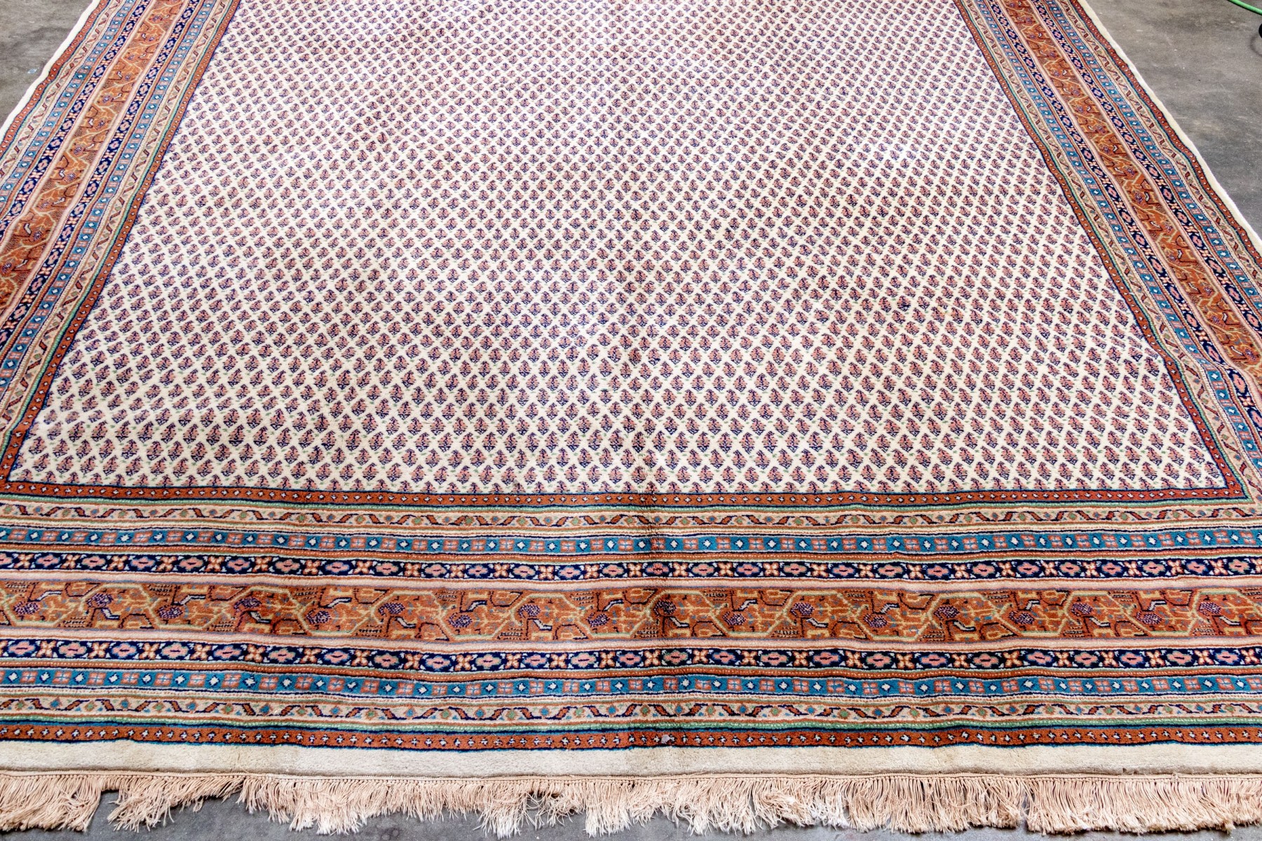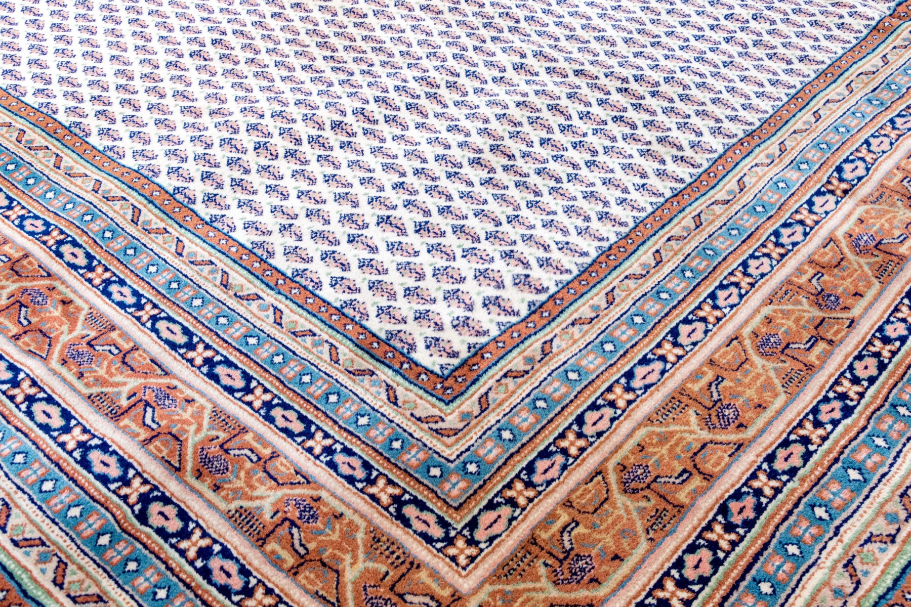 A gorgous hand-knotted wool carpet with an ornately decorated central field on warm hued ground. The pattern is evenly spaced lending a geometric appearance. The central field is marvelously encompassed with numerous, ornately decorated border guards.