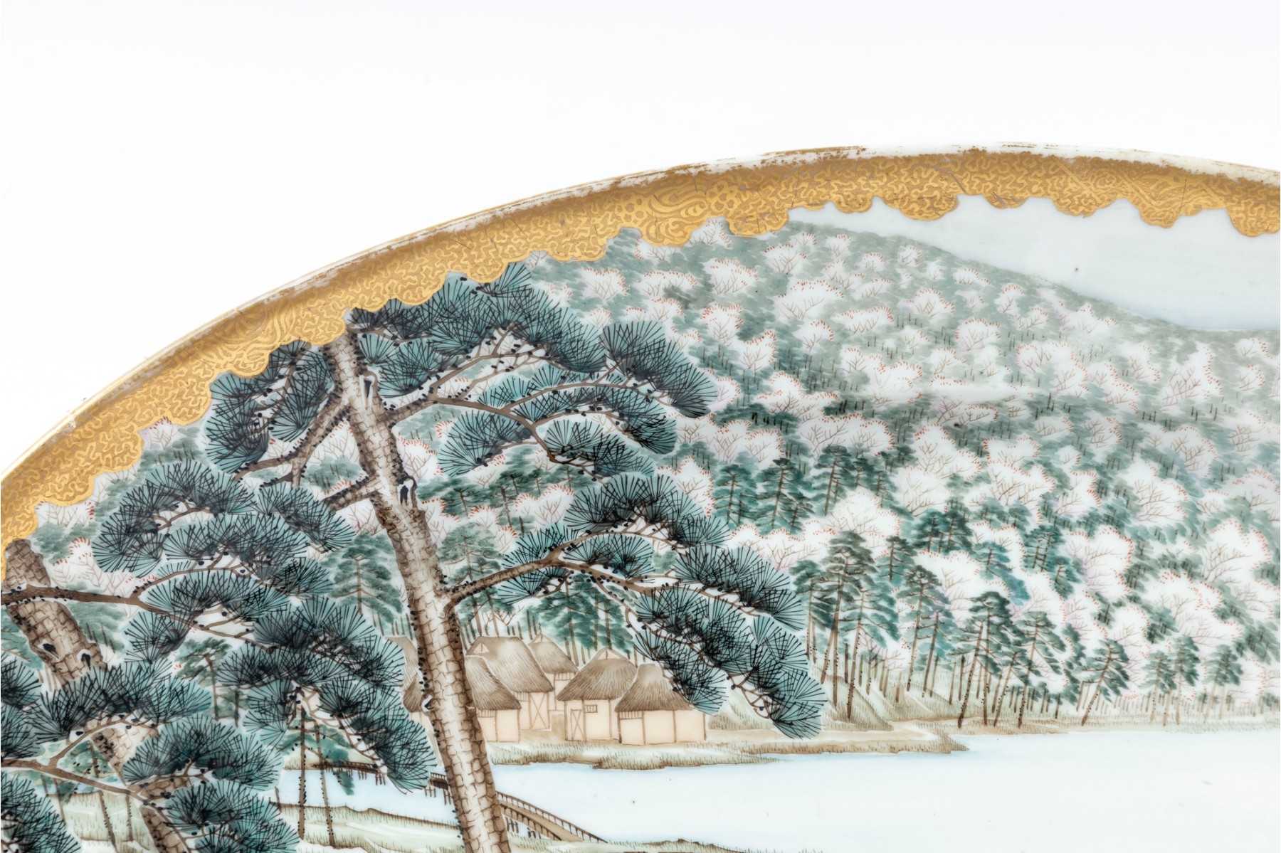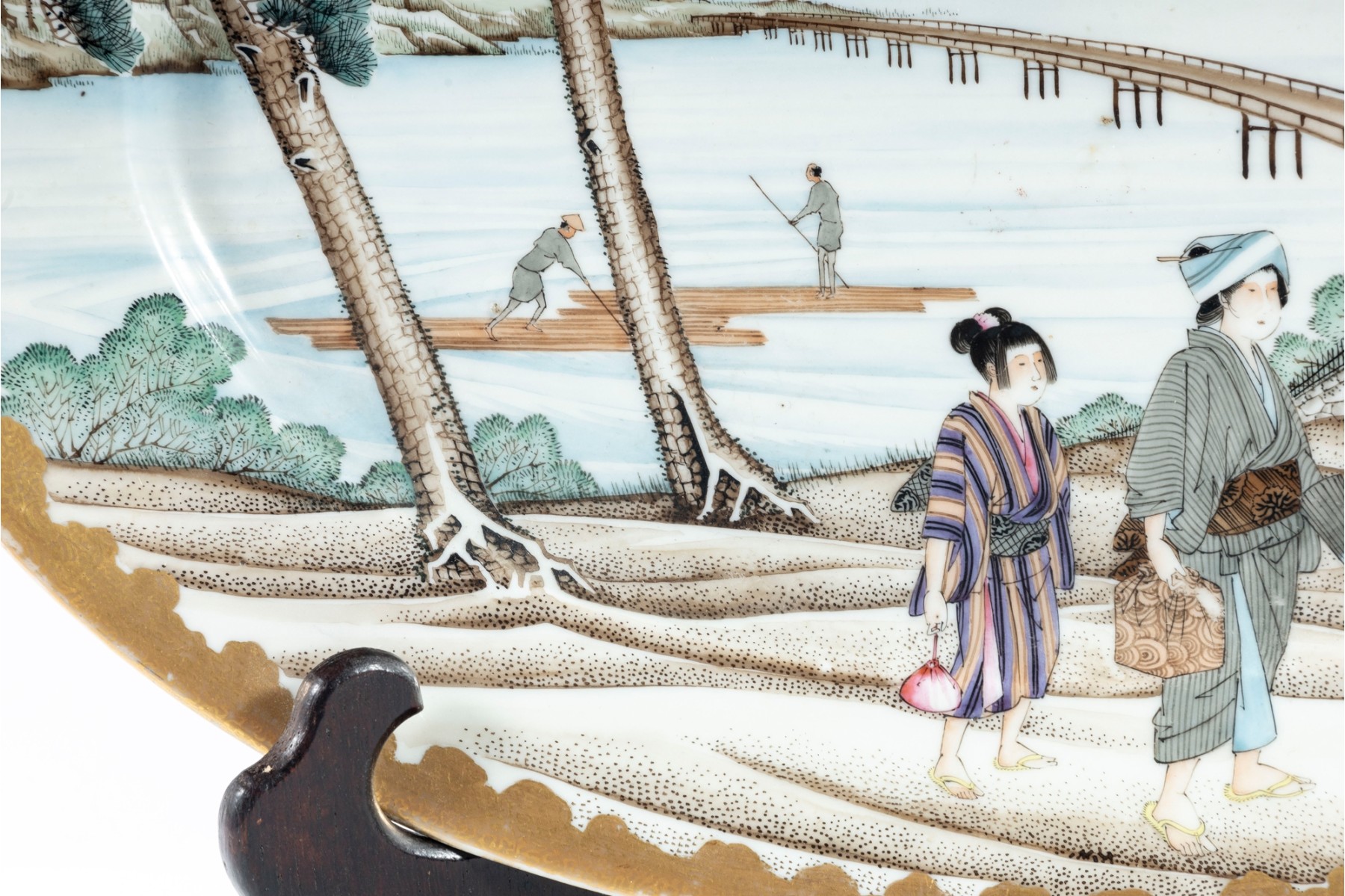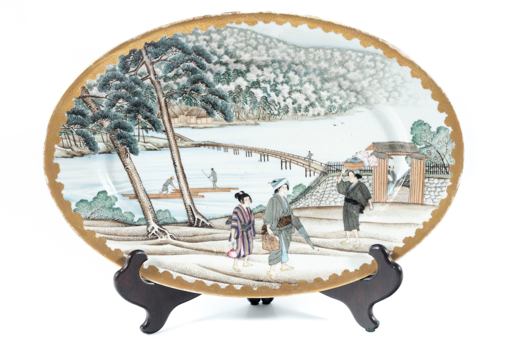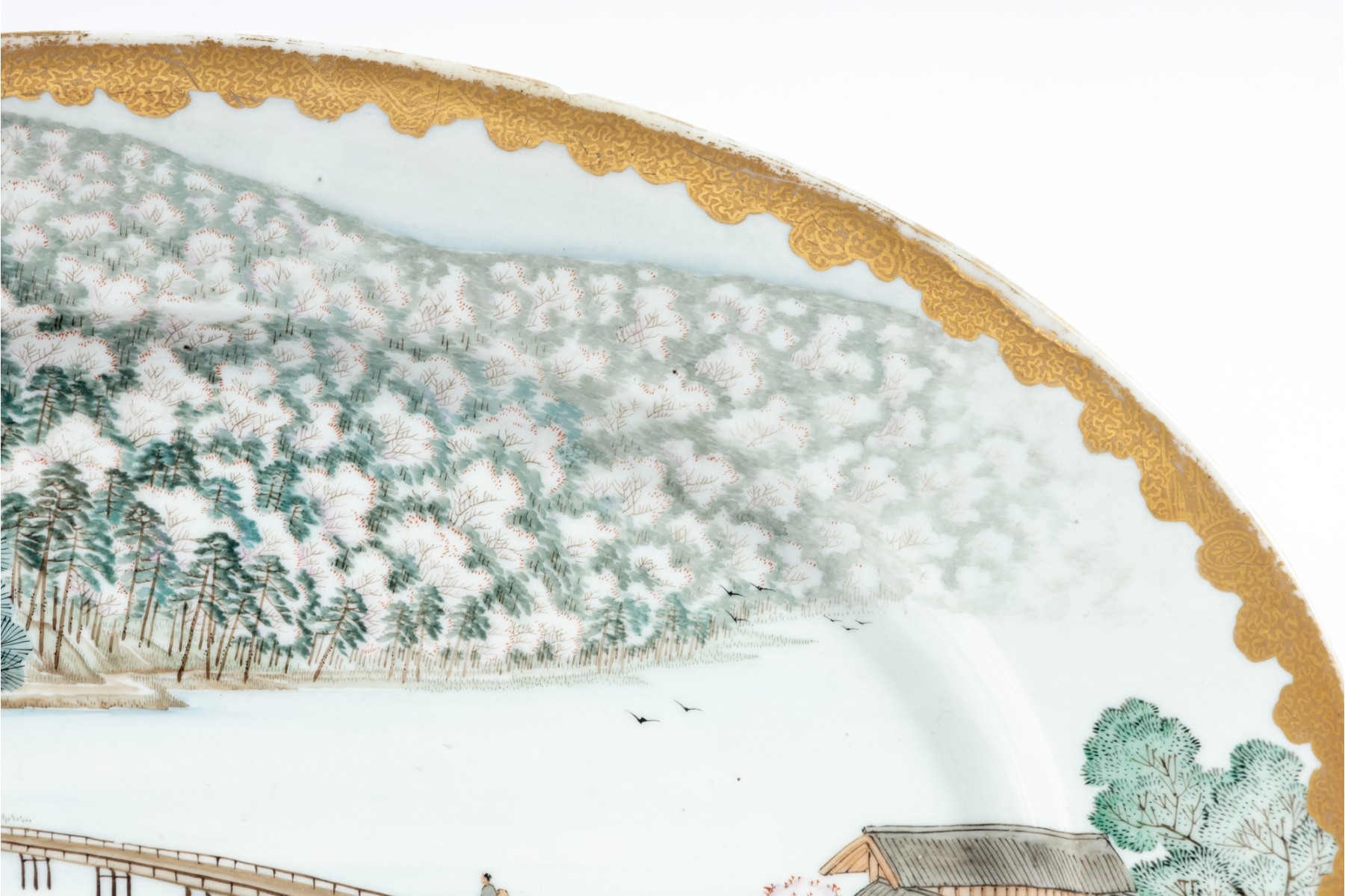 A fine quality Japanese oval porcelain platter or charger hand-detailed with an enameled scene of figures walking along a landscape outside of a gate leading to an impressive bridge crossing a calm lake dotted with men on boats. The bridge leads to a village nestled along forested rolling hills. Marked underfoot.