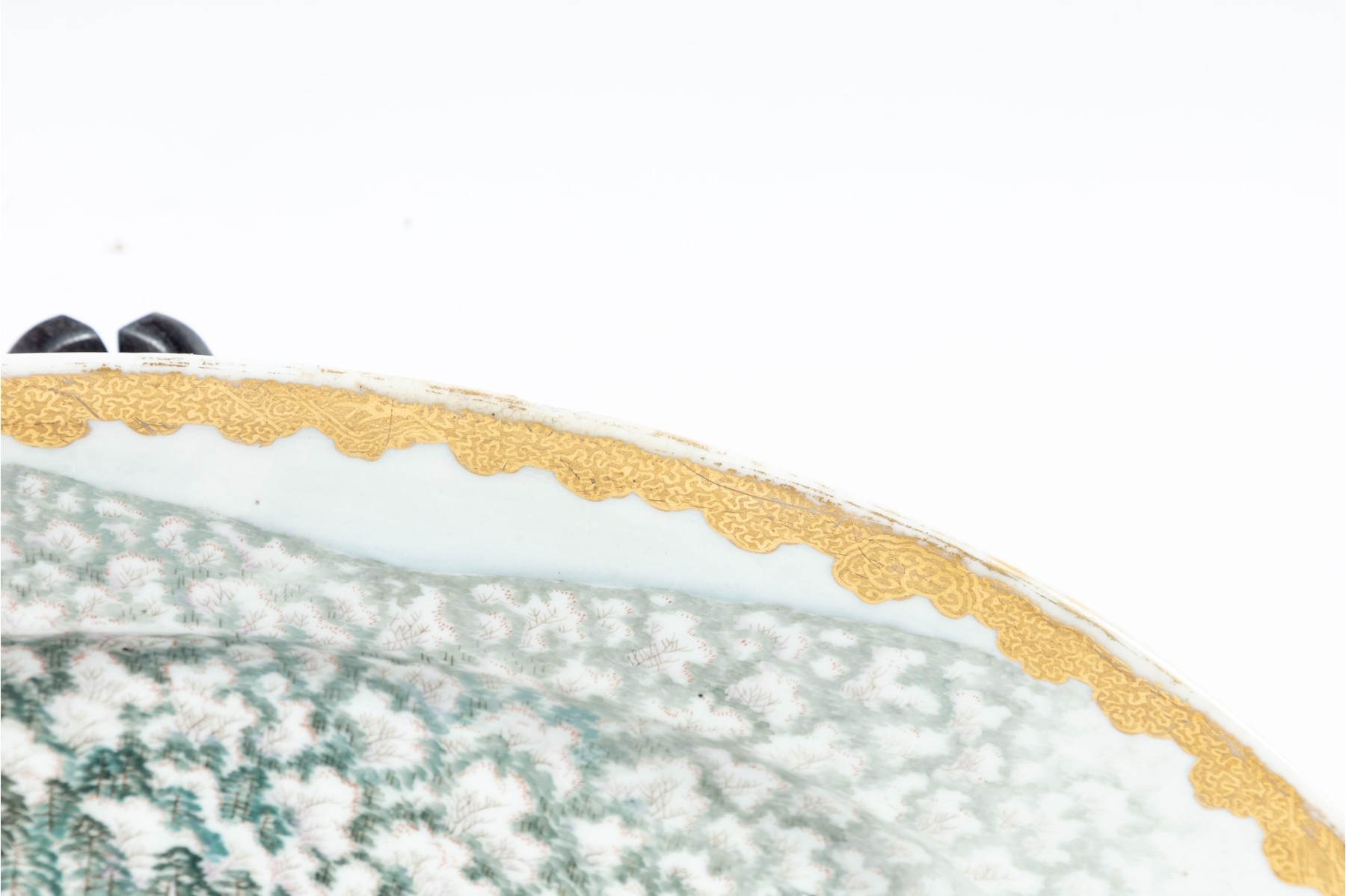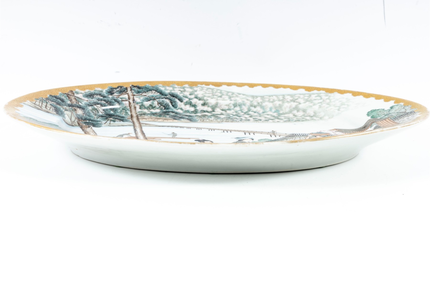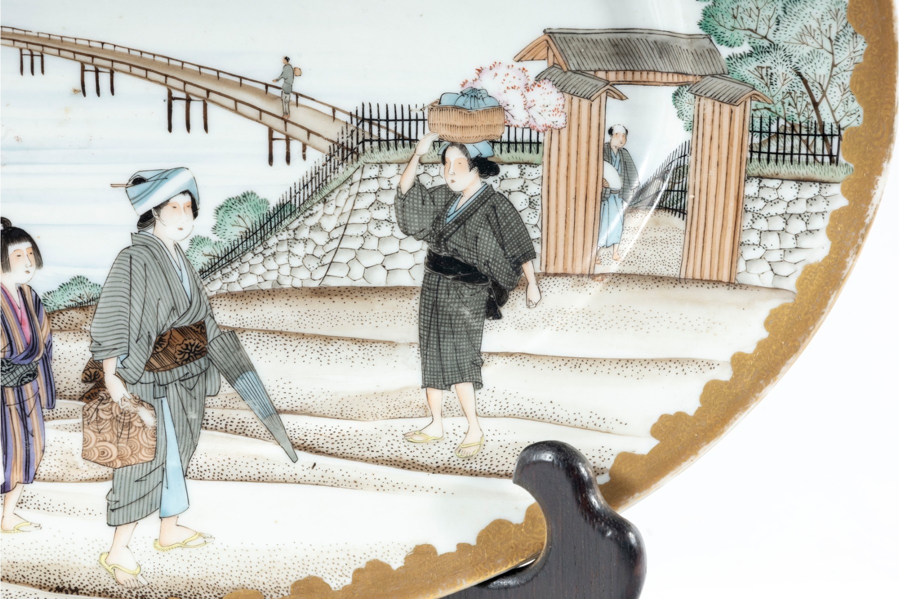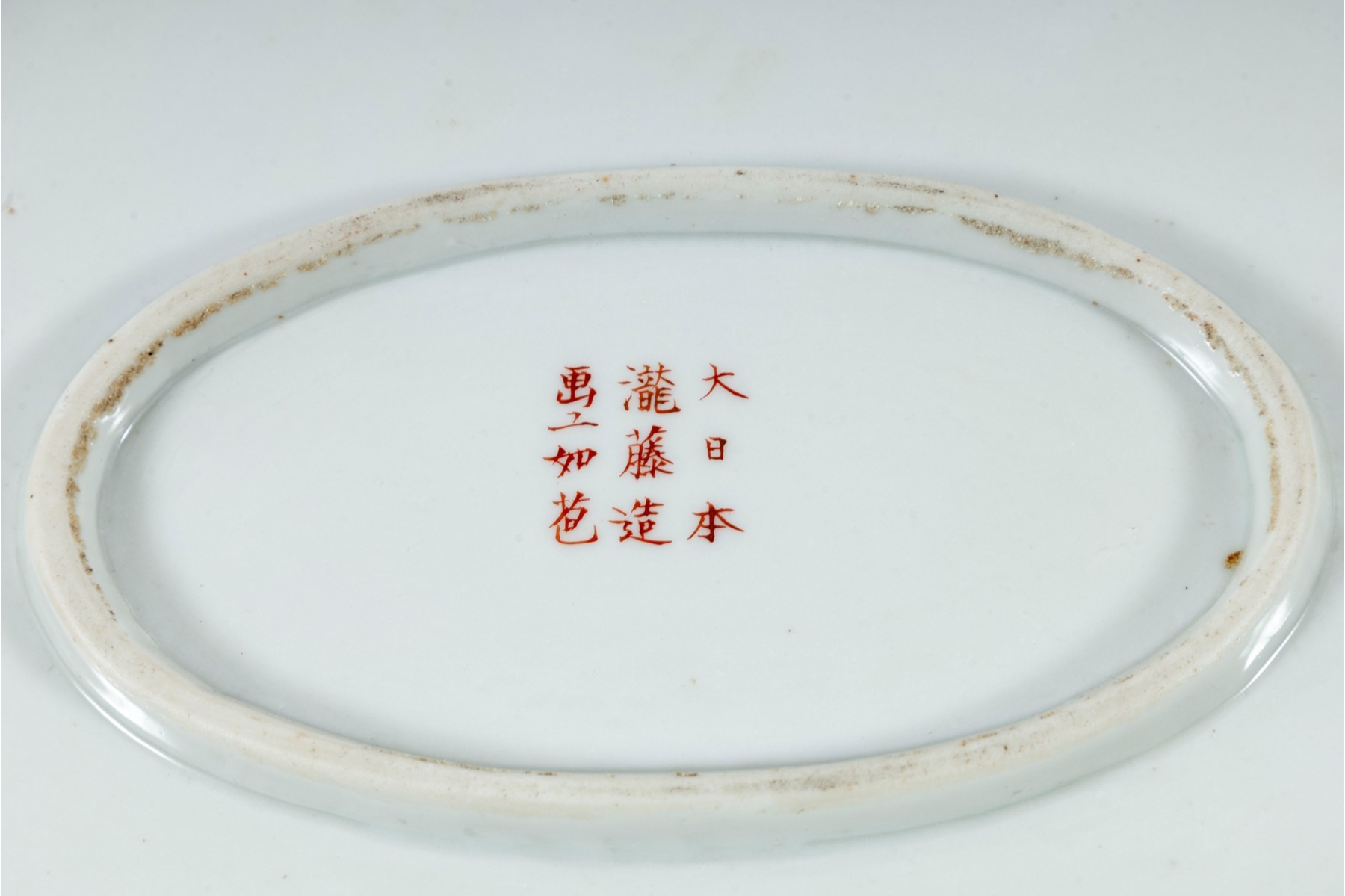A fine quality Japanese oval porcelain platter or charger hand-detailed with an enameled scene of figures walking along a landscape outside of a gate leading to an impressive bridge crossing a calm lake dotted with men on boats. The bridge leads to a village nestled along forested rolling hills. Marked underfoot.