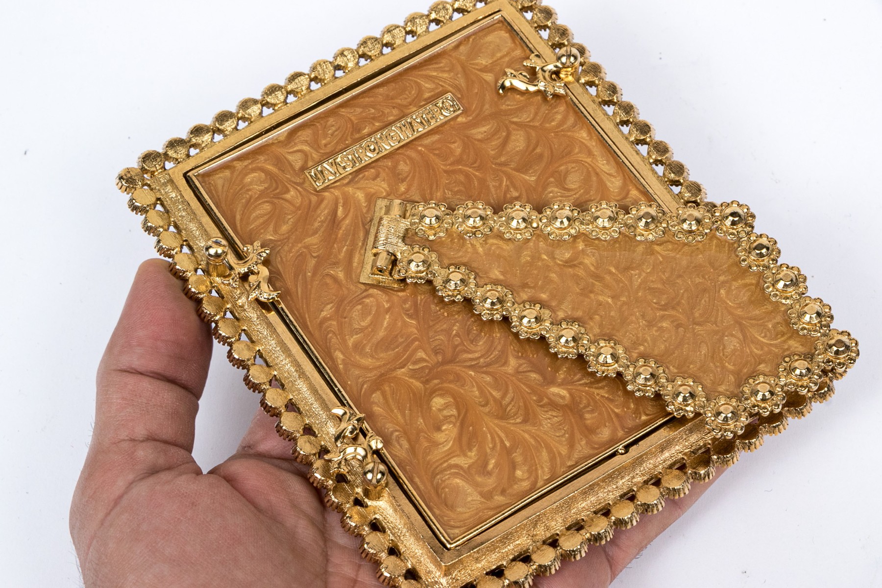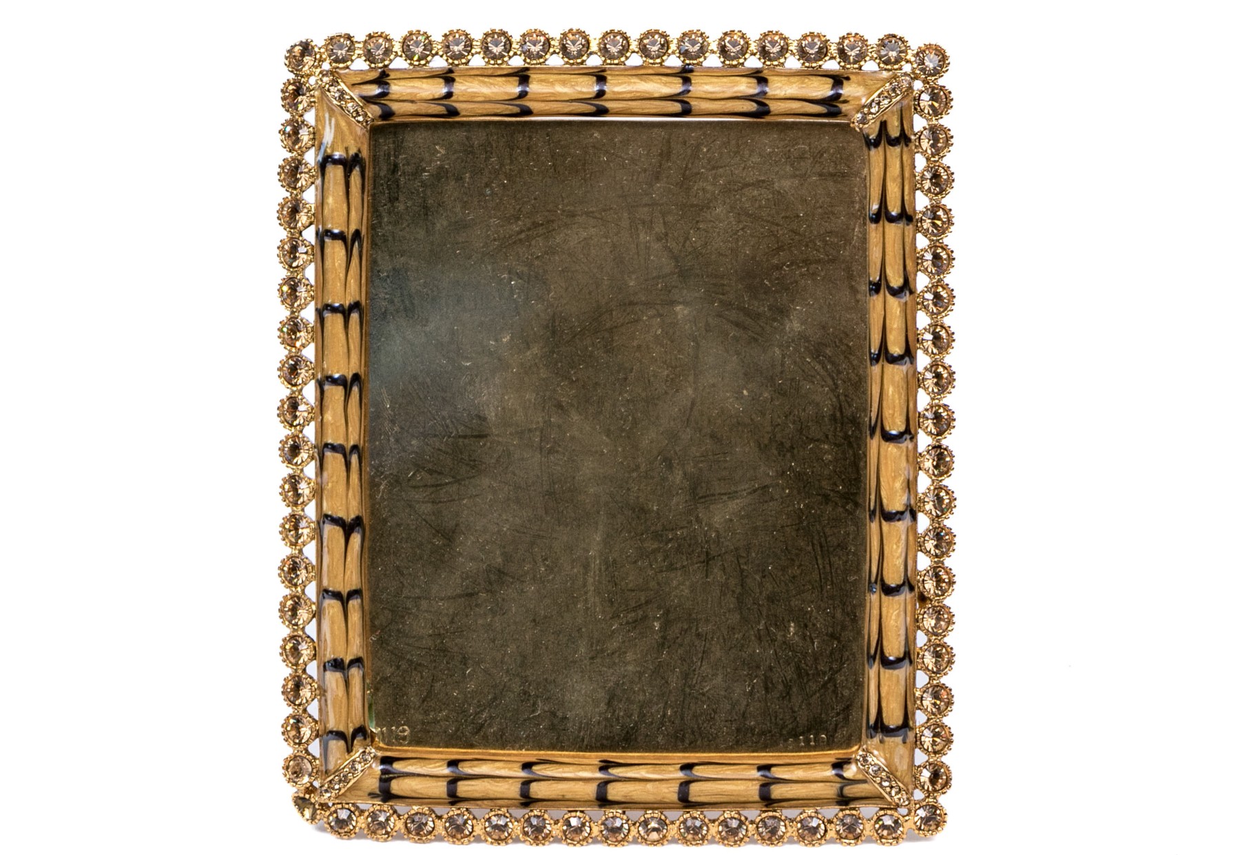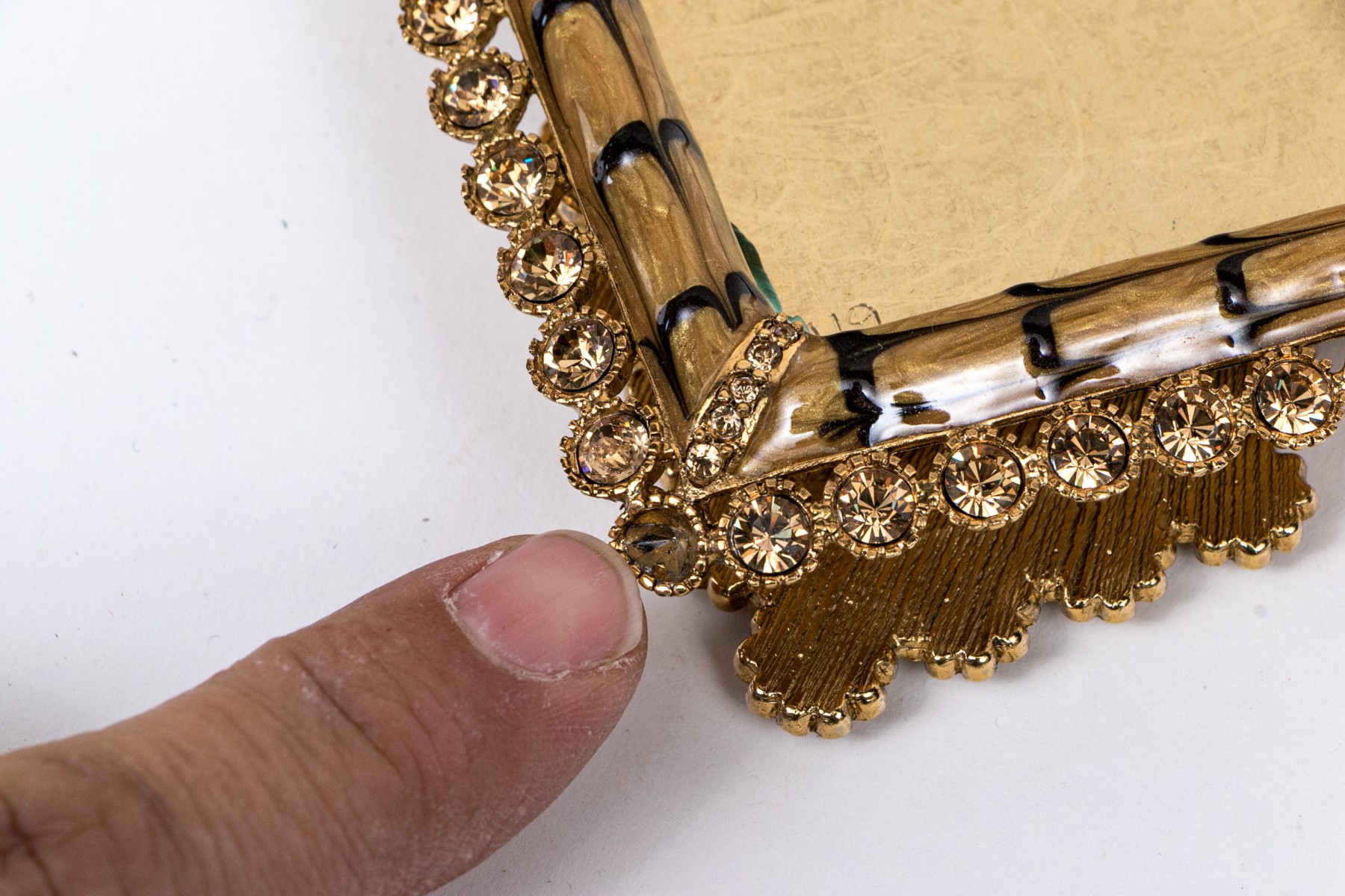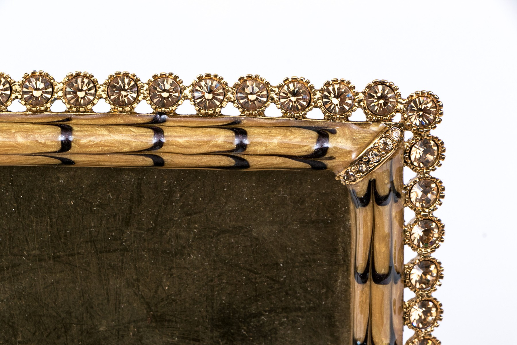 An elegant frame with a sparkly stone set outer gilt tone metal surround and inner tan and black feather pattern. The back in a caramel tone swirled plastic with easel stand.