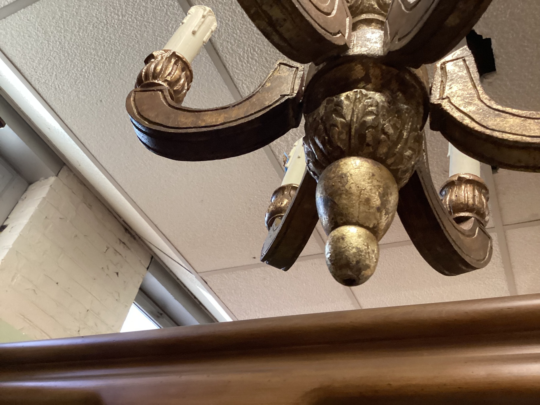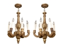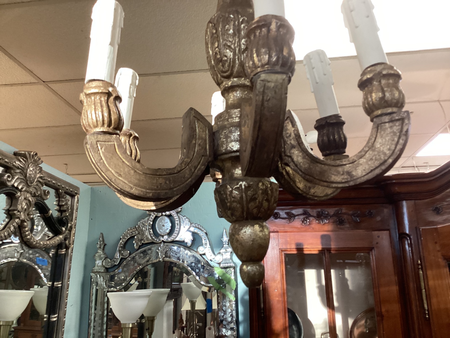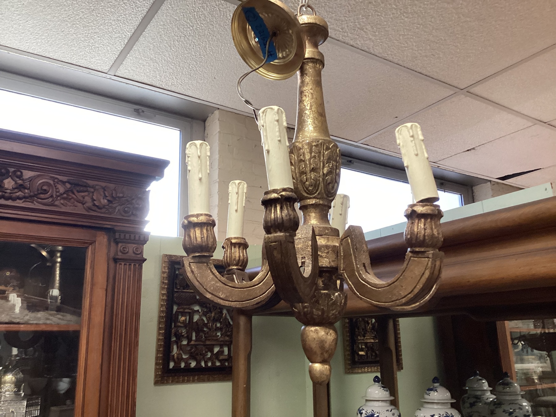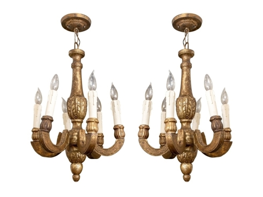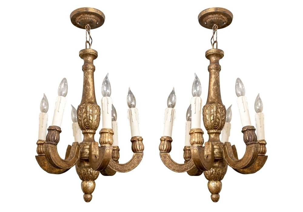 A finely crafted and elegant pair of carved and gilt wood six light chandeliers in an antiqued finish. The baluster form standard with a high leafy base. Six squared and curved lights are decorated with wide carved leafy sockets for the quality faux candles. The bulbous leafy end with a turned terminal. Along with a coordinating gilt finished metal ceiling plate.