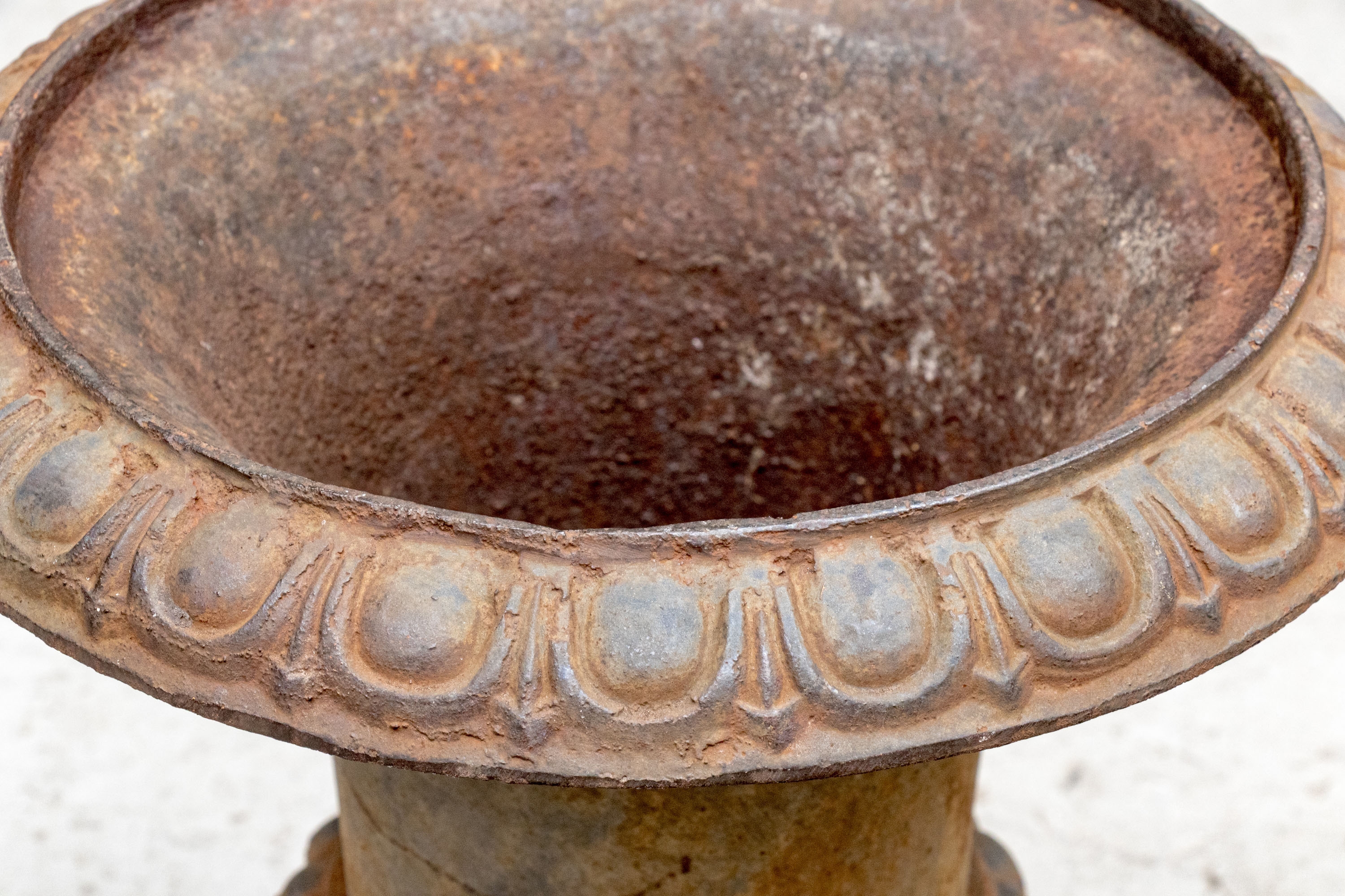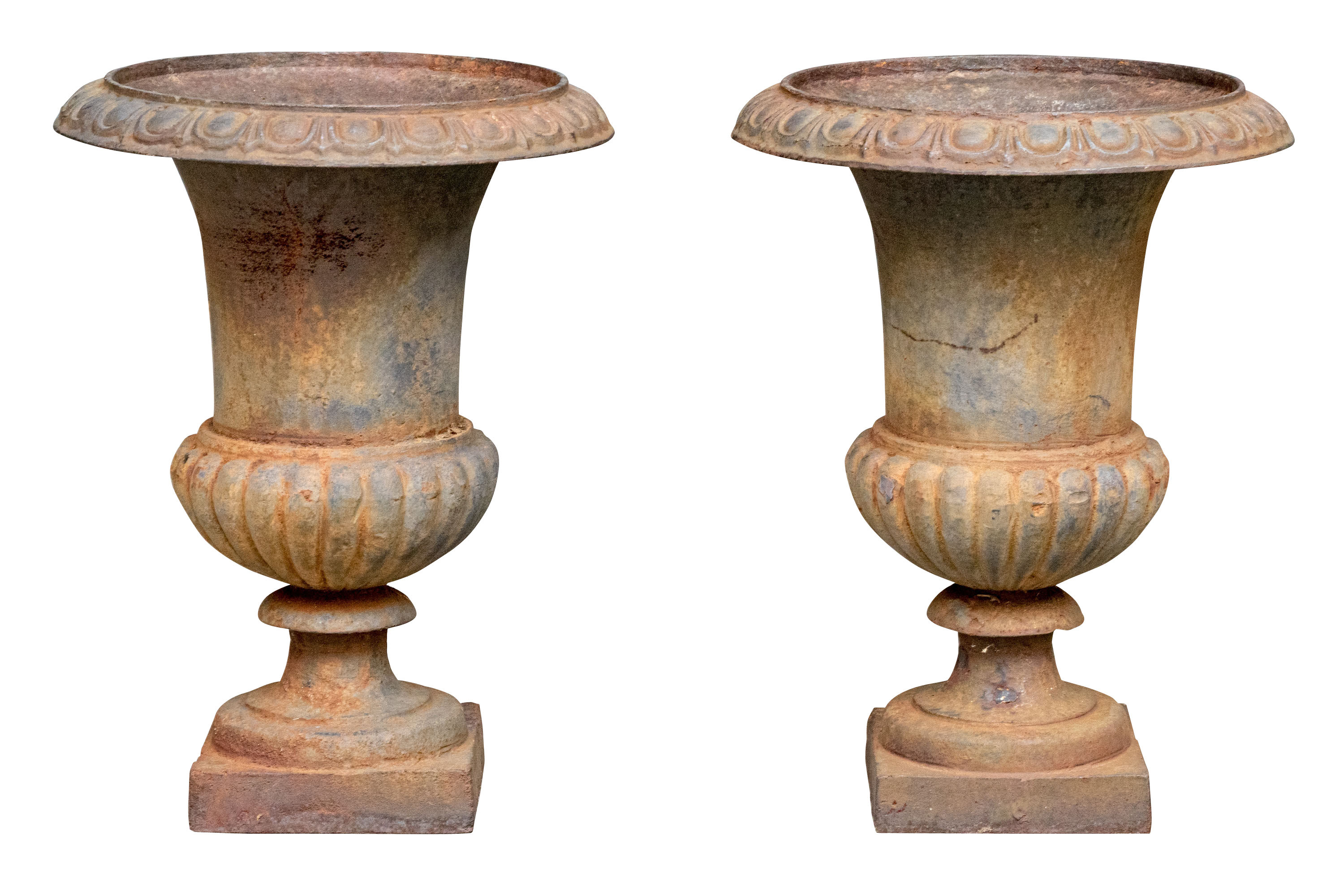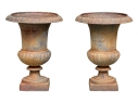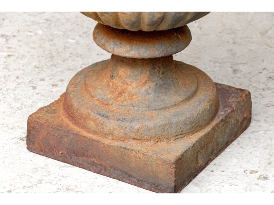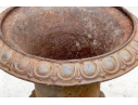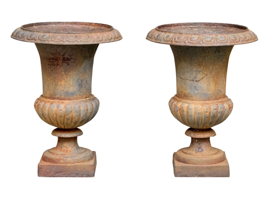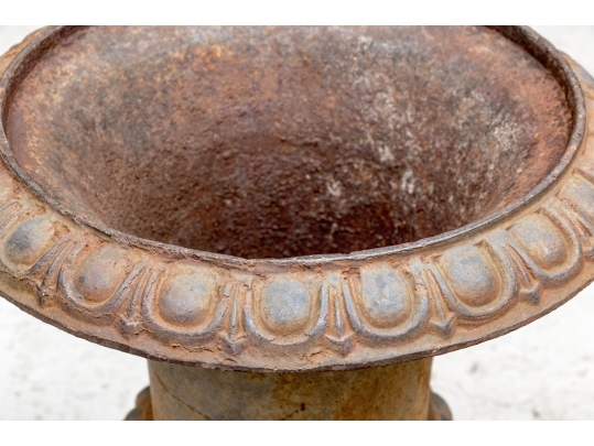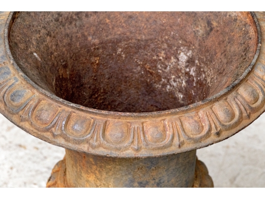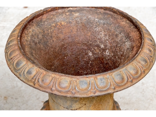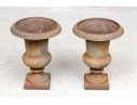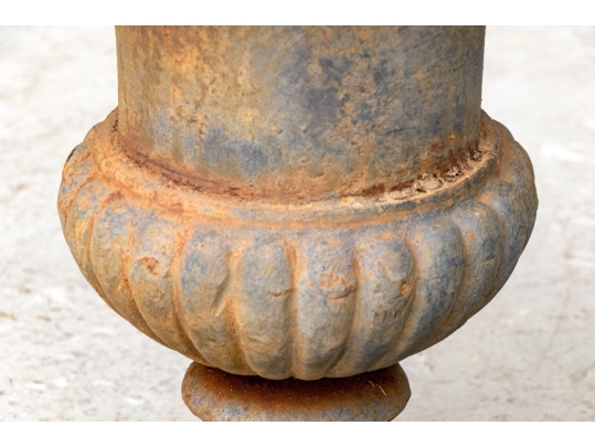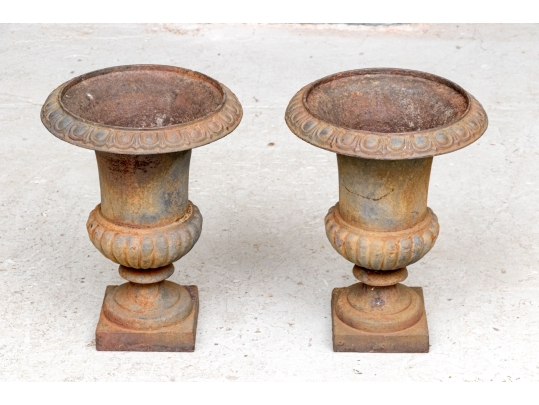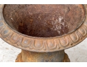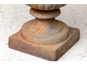 Condition: Please see detail photos. The pair of antique cast iron urns display oxidation commensurate with age and weathering from use and display in the outdoors. The urns could certainly be painted or displayed and used in their current charming condition.