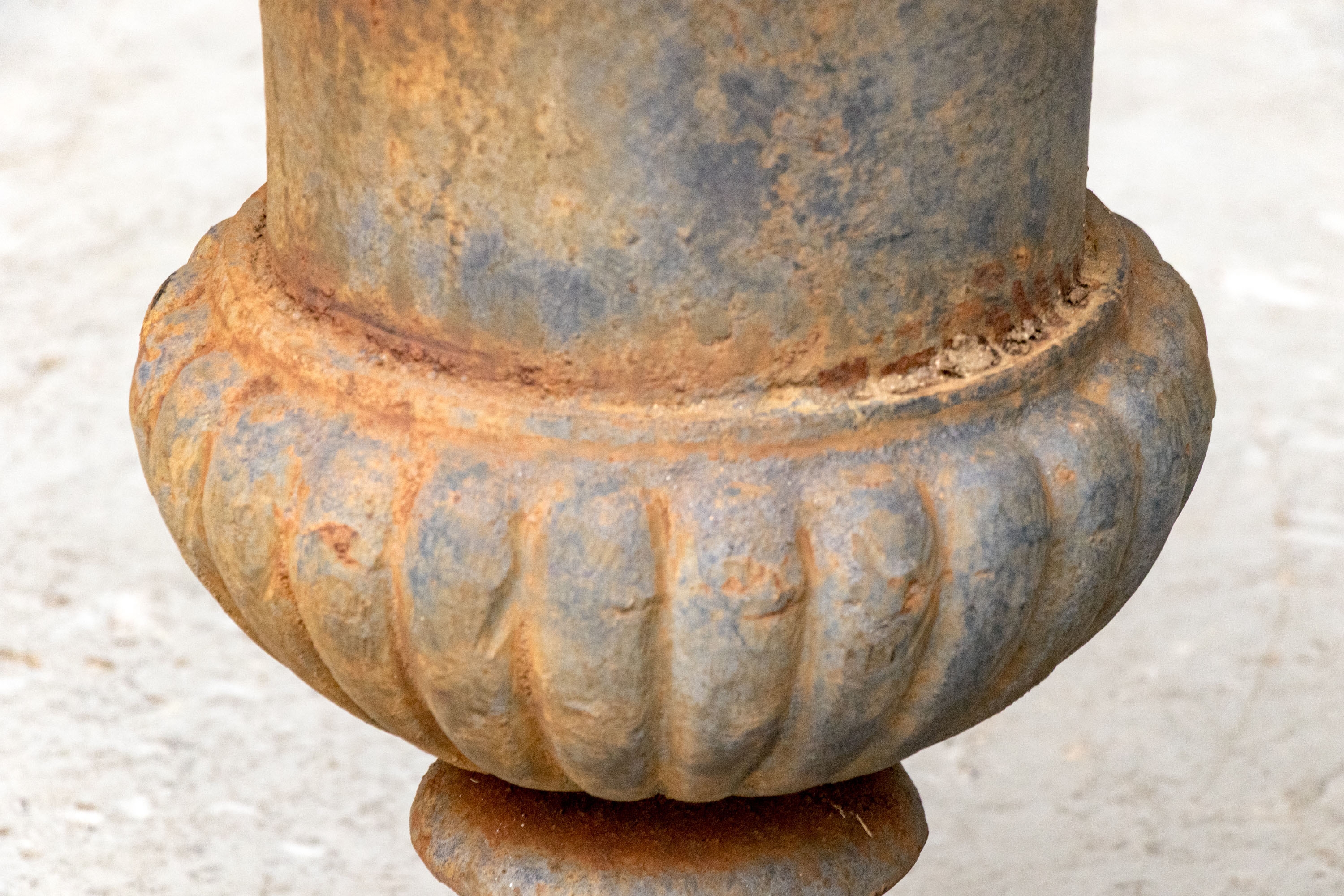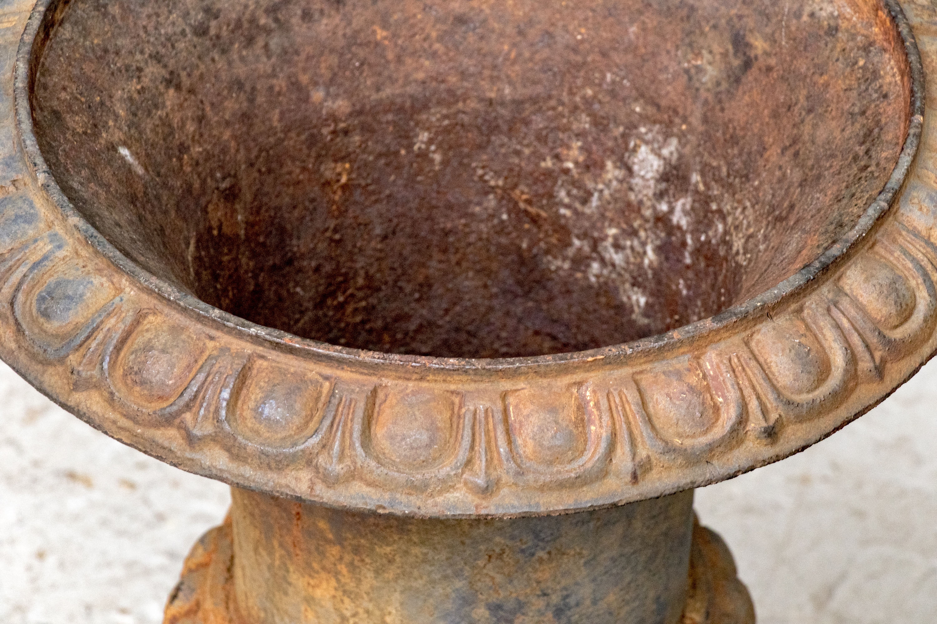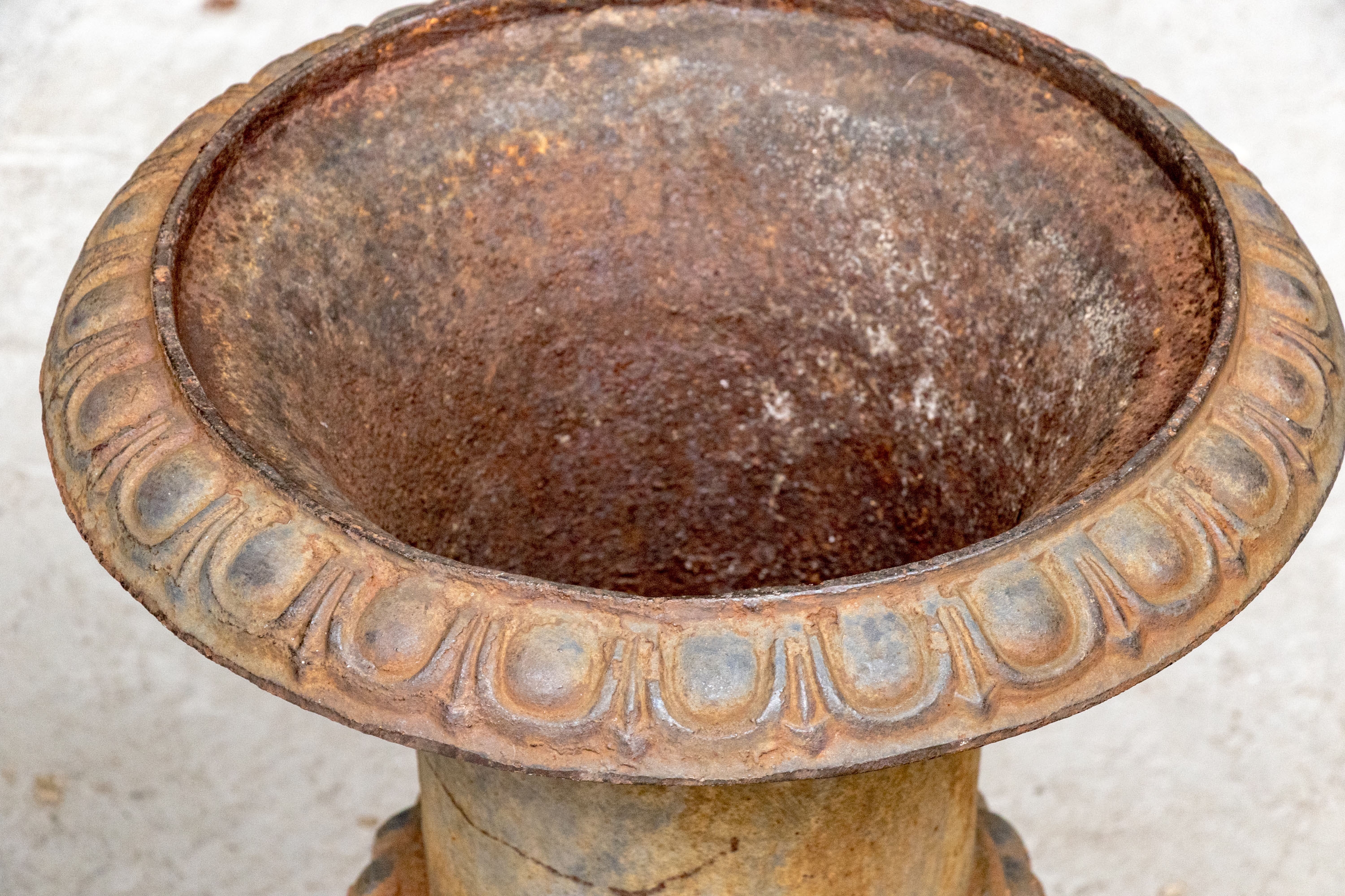 Condition: Please see detail photos. The pair of antique cast iron urns display oxidation commensurate with age and weathering from use and display in the outdoors. The urns could certainly be painted or displayed and used in their current charming condition.