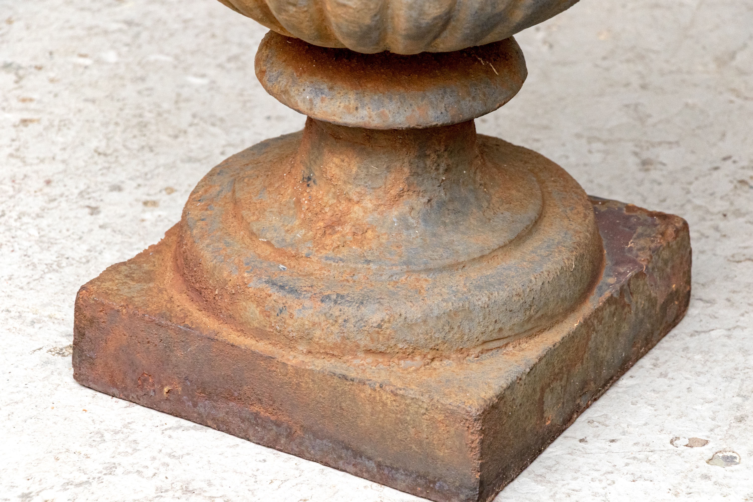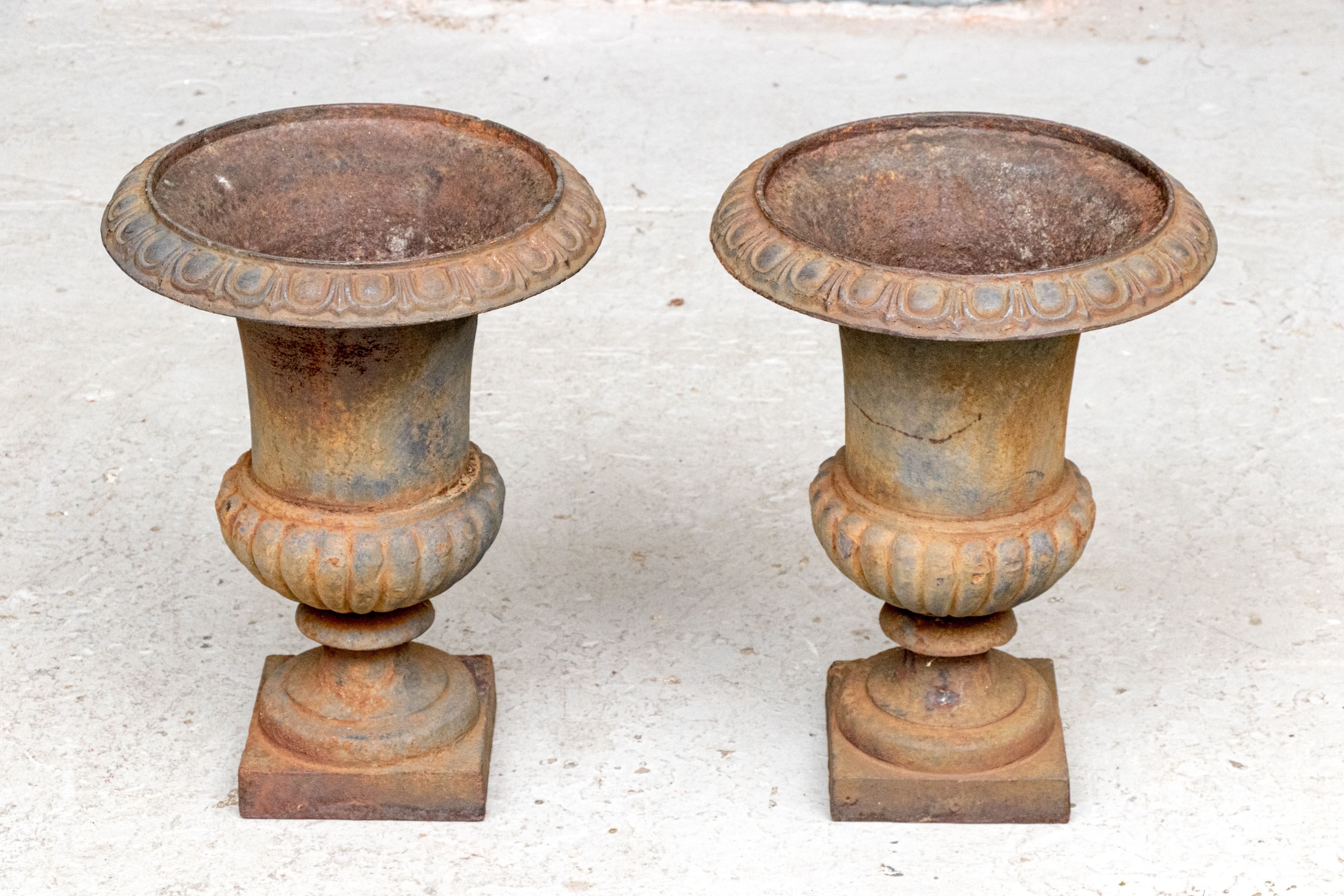 A nicely proportioned pair of antique Neoclassical style cast iron urns dating to the early 20th century with particularly fine form. The urns stand upon square bases with circular foot and short pedestal. The lower body of the urn is lobed with the trumpet form upper body and everted mouth rim with gadroon decoration.