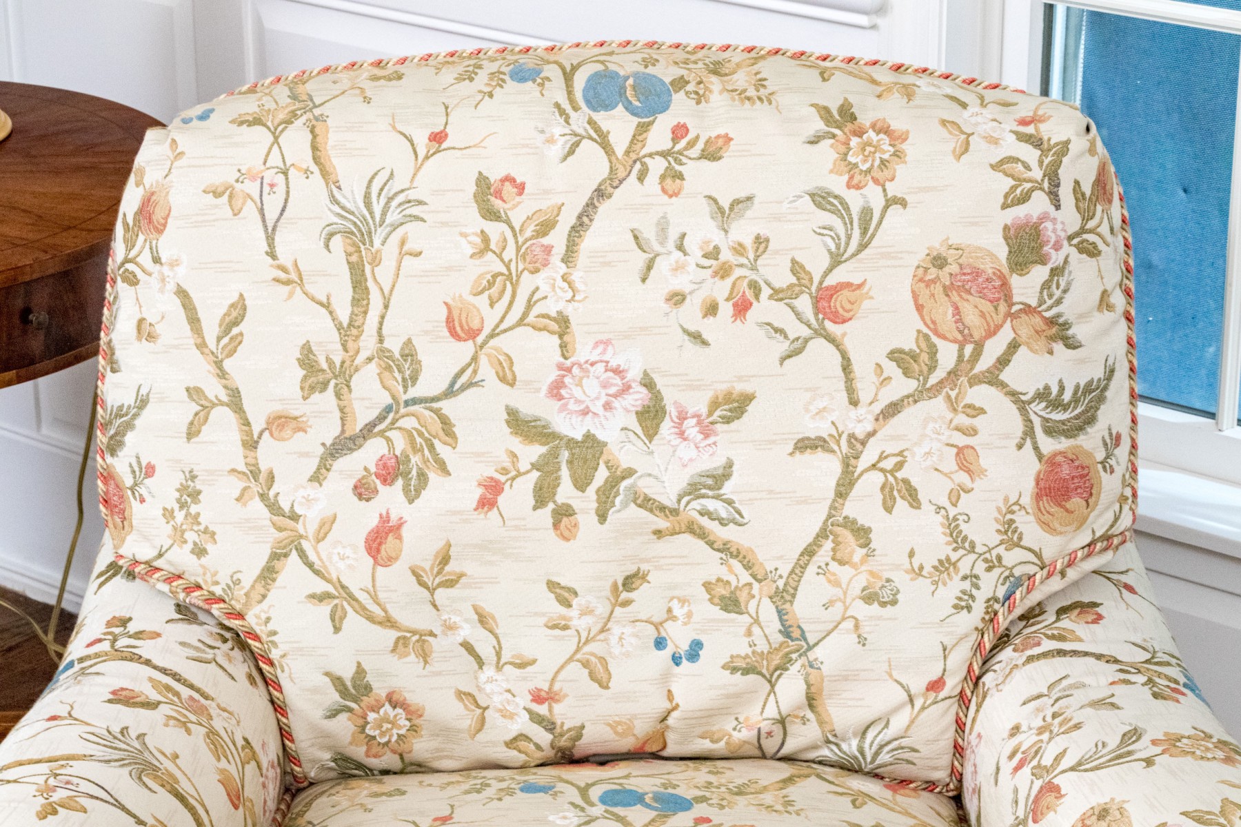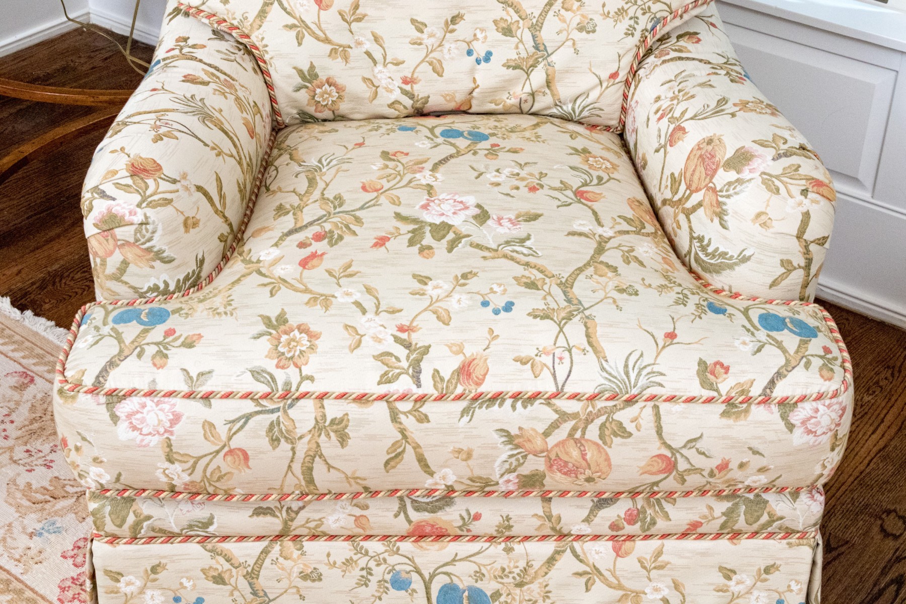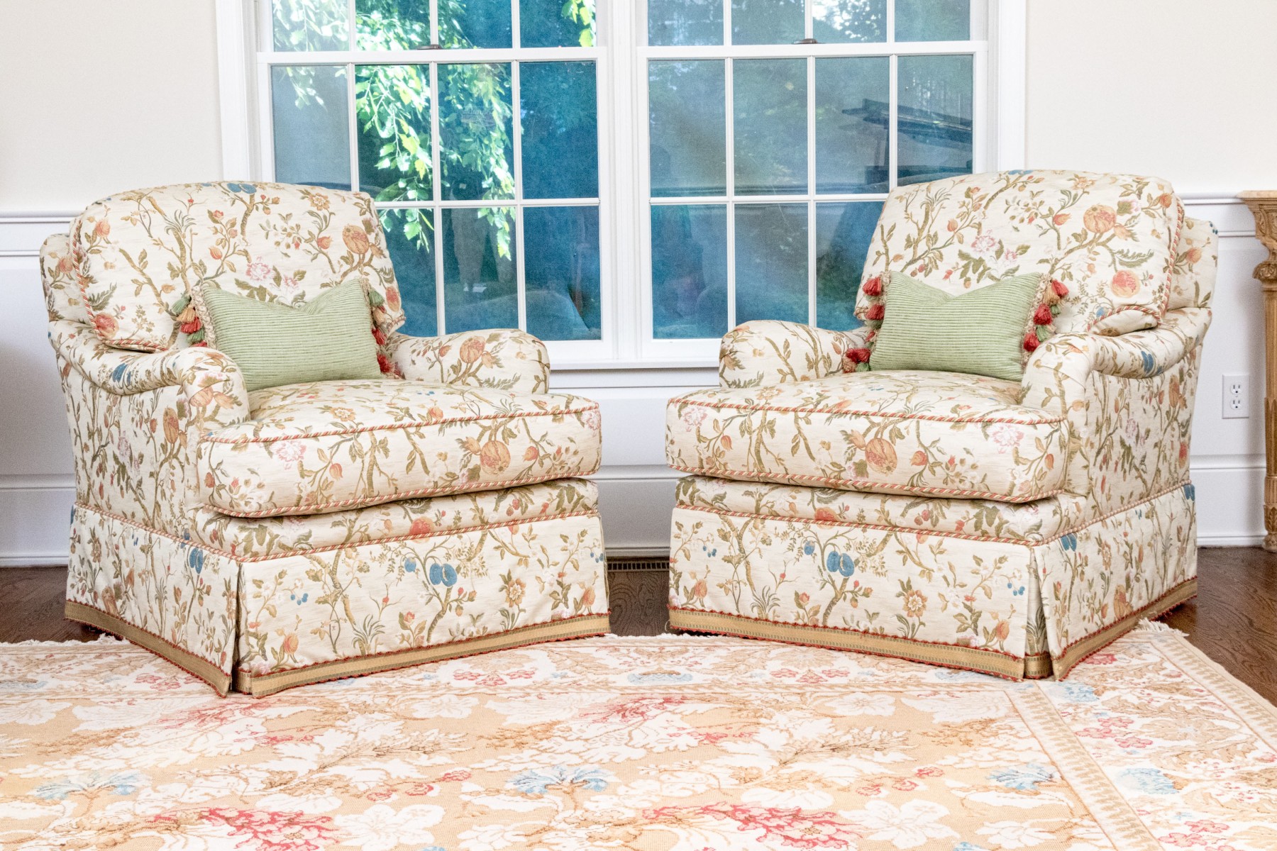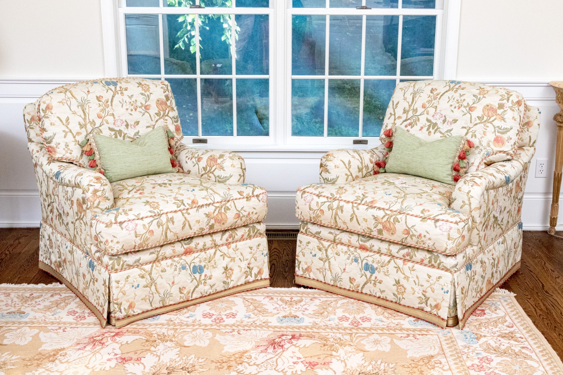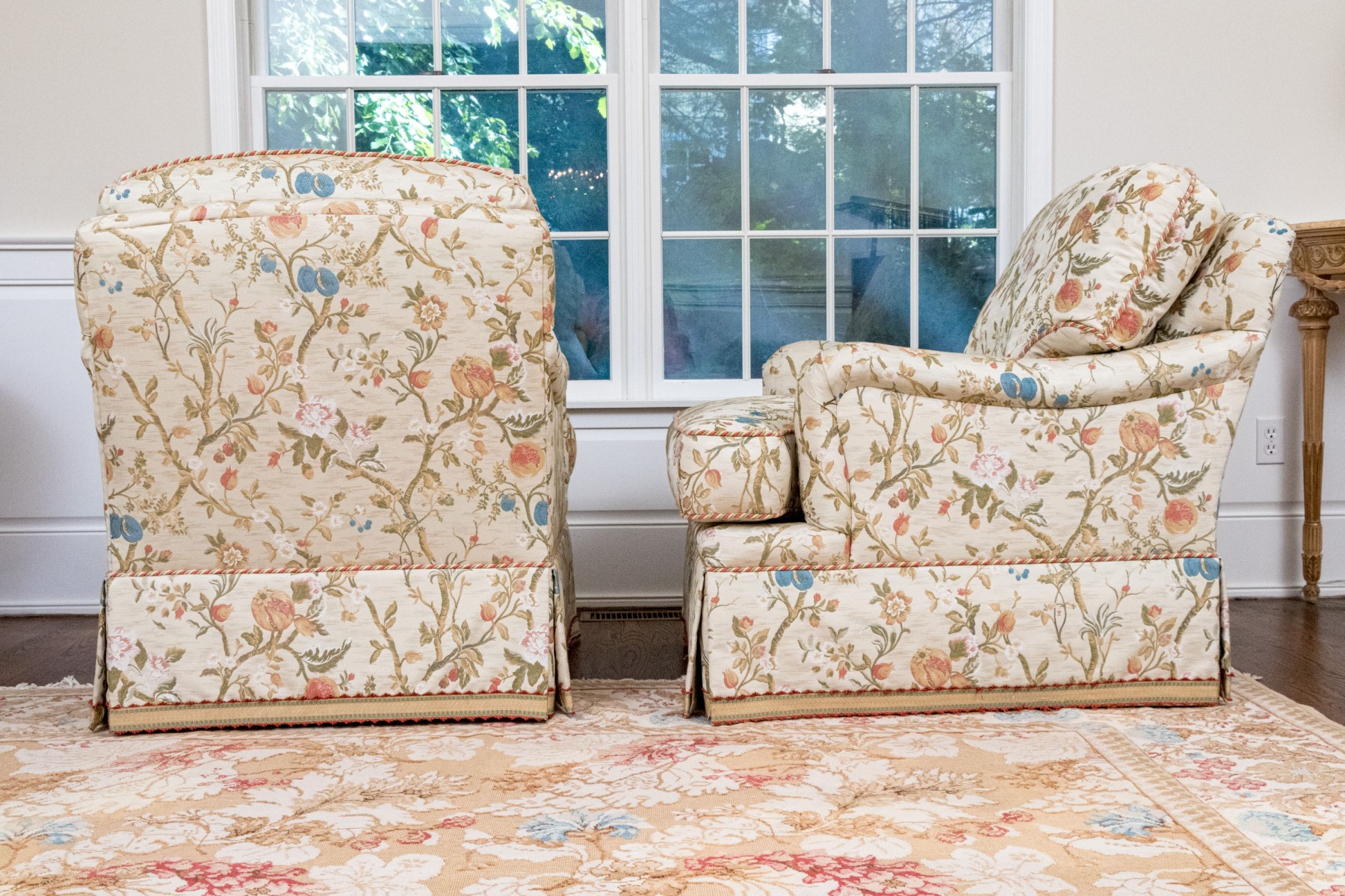 A fine pair of Schumacher club chairs raised on four finished wood legs with floral upholstery throughout, with a fitted, loose upholstered seat cushion. All upholstery detailed with wonderful polychrome rope turned piped trim. Accompanied by decorative accent pillows with tasseled fringe.