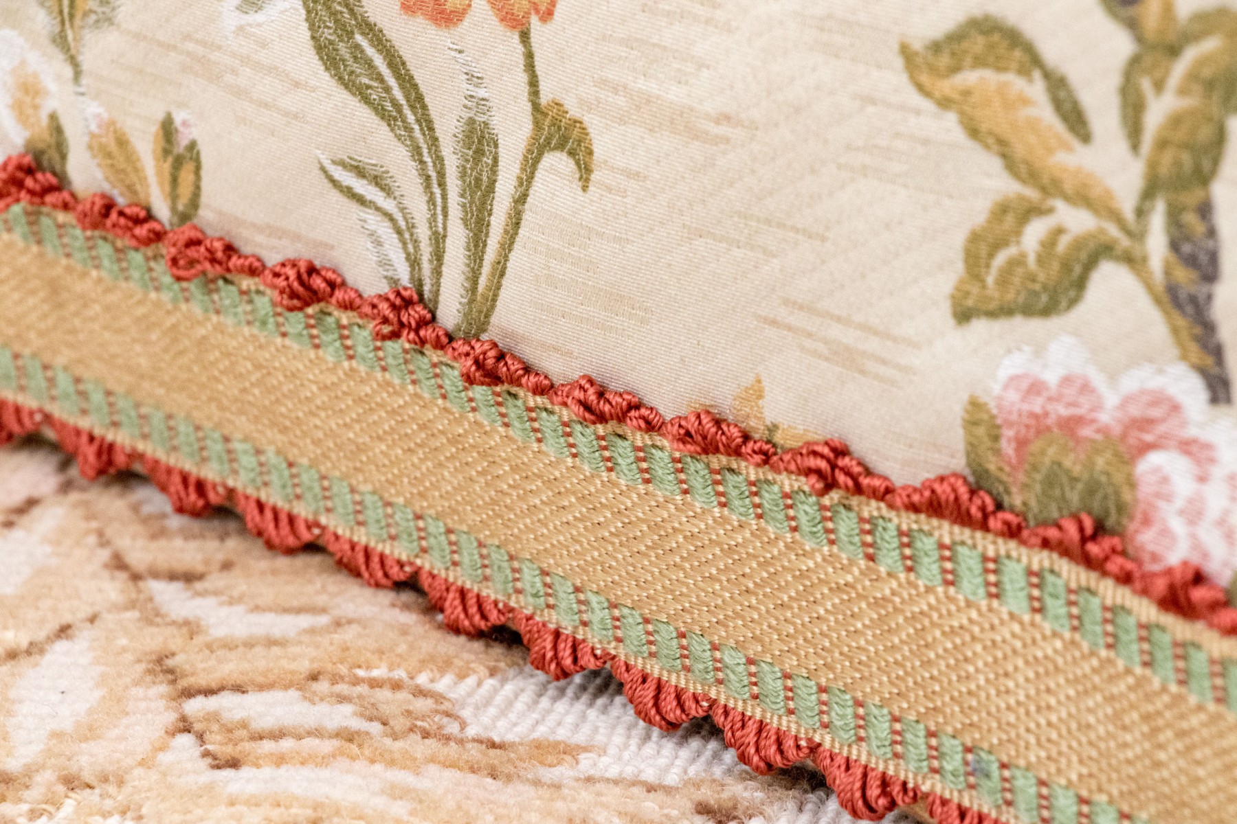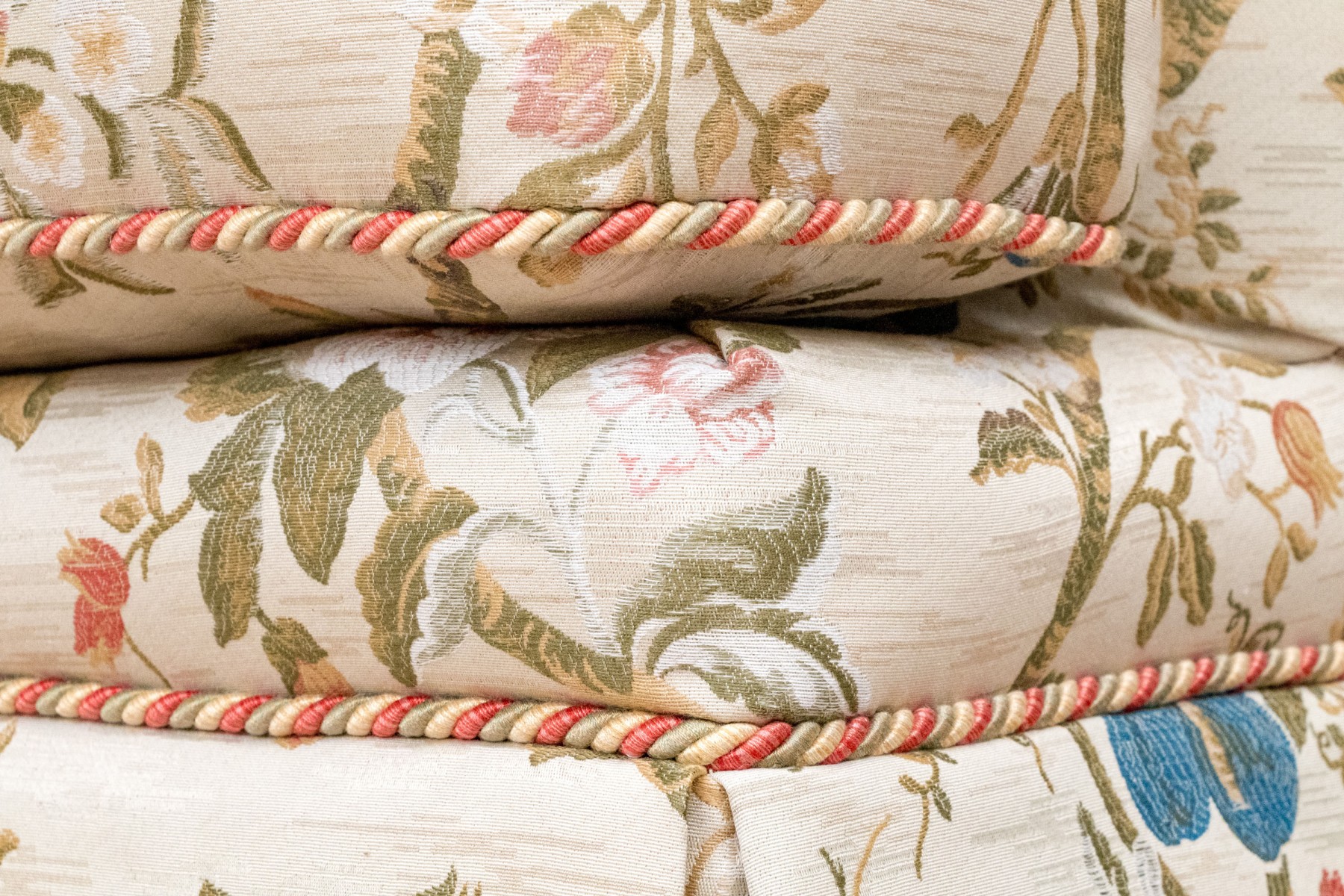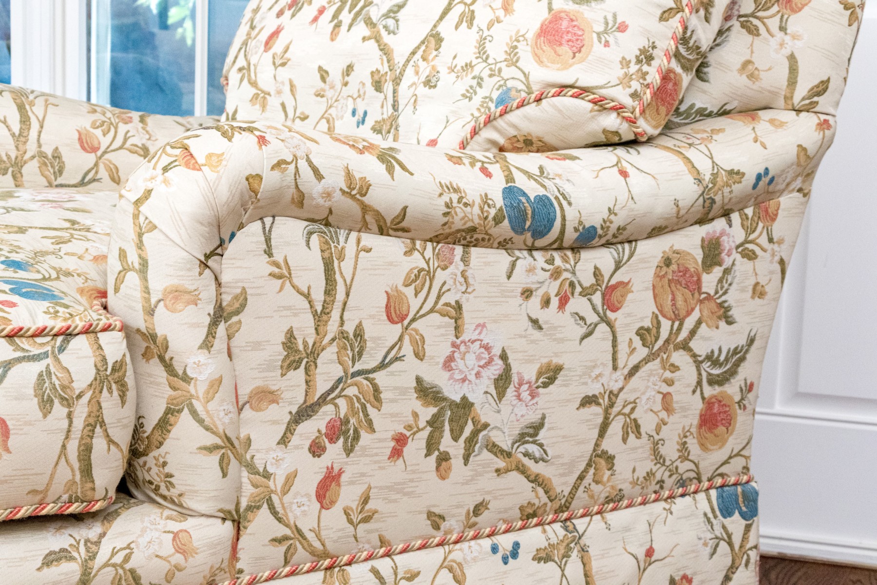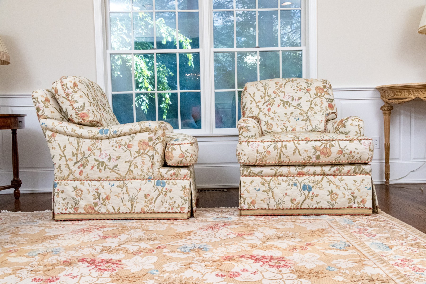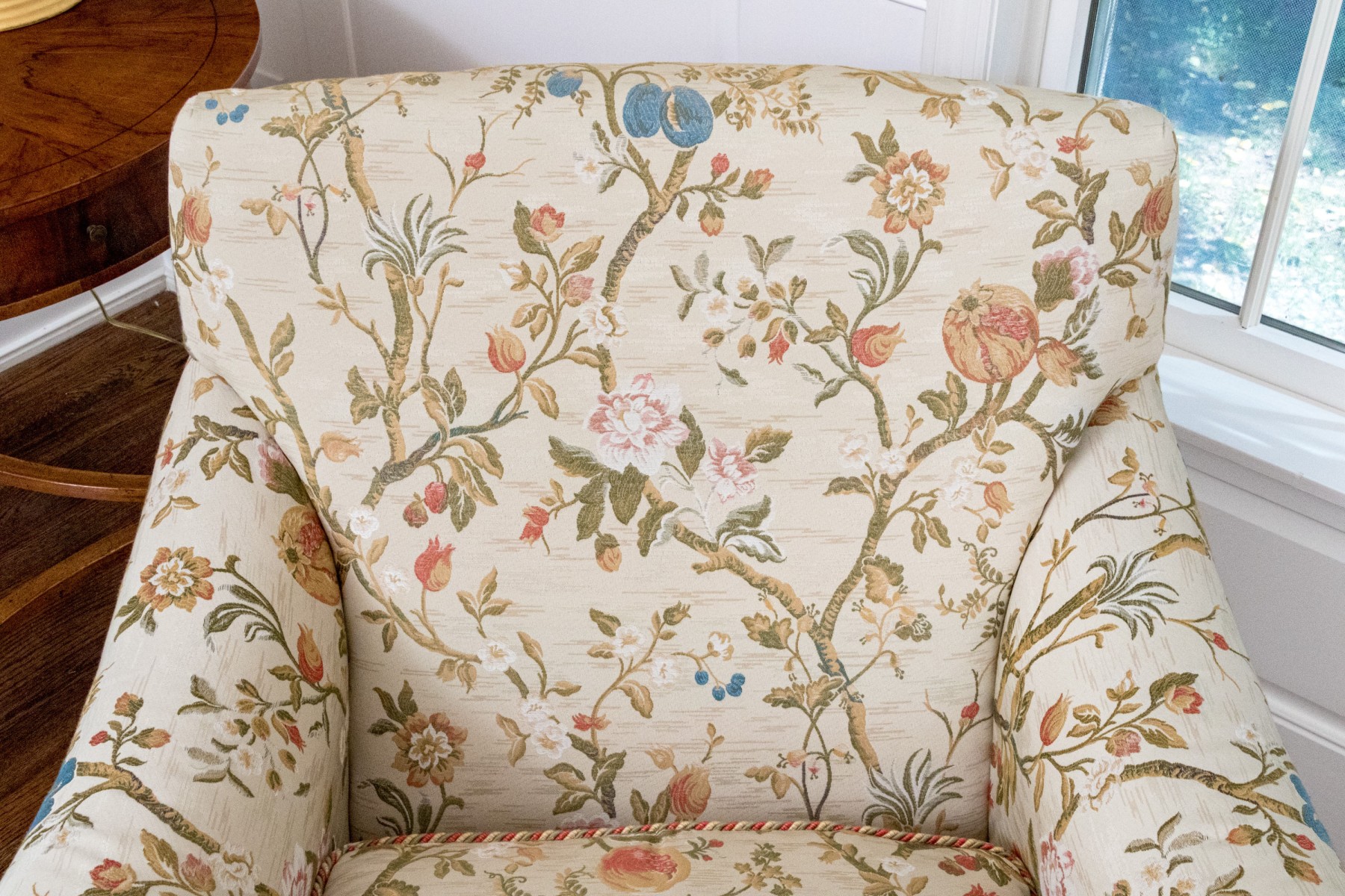 A fine pair of Schumacher club chairs raised on four finished wood legs with floral upholstery throughout, with a fitted, loose upholstered seat cushion. All upholstery detailed with wonderful polychrome rope turned piped trim. Accompanied by decorative accent pillows with tasseled fringe.