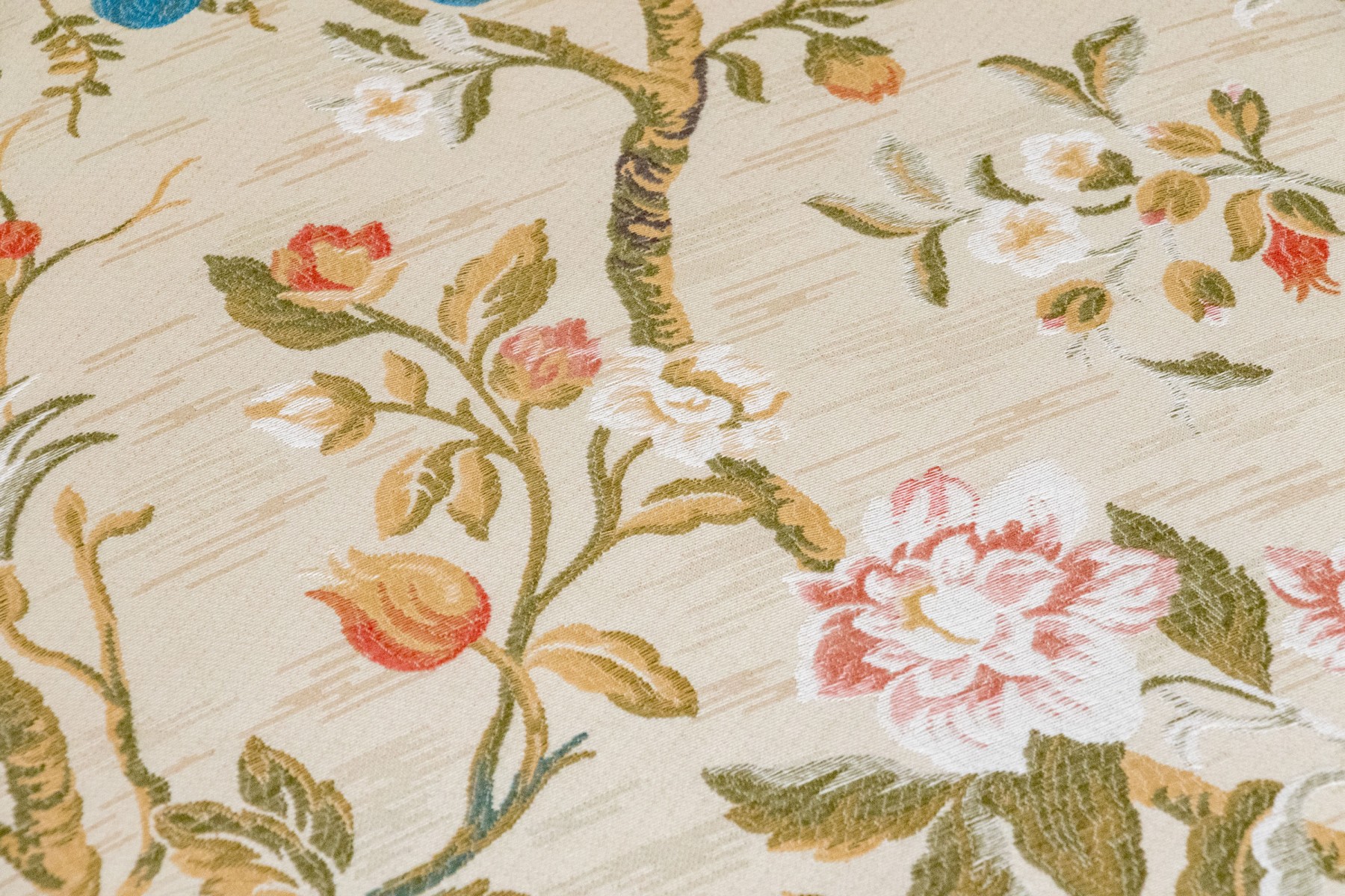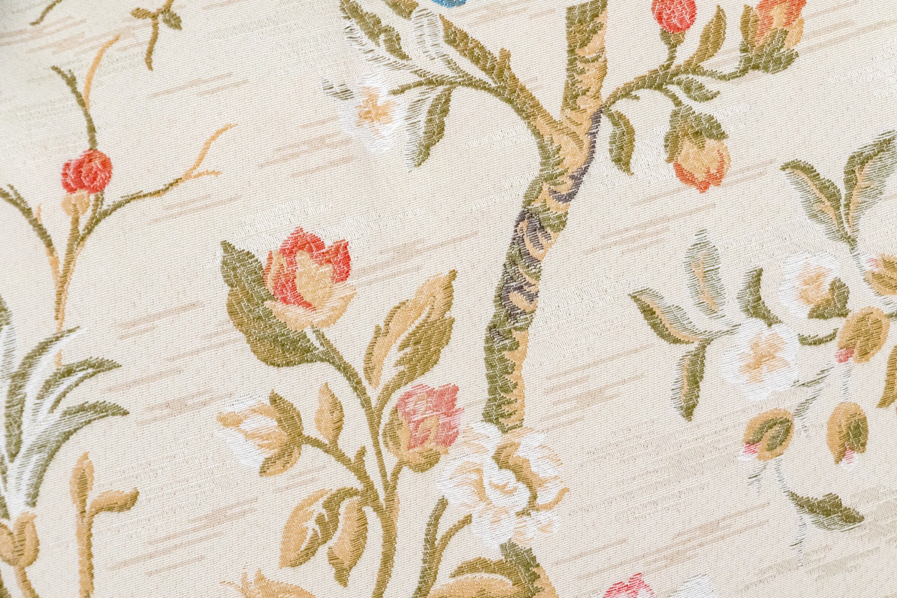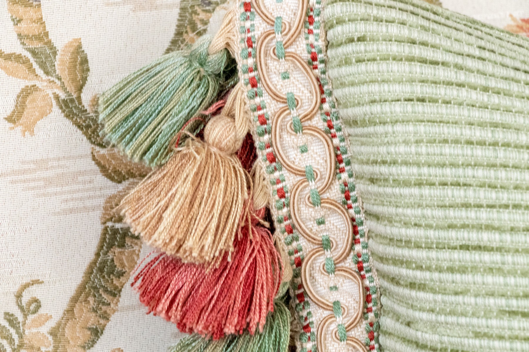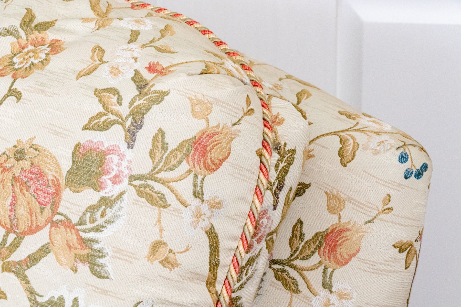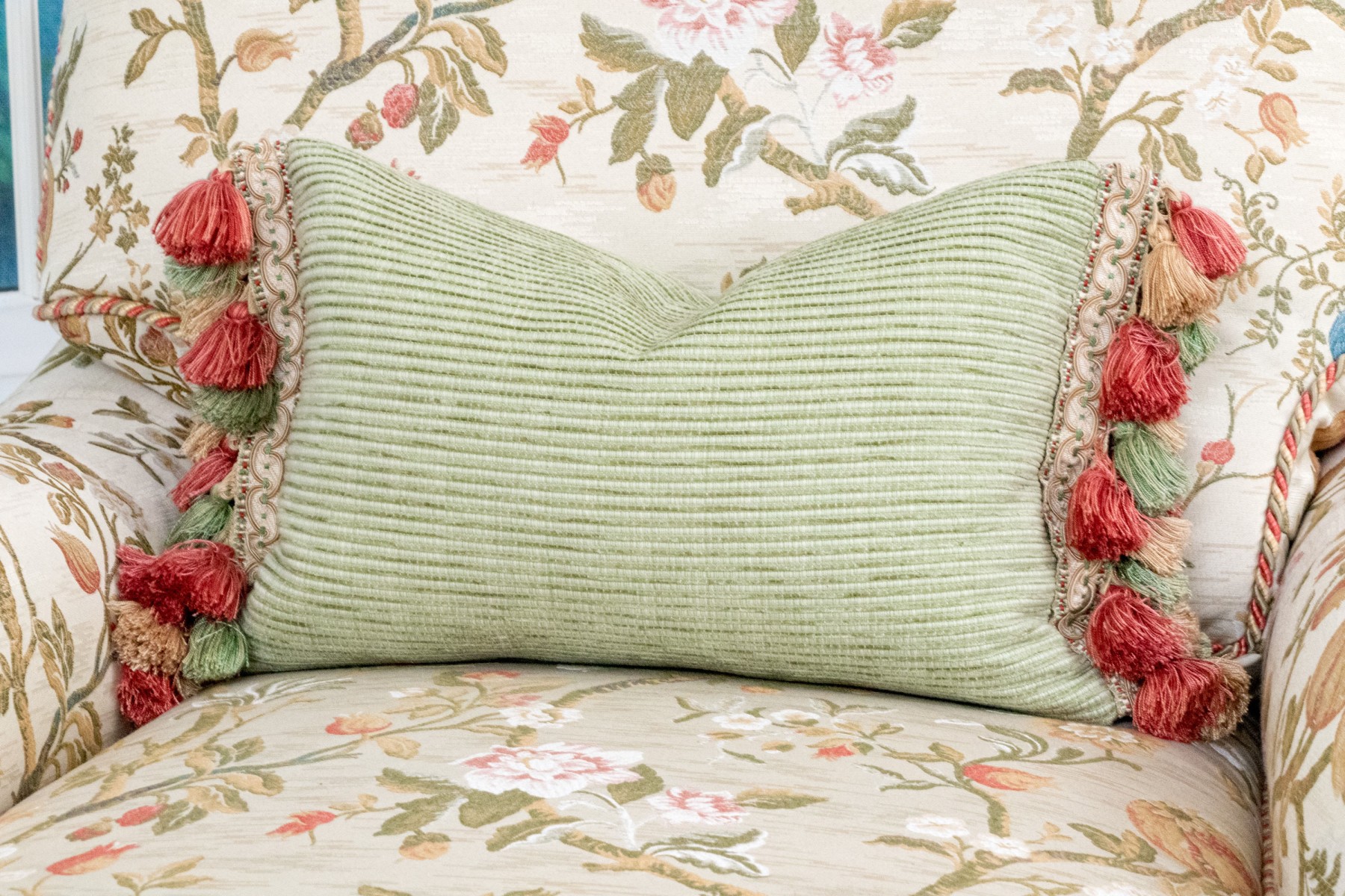 A fine pair of Schumacher club chairs raised on four finished wood legs with floral upholstery throughout, with a fitted, loose upholstered seat cushion. All upholstery detailed with wonderful polychrome rope turned piped trim. Accompanied by decorative accent pillows with tasseled fringe.