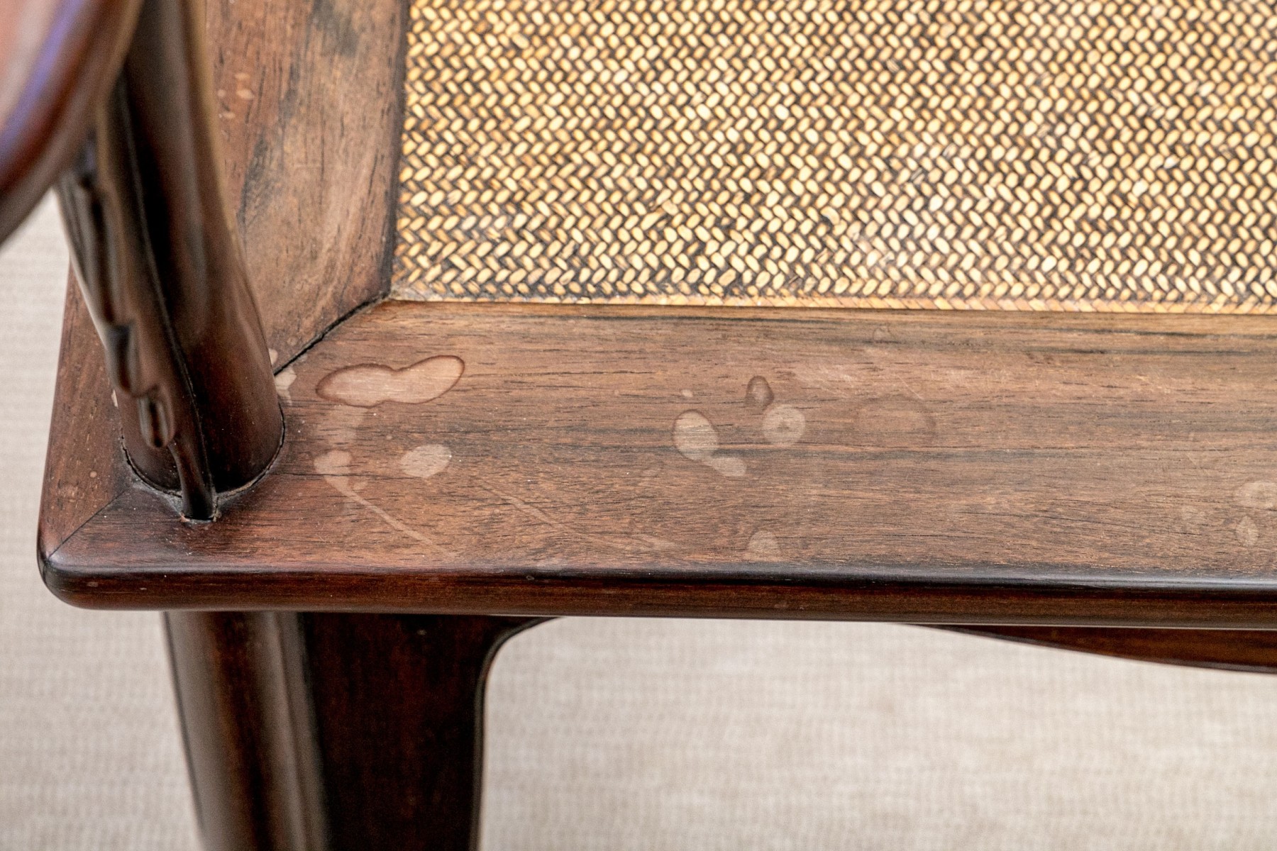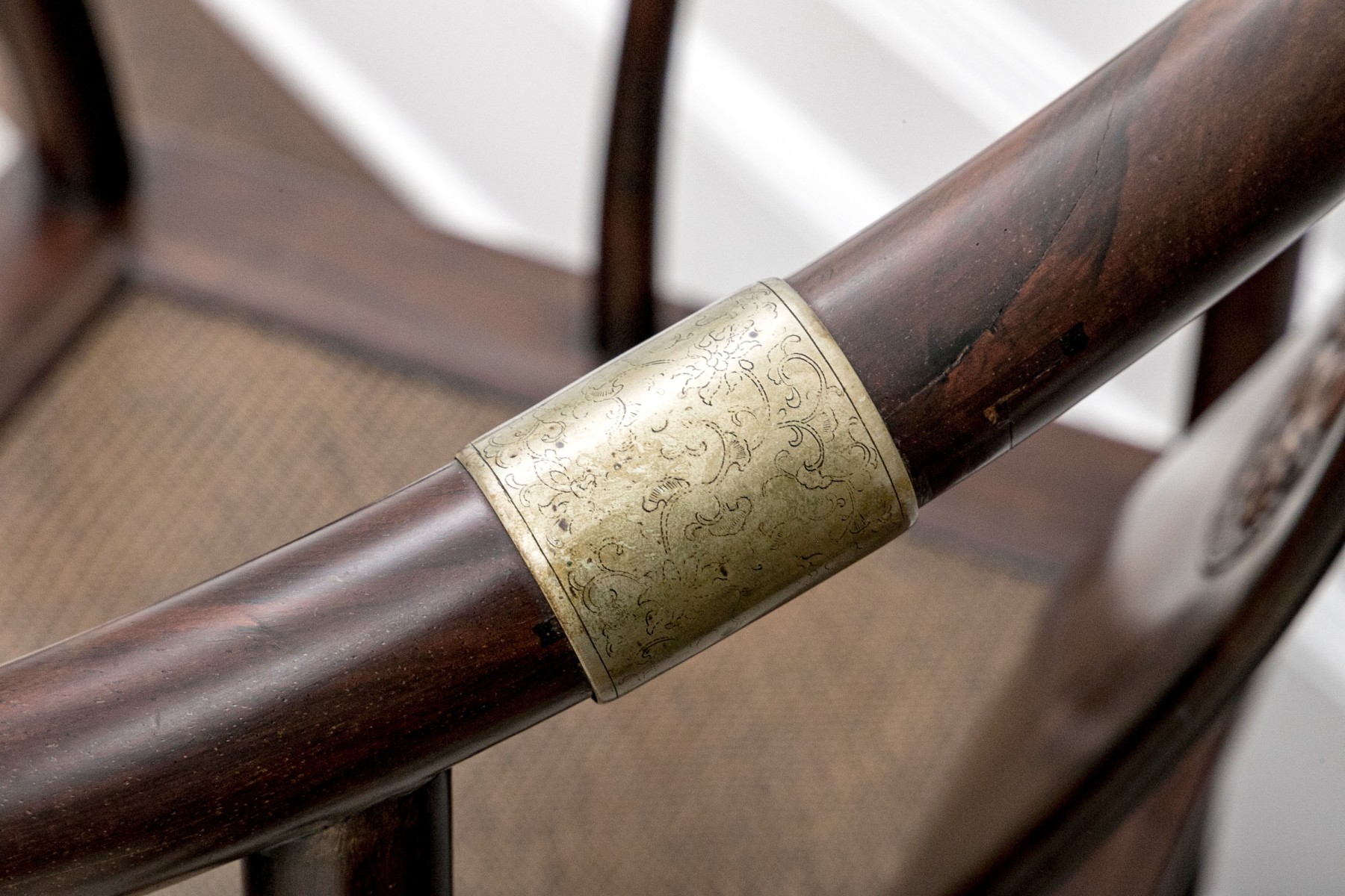 Presents well overall. Minor finish wear and checking. One chair has a loss to the scalloped edge of the arm supports to the right arm.