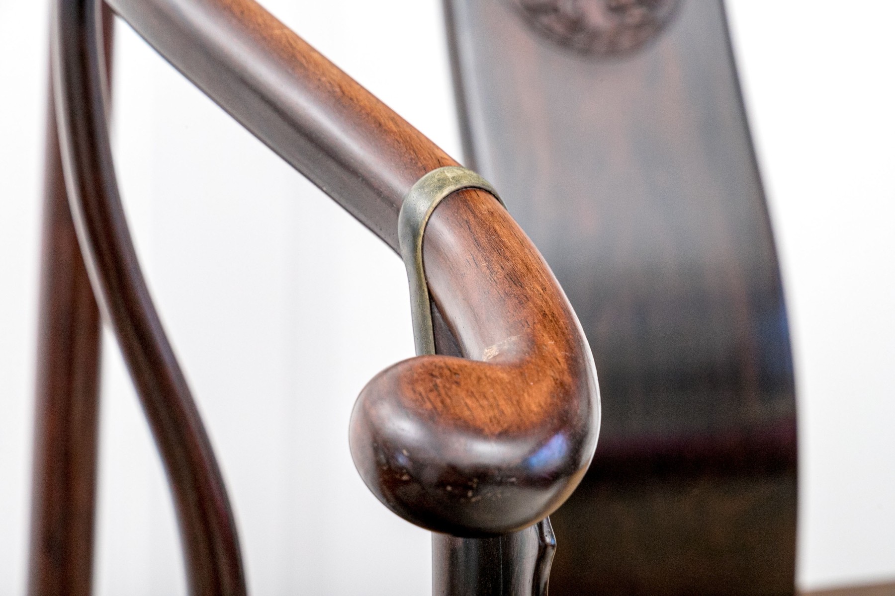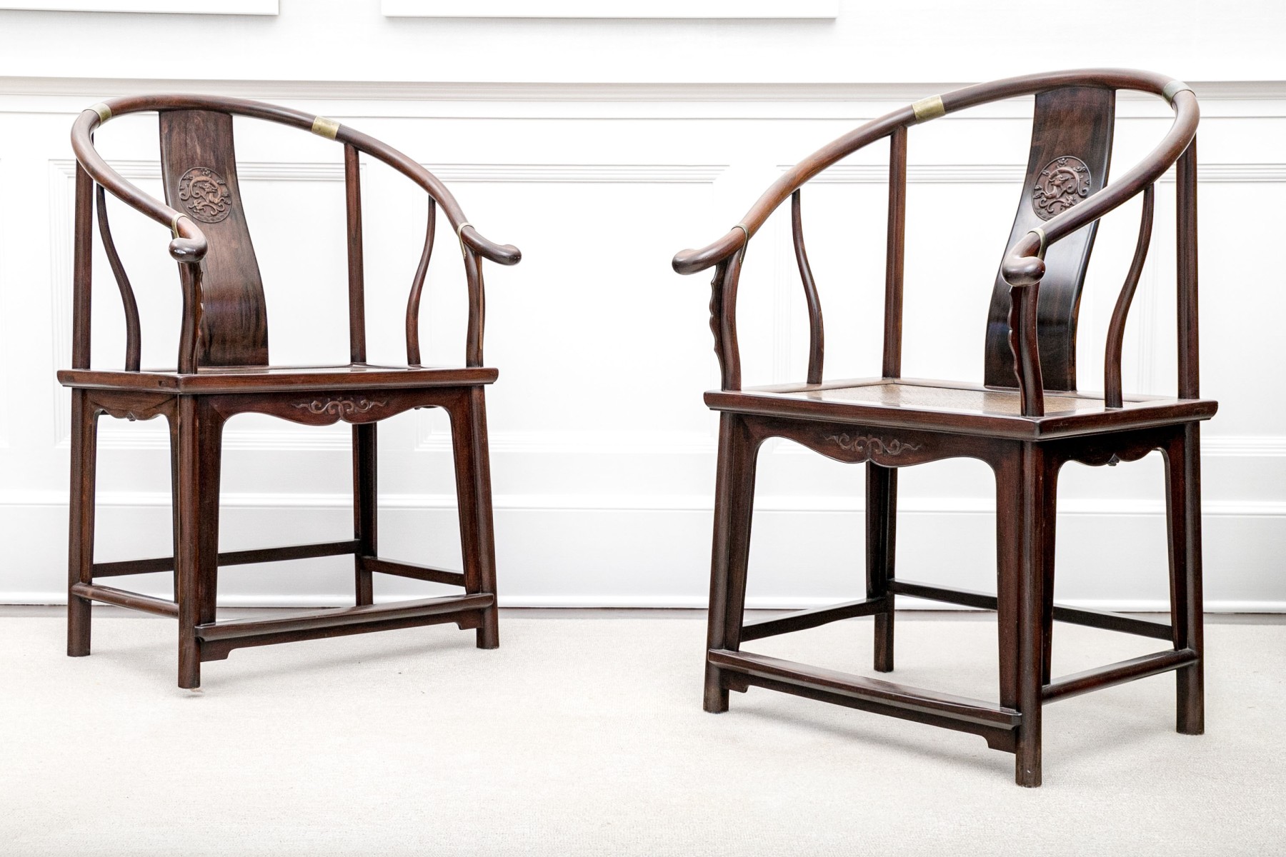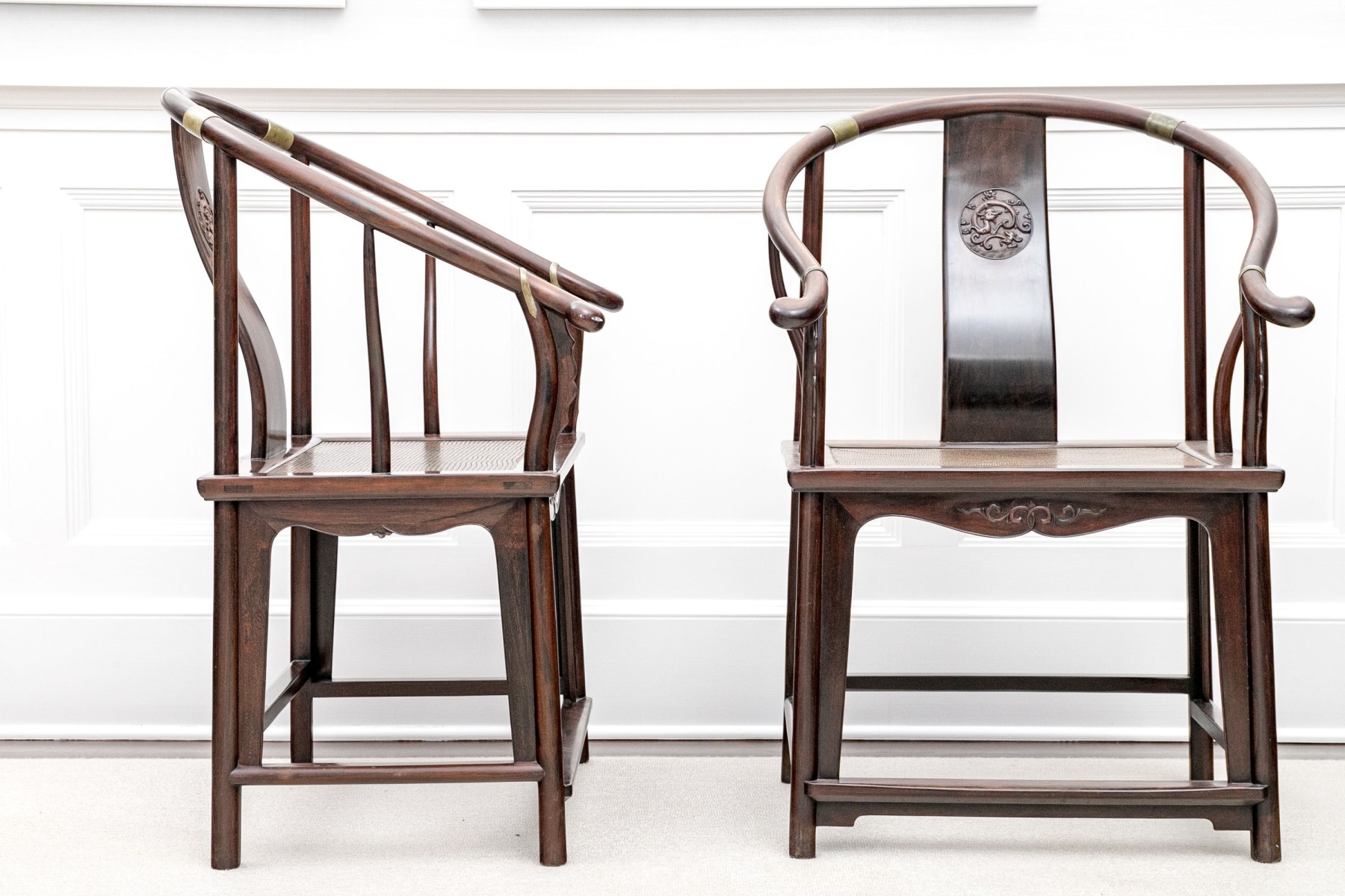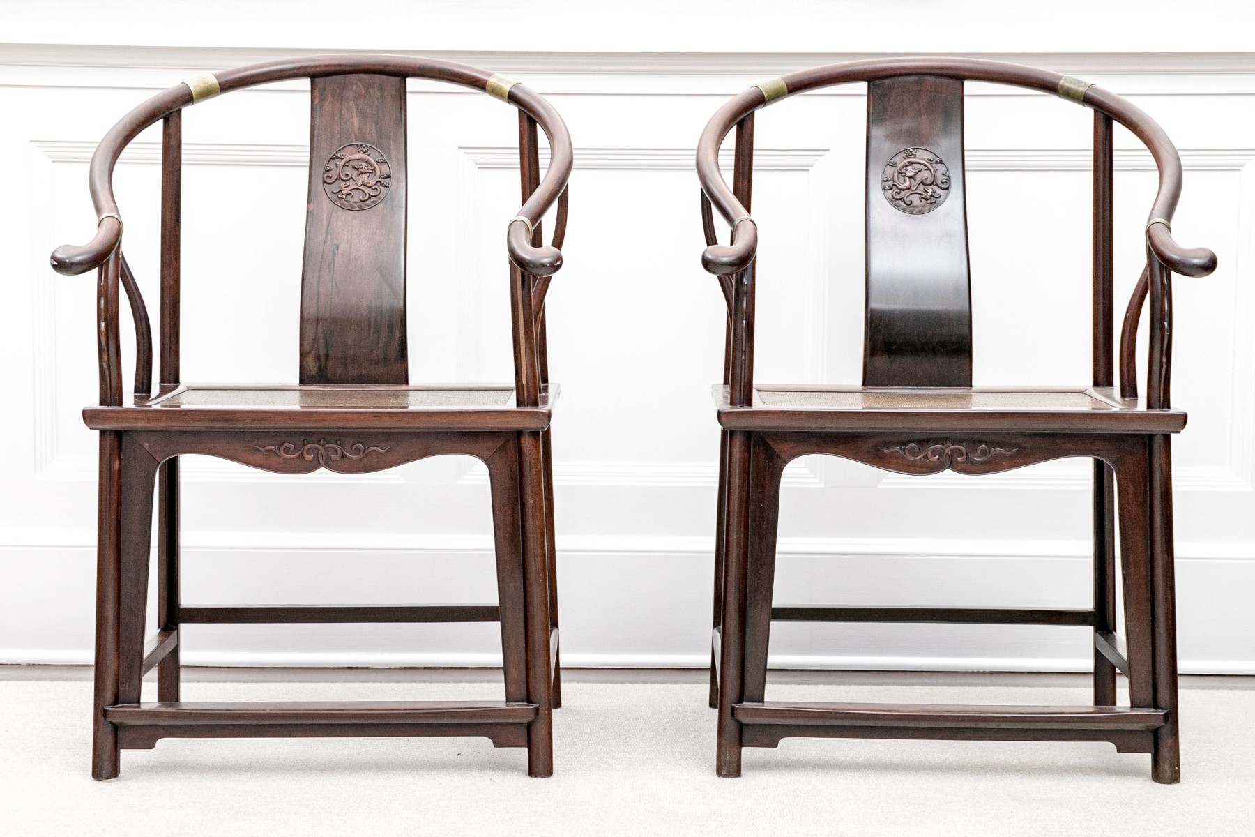 An excellent pair of Chinese armchairs in gorgeous deep brown wood with traditional horseshoe form, featuring high rounded back rails with flared ends and brass bands over elegantly curved splats detailed with circular carved medallions depicting dragons over waves and swirling clouds. Square rattan seats are raised over scalloped aprons with carved flourishes and unique dowel legs with straight accents extending down from the apron. Finished with box stretchers and stout foot rails at the fronts.