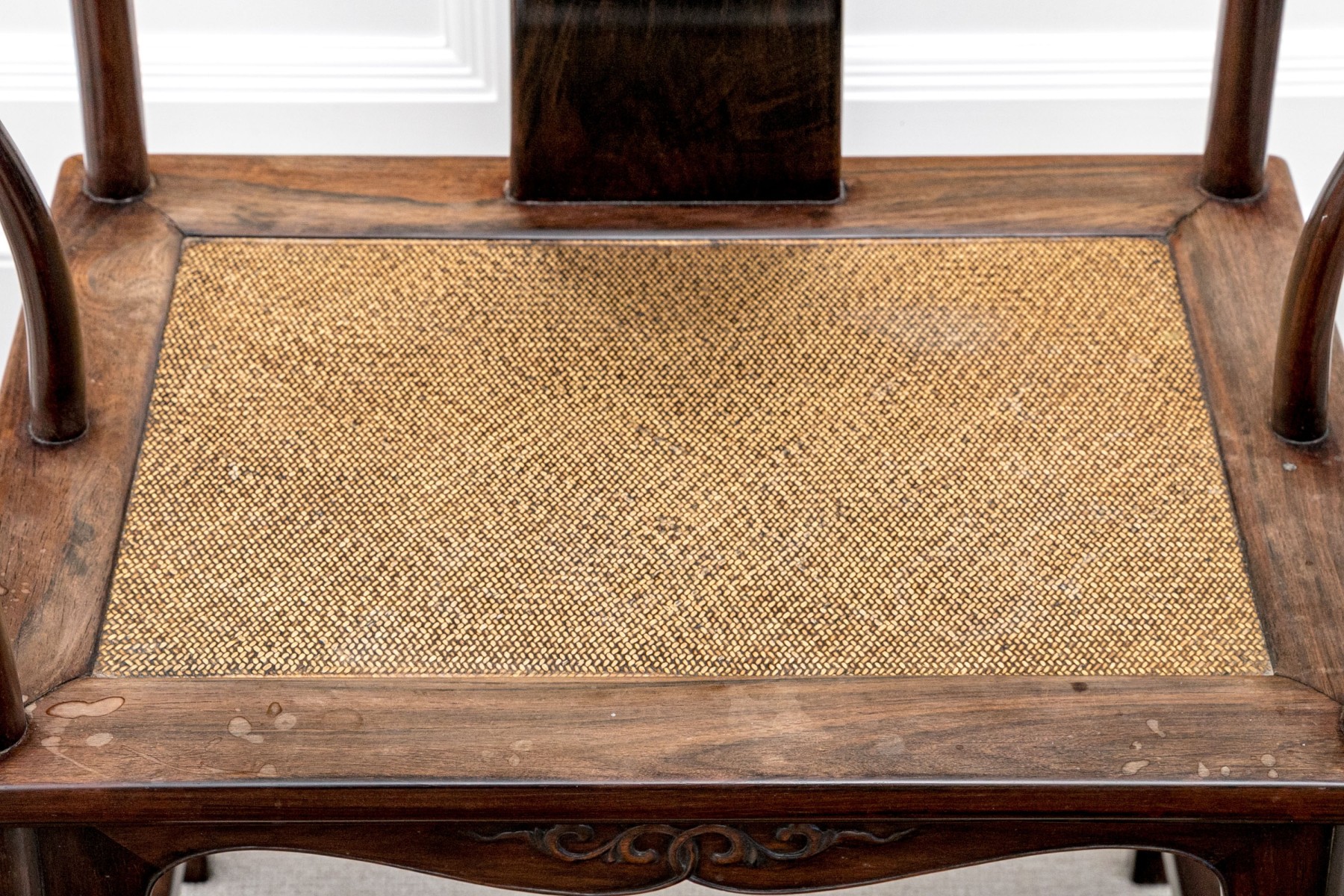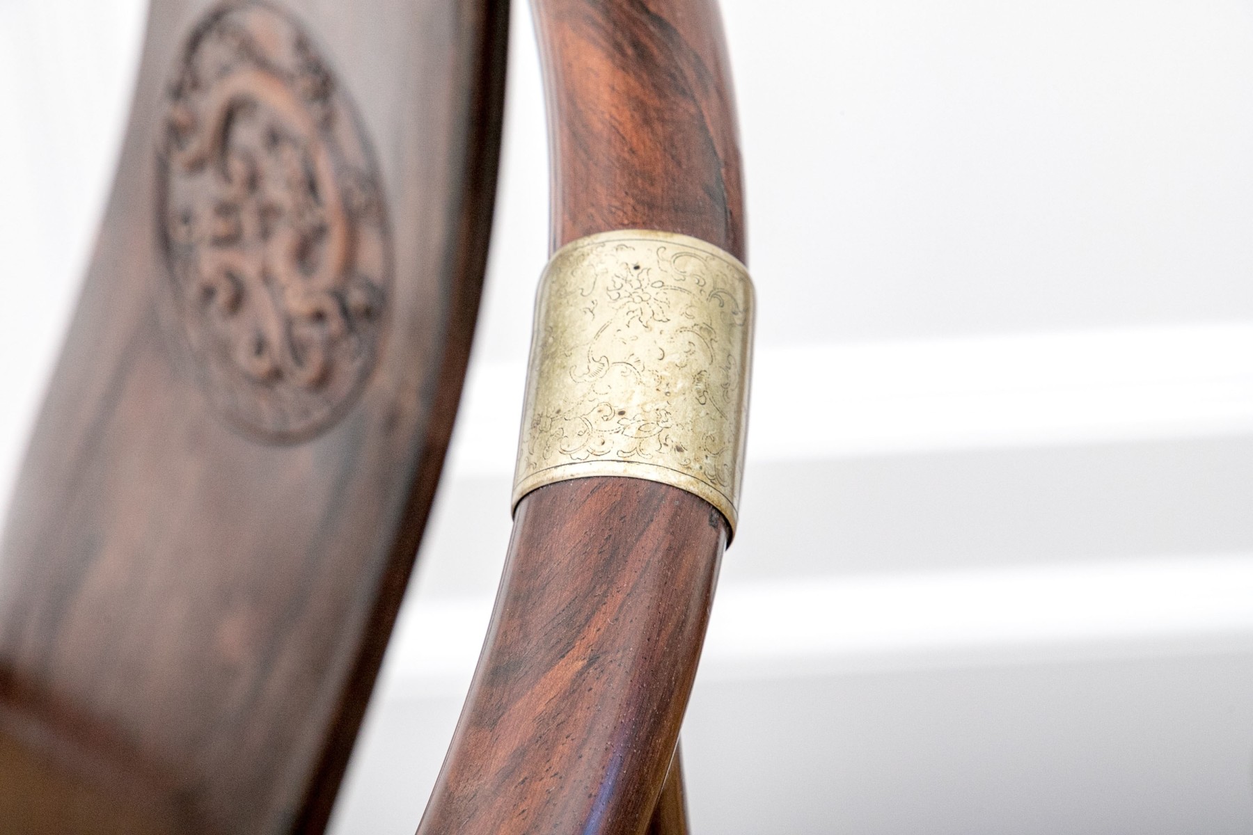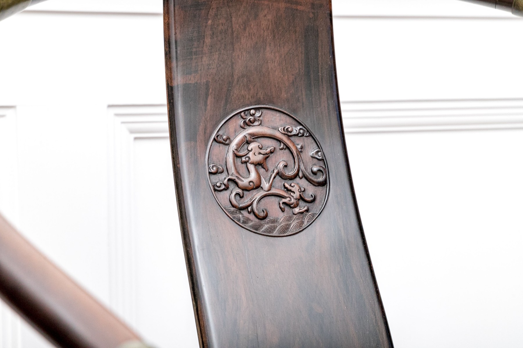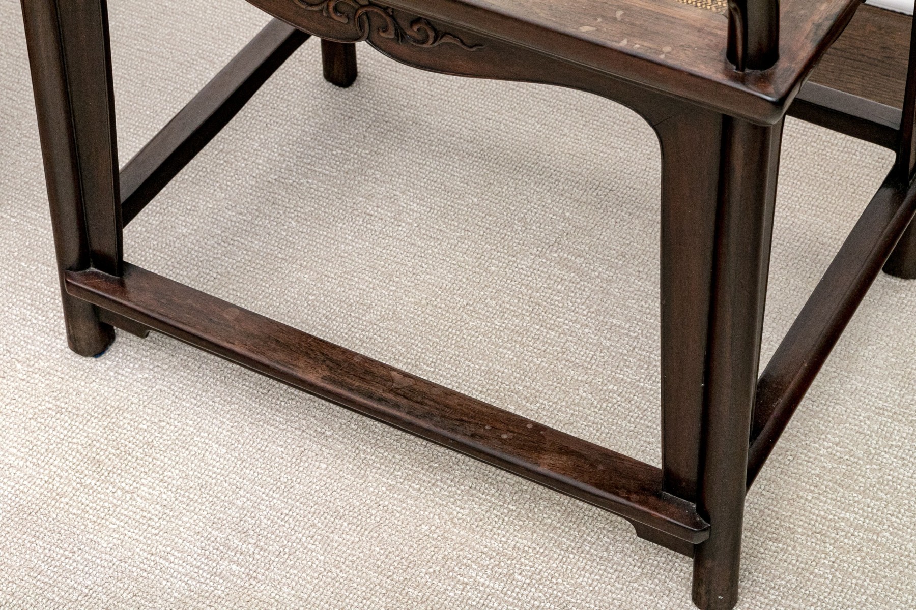 An excellent pair of Chinese armchairs in gorgeous deep brown wood with traditional horseshoe form, featuring high rounded back rails with flared ends and brass bands over elegantly curved splats detailed with circular carved medallions depicting dragons over waves and swirling clouds. Square rattan seats are raised over scalloped aprons with carved flourishes and unique dowel legs with straight accents extending down from the apron. Finished with box stretchers and stout foot rails at the fronts.