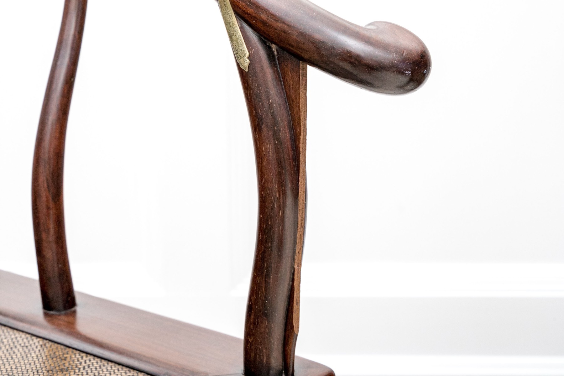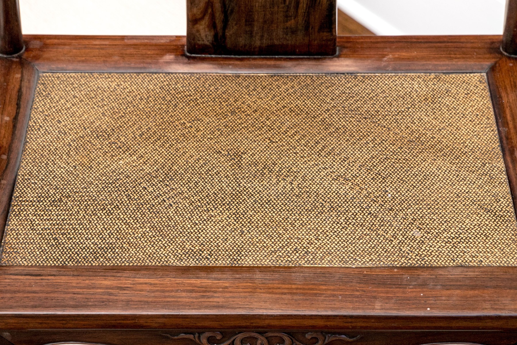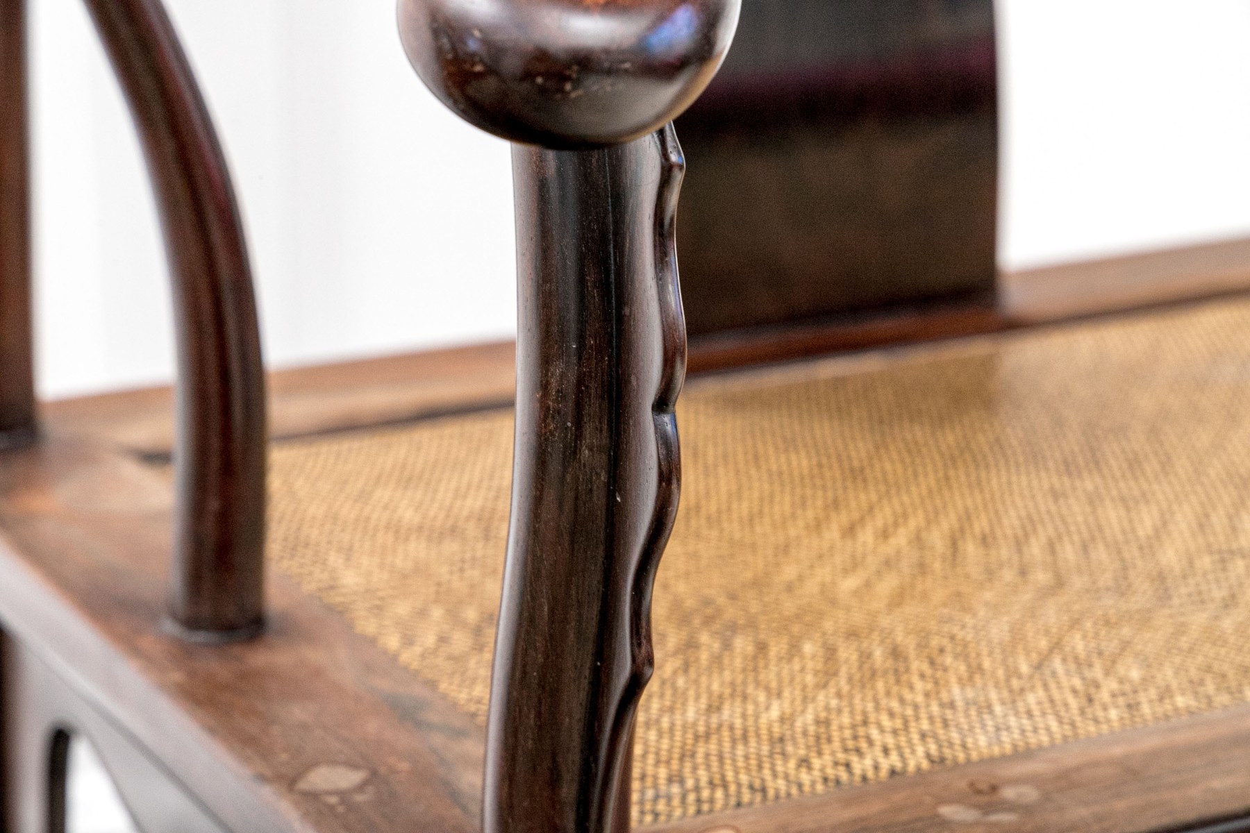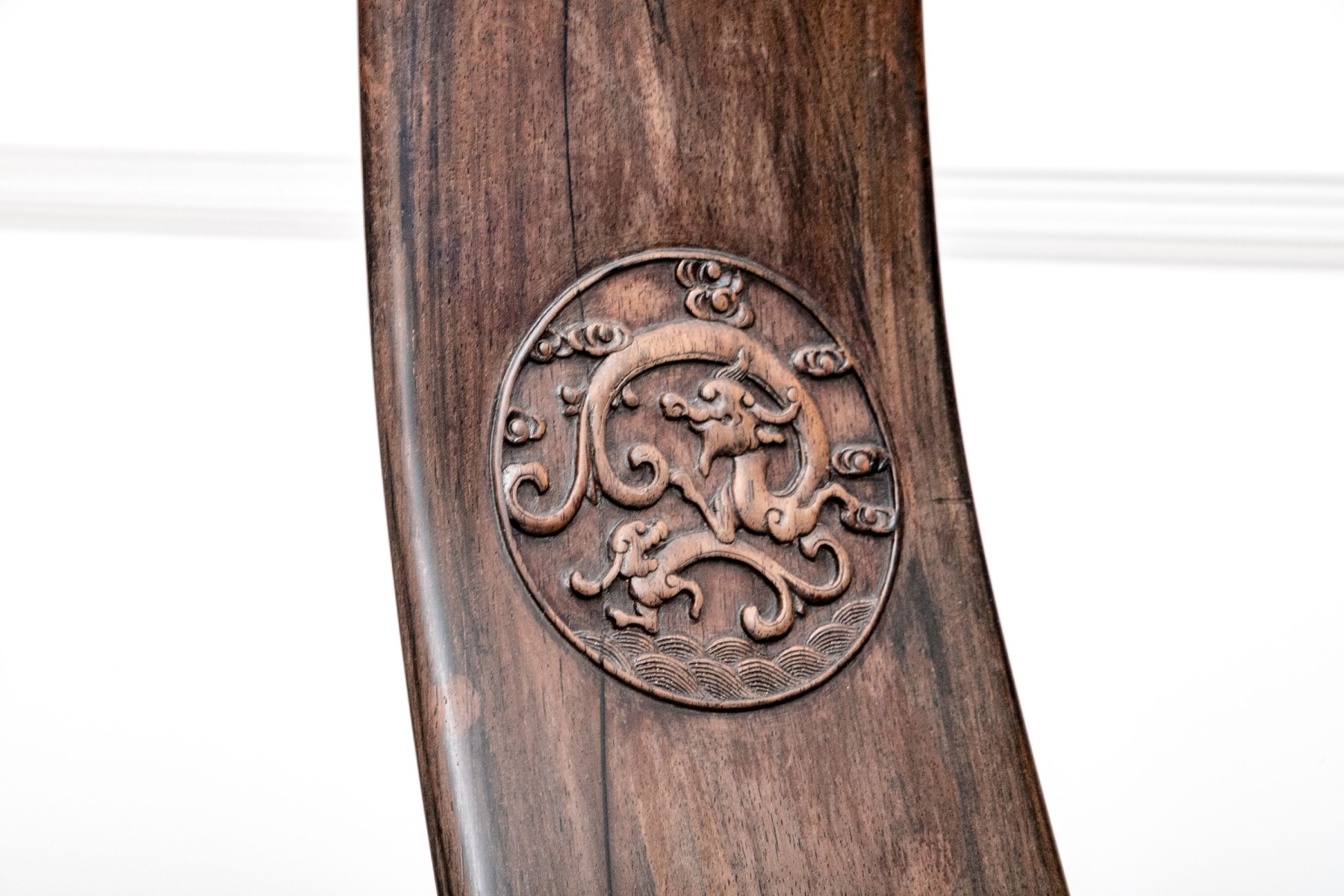 An excellent pair of Chinese armchairs in gorgeous deep brown wood with traditional horseshoe form, featuring high rounded back rails with flared ends and brass bands over elegantly curved splats detailed with circular carved medallions depicting dragons over waves and swirling clouds. Square rattan seats are raised over scalloped aprons with carved flourishes and unique dowel legs with straight accents extending down from the apron. Finished with box stretchers and stout foot rails at the fronts.