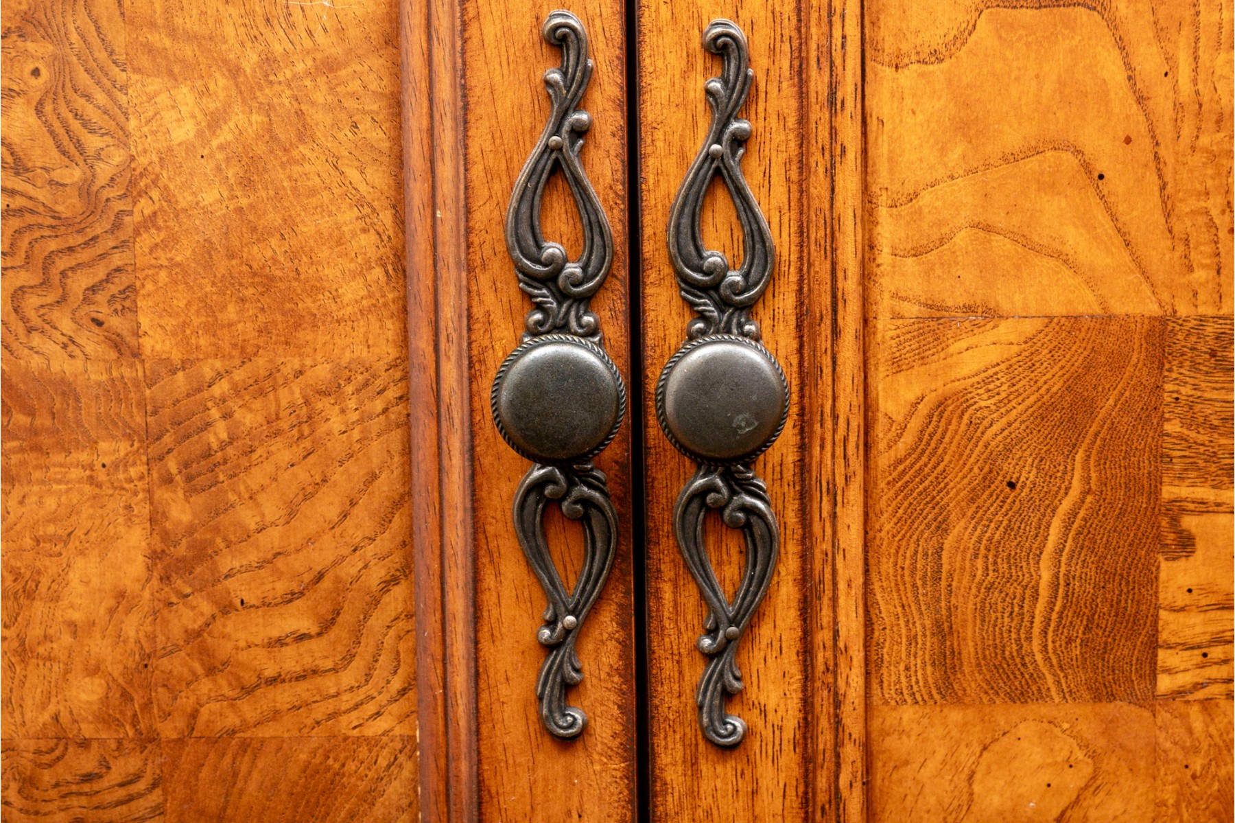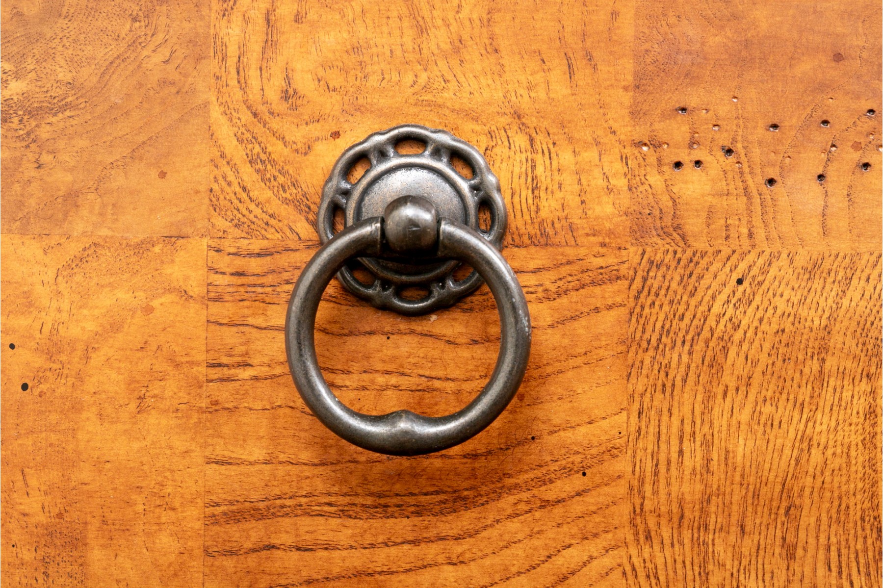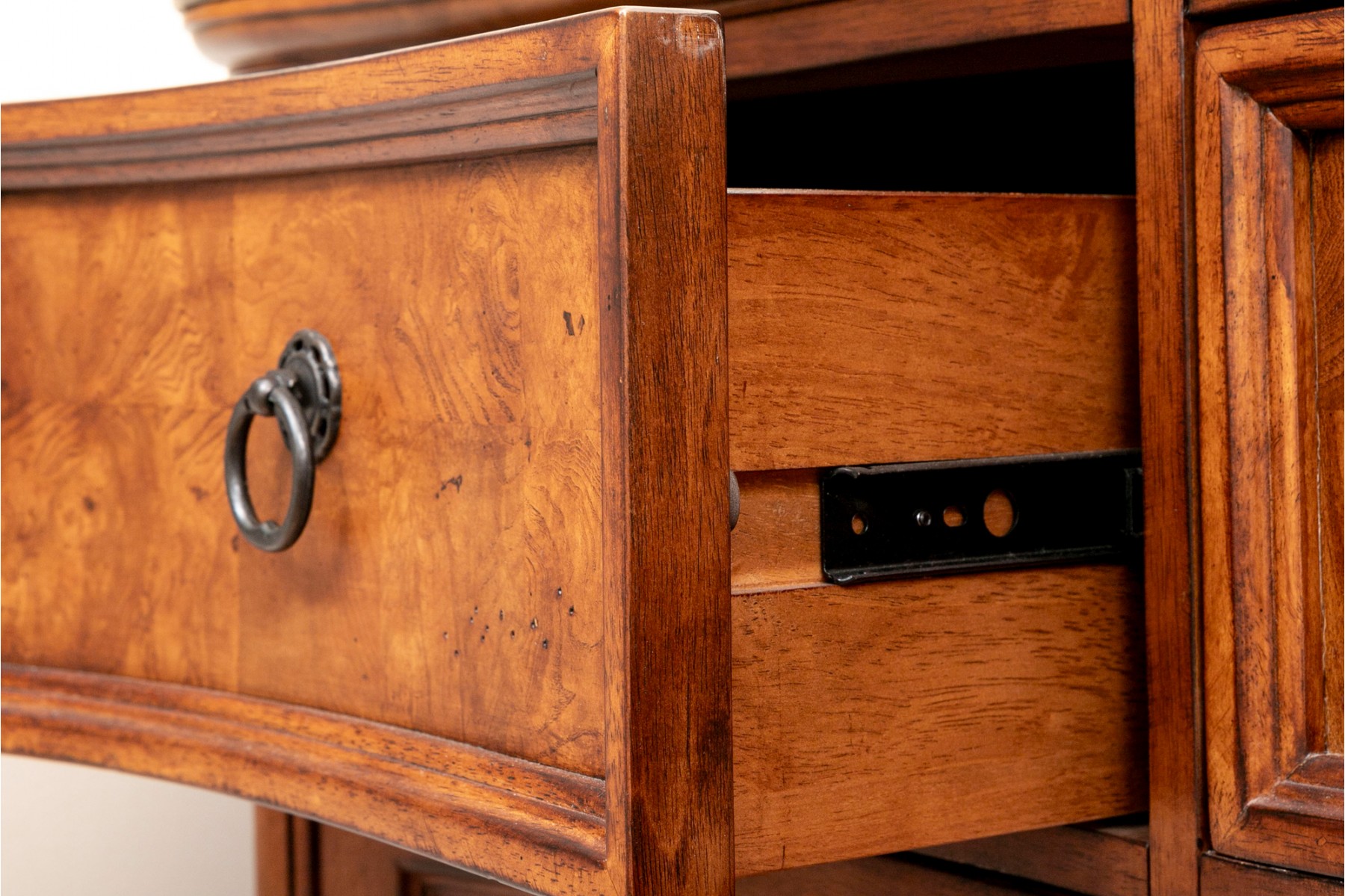 Above is a long drawer, flanked by two short drawers all with wonderfully cast hardware.