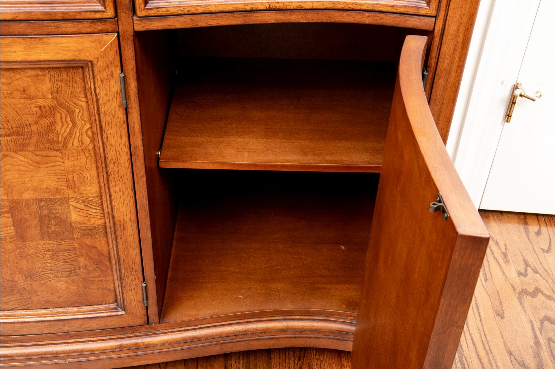 Raised on four bun form feet, the case features four cabinet doors which open to reveal a larger shelved space behind the central two doors which is flanked on either side by a cabinet door opening to reveal further concealed, shelved storage.